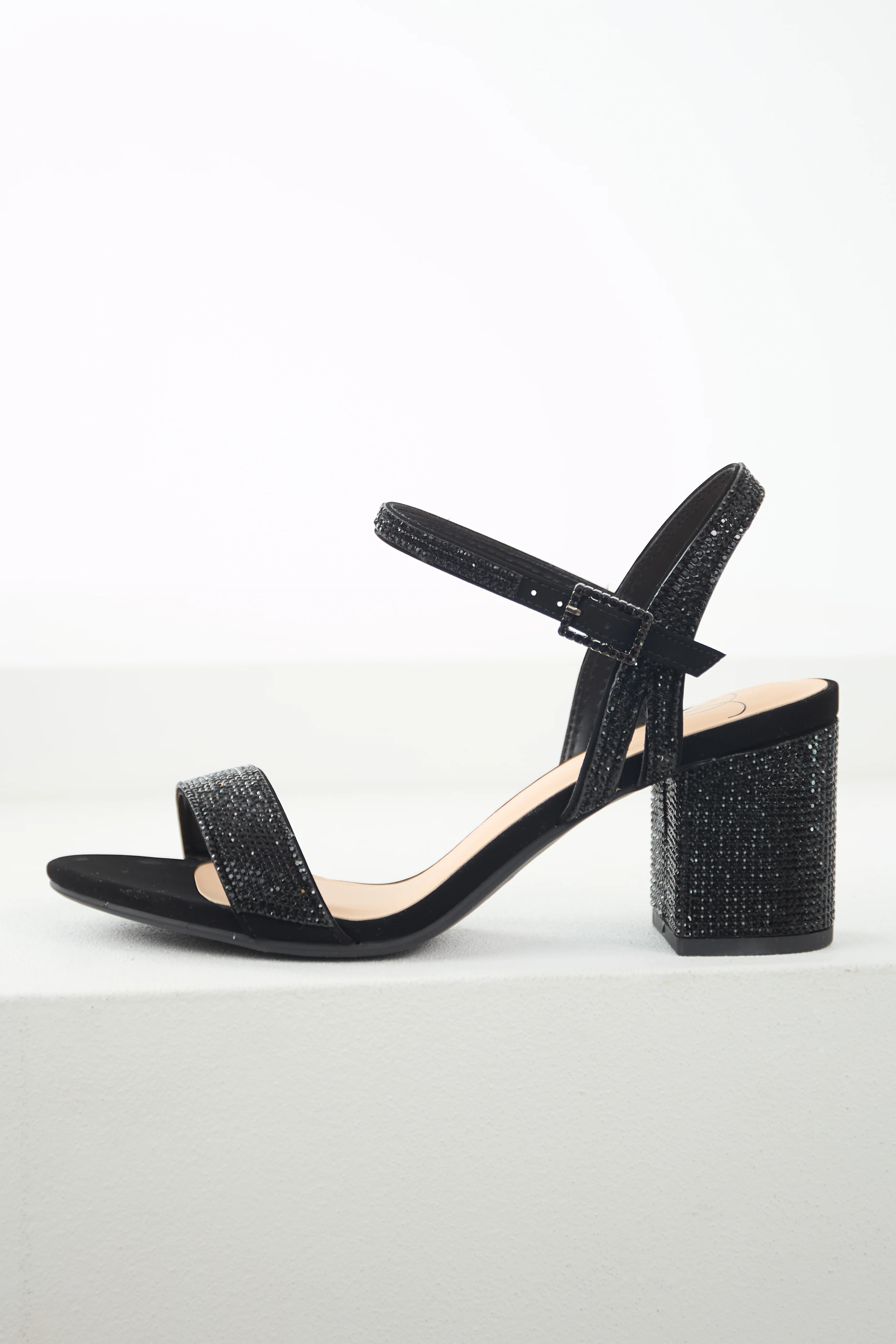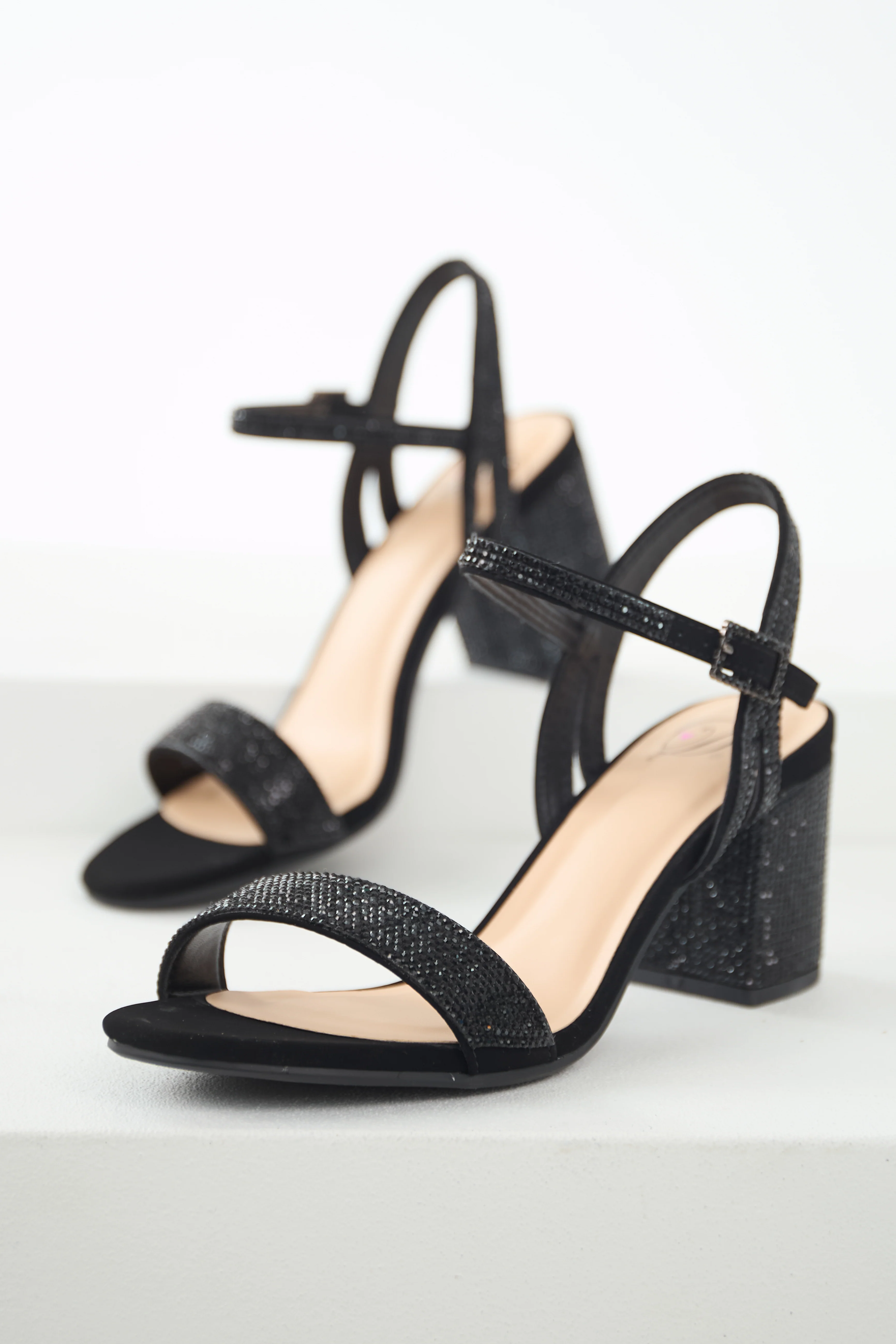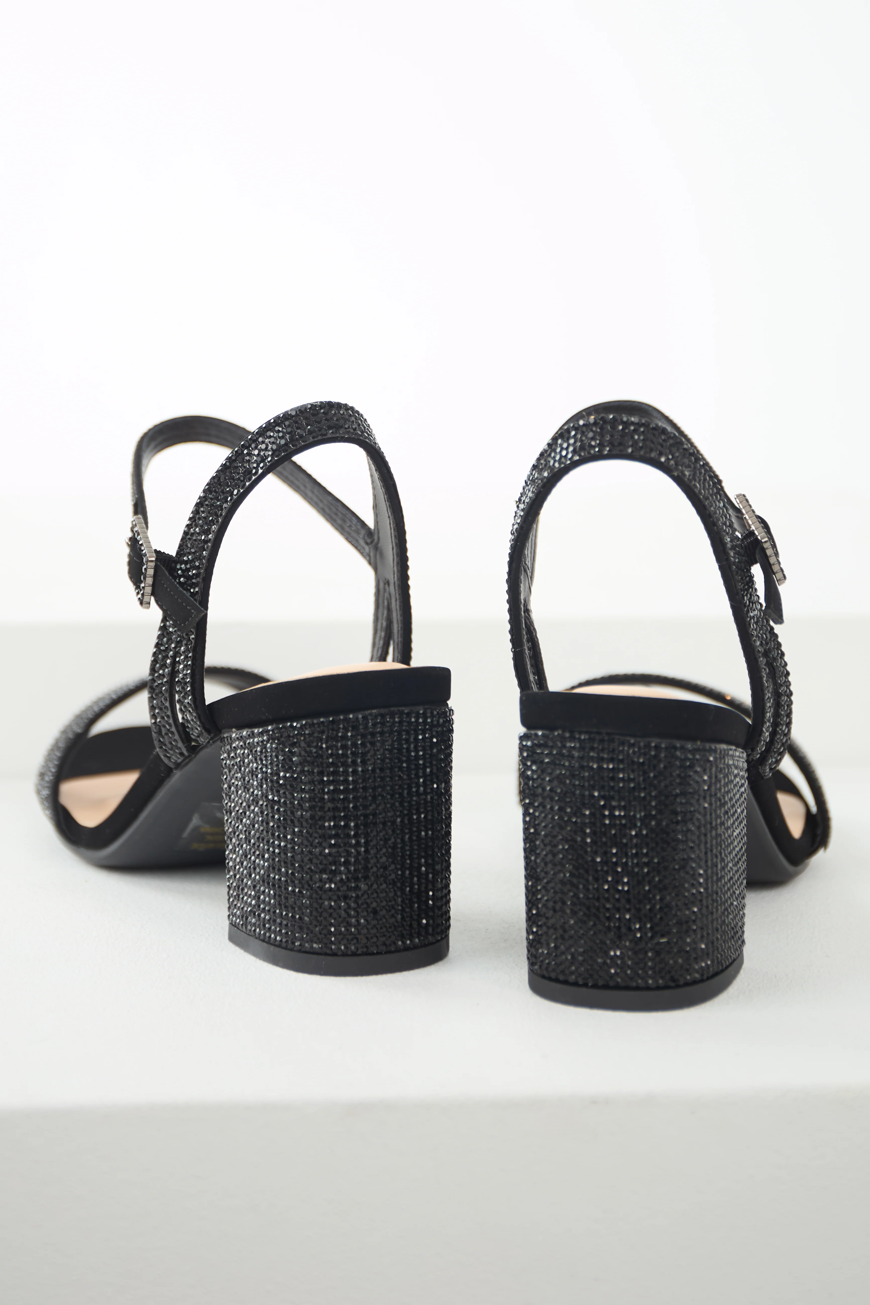 Black Rhinestone Strap Block Heel Sandals