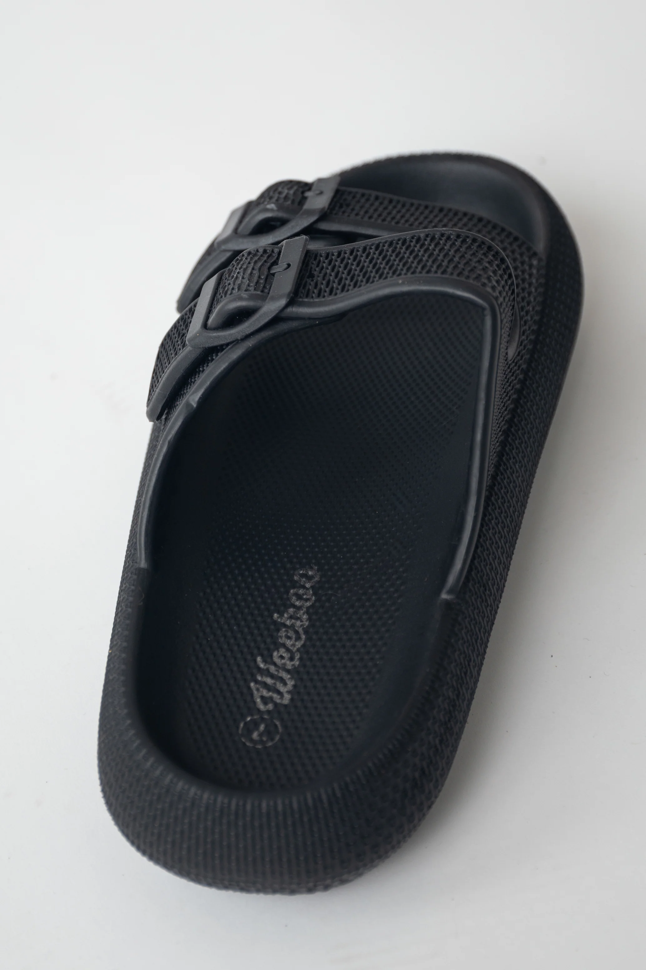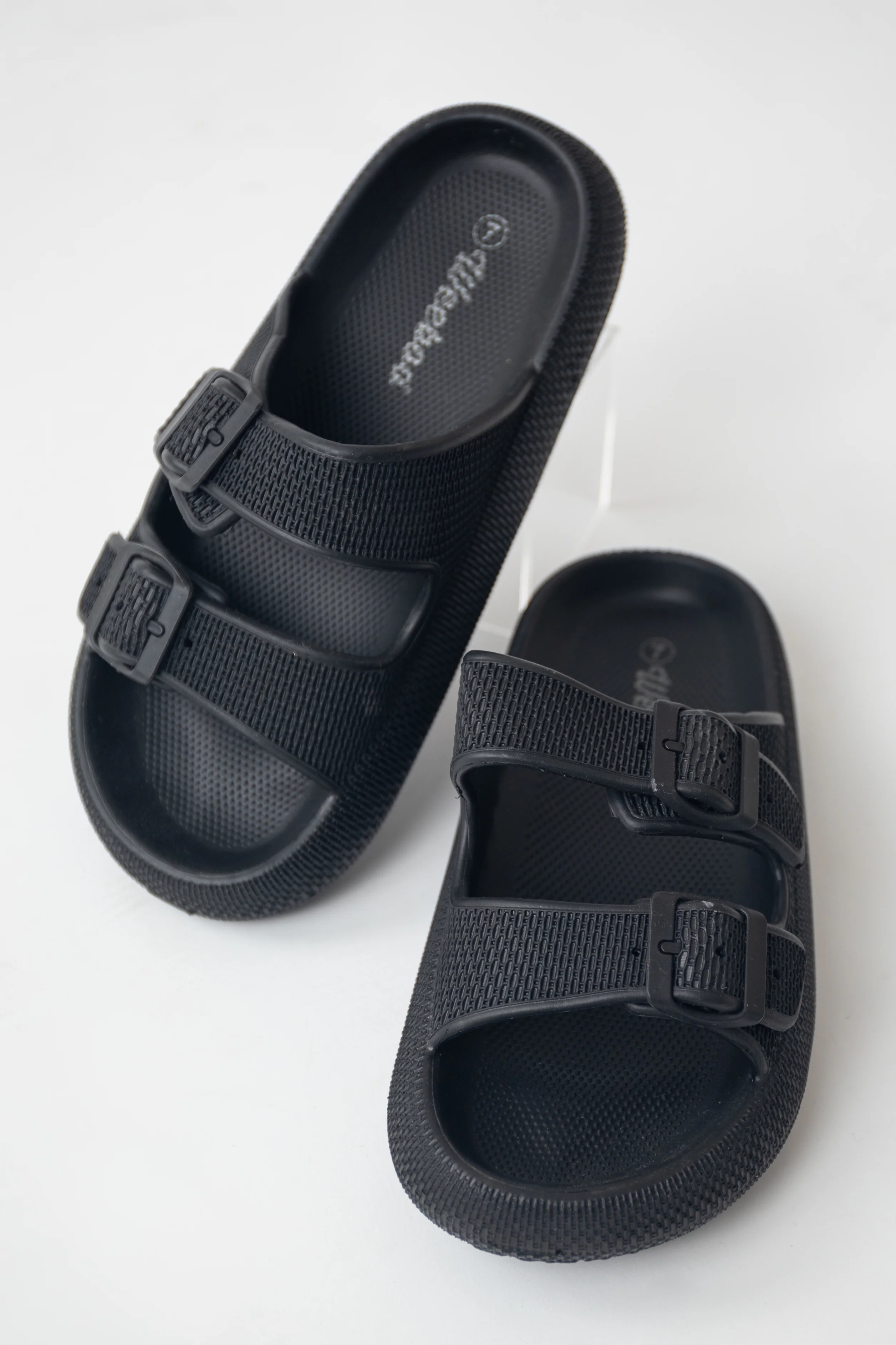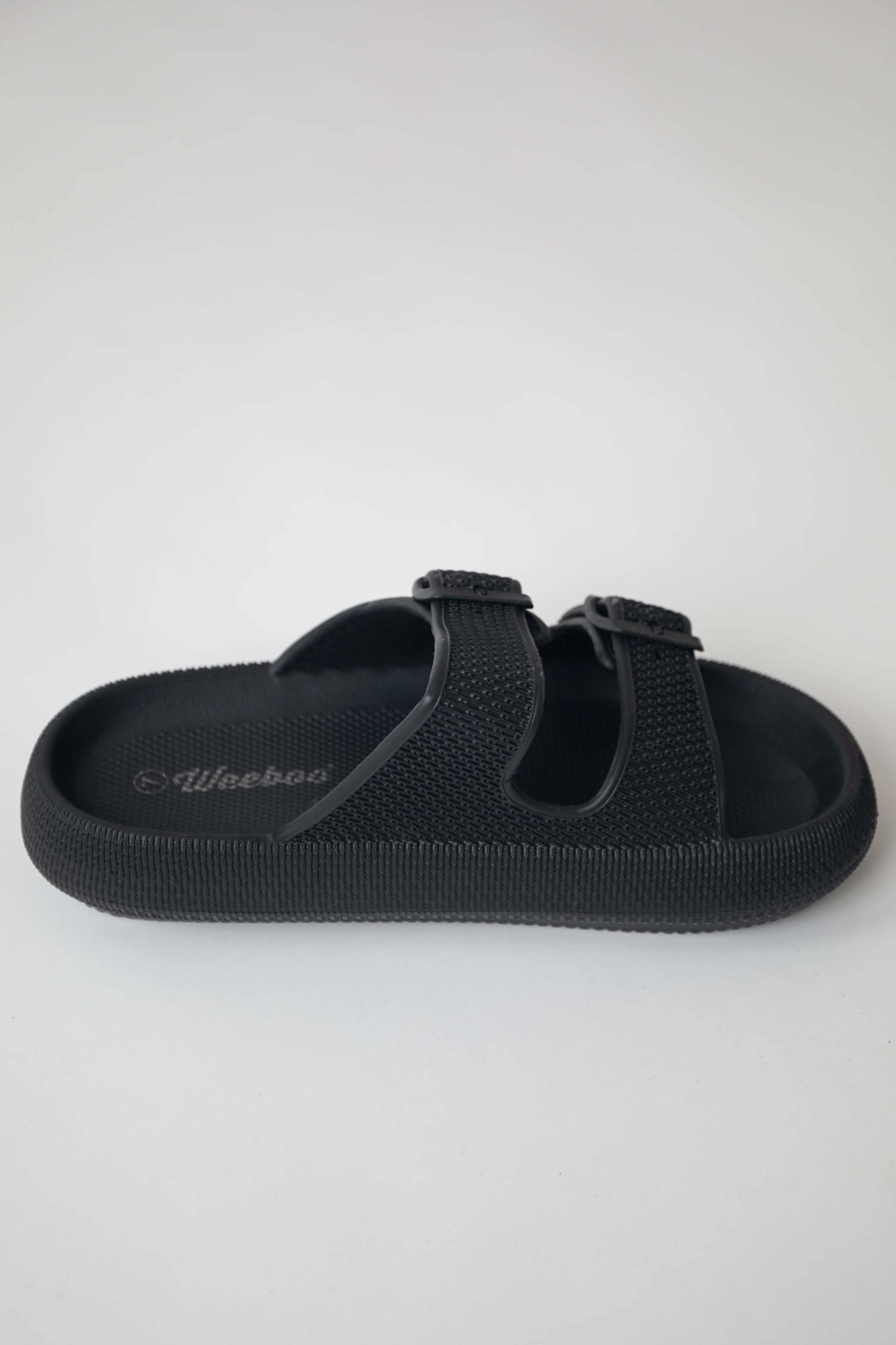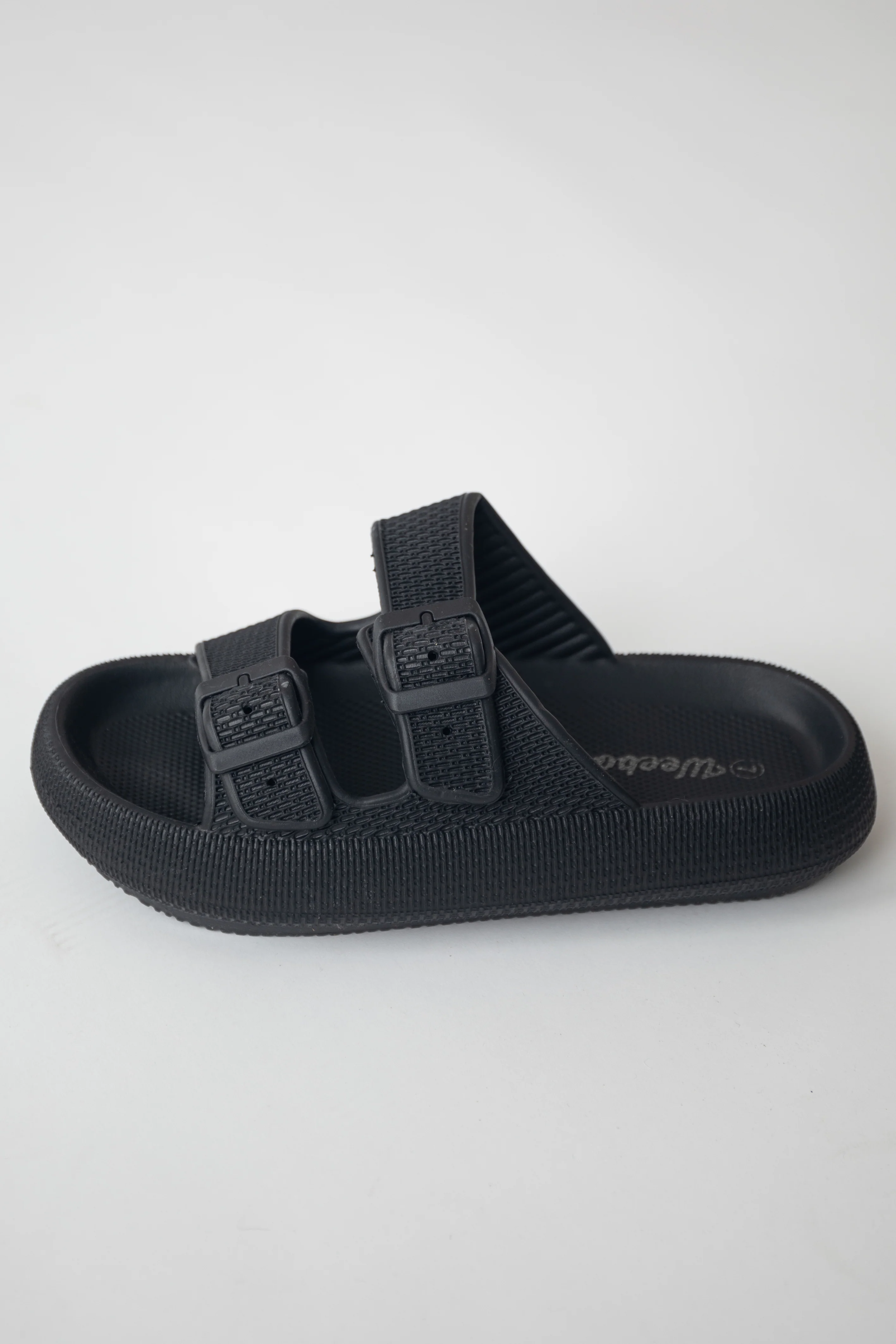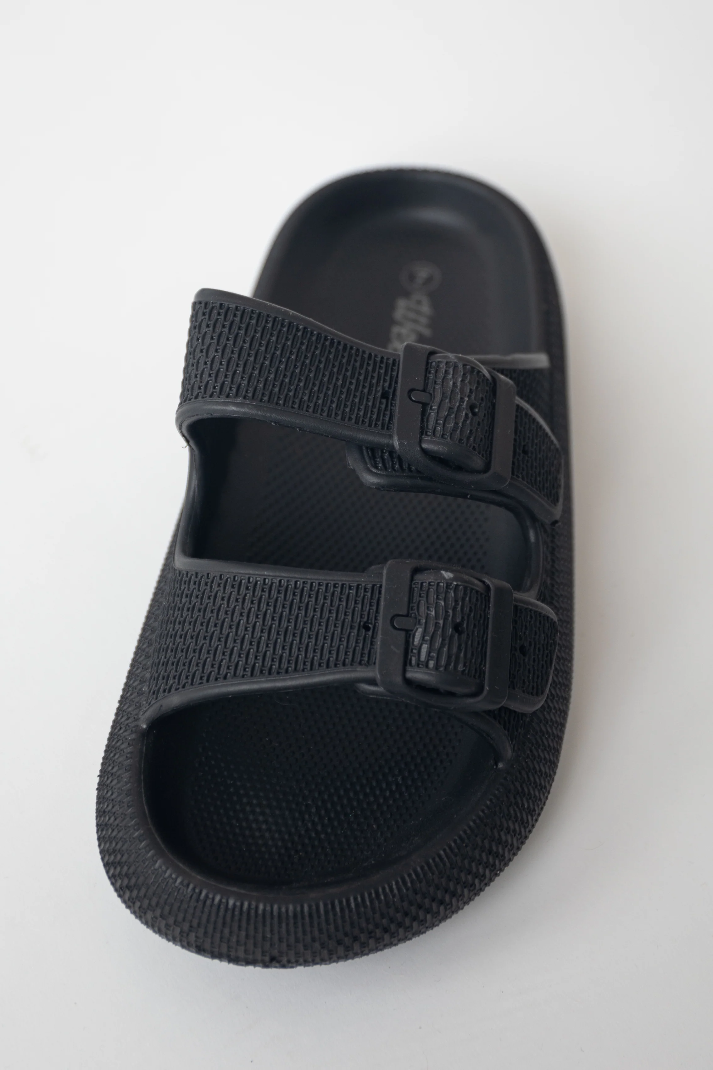 Black Textured Double Strap Slip On Sandals