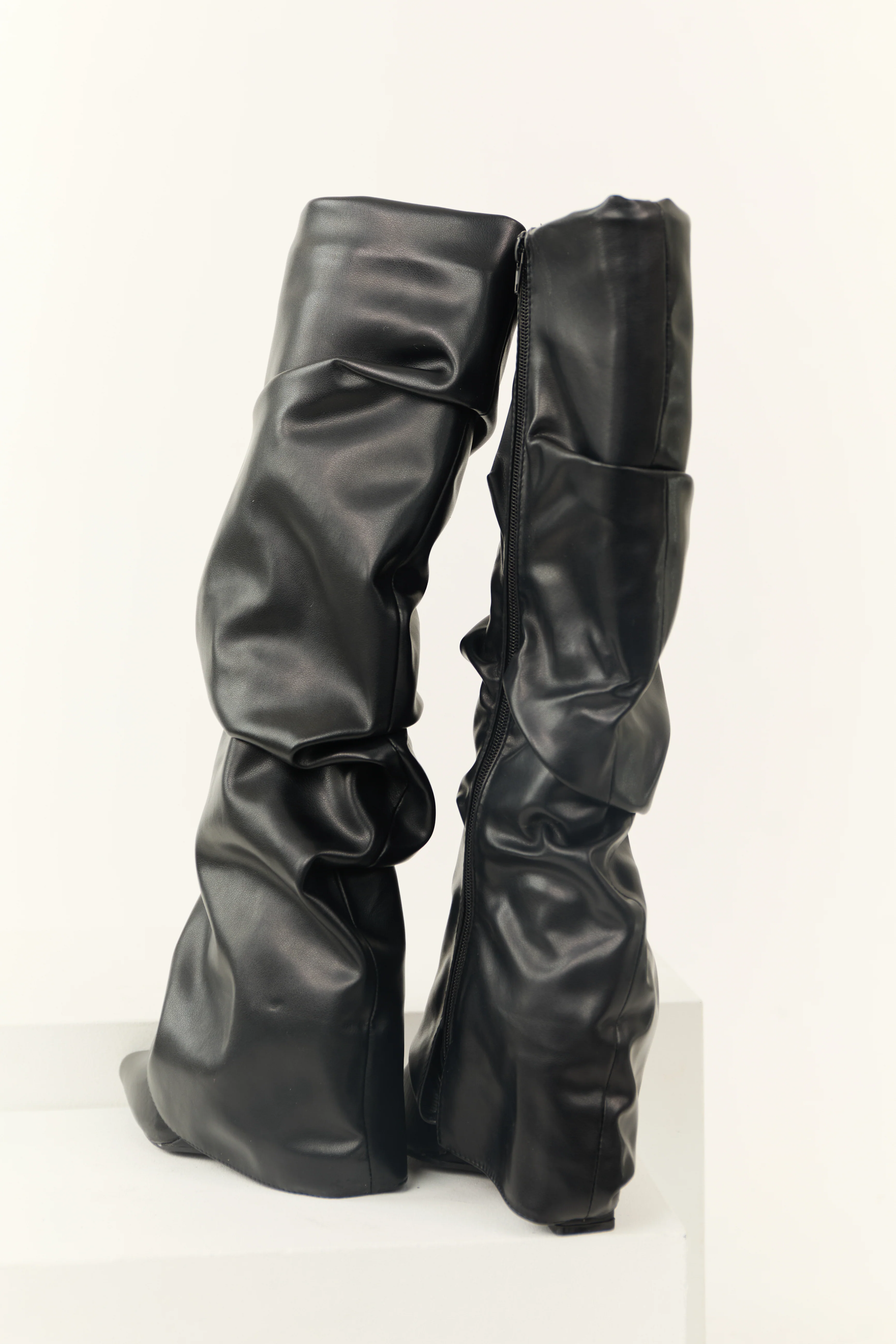 Black Faux Leather Slouchy Knee High Boots