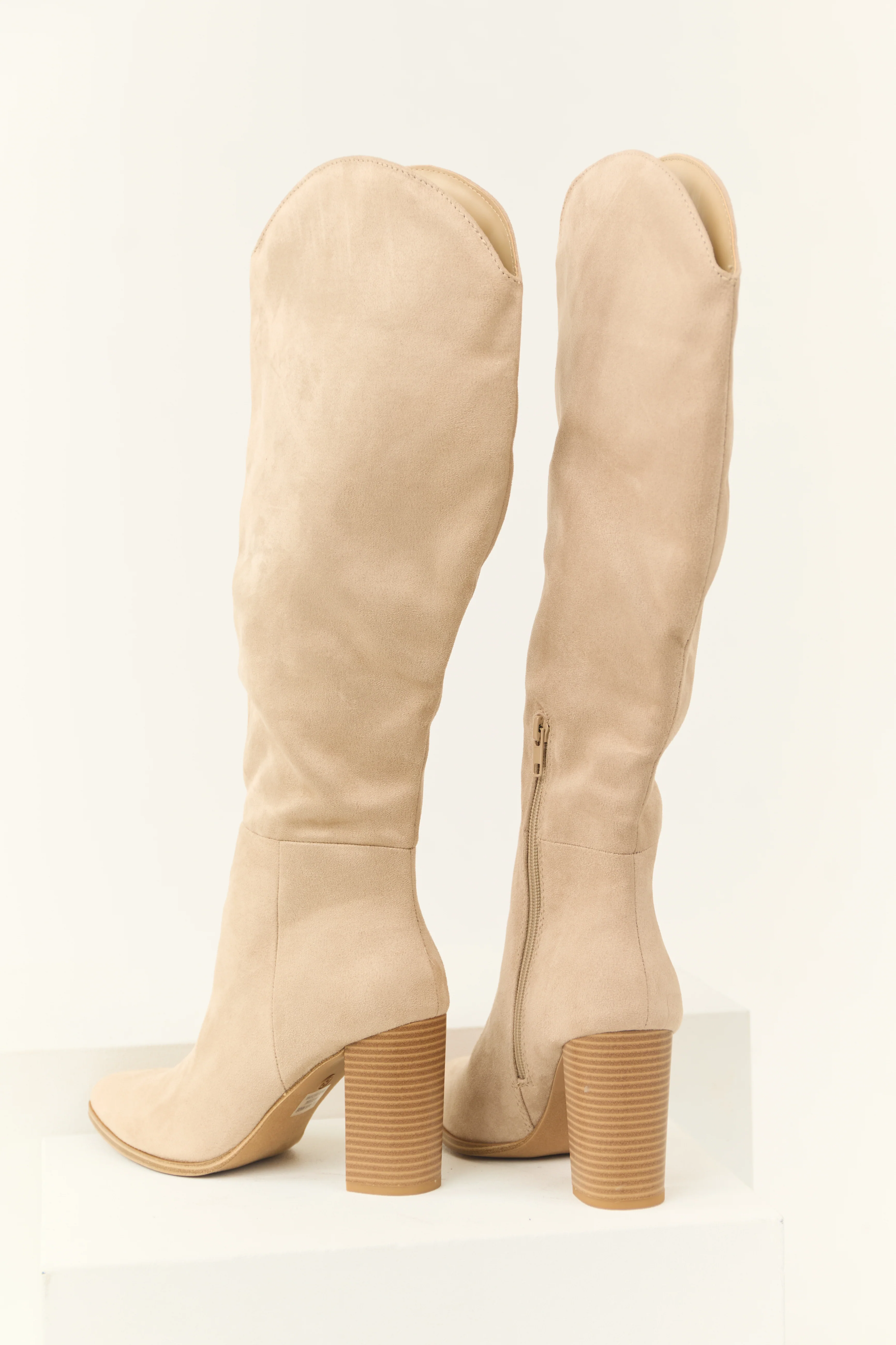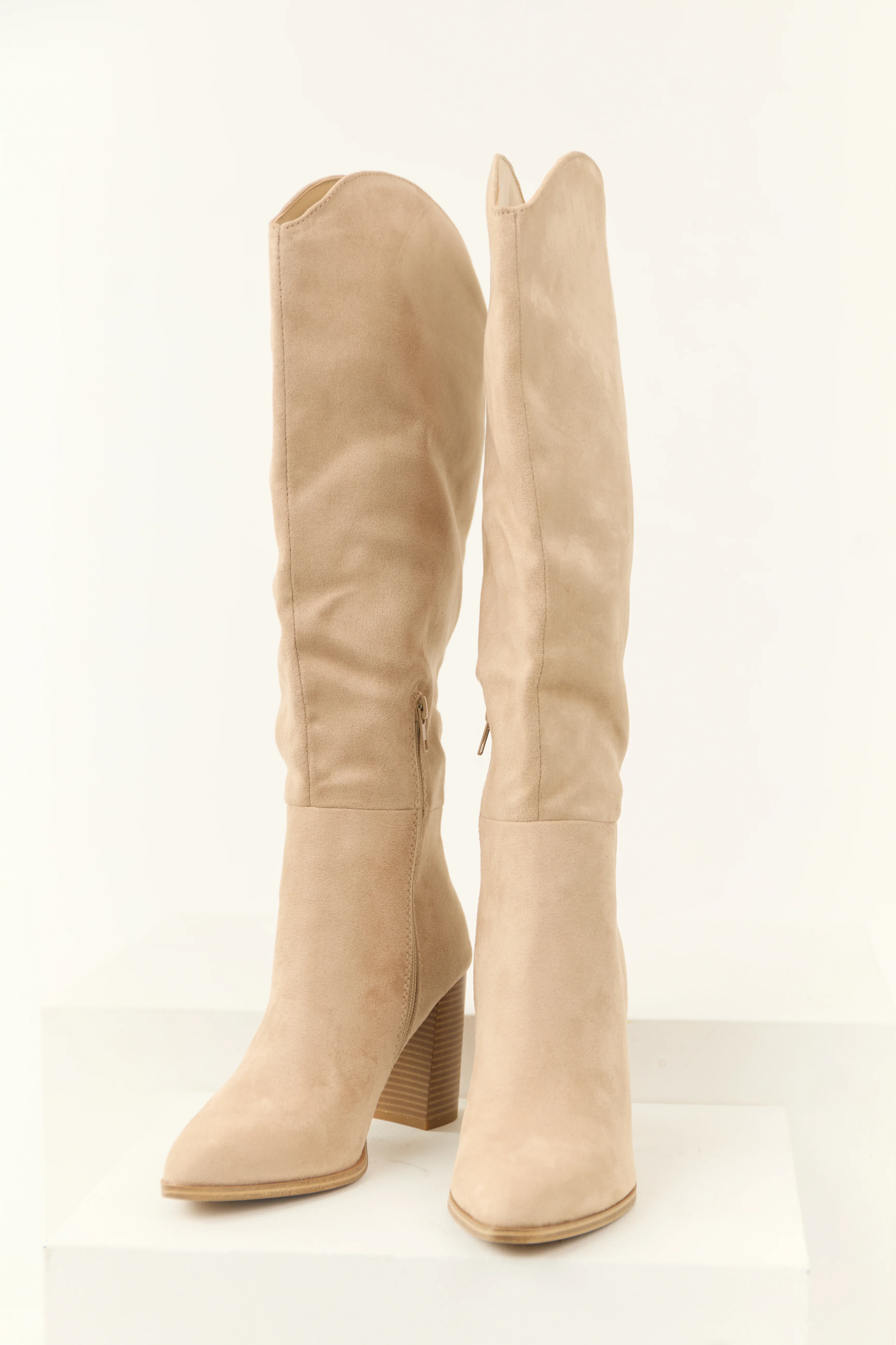 Oatmeal Faux Suede Block Heel Tall Boots