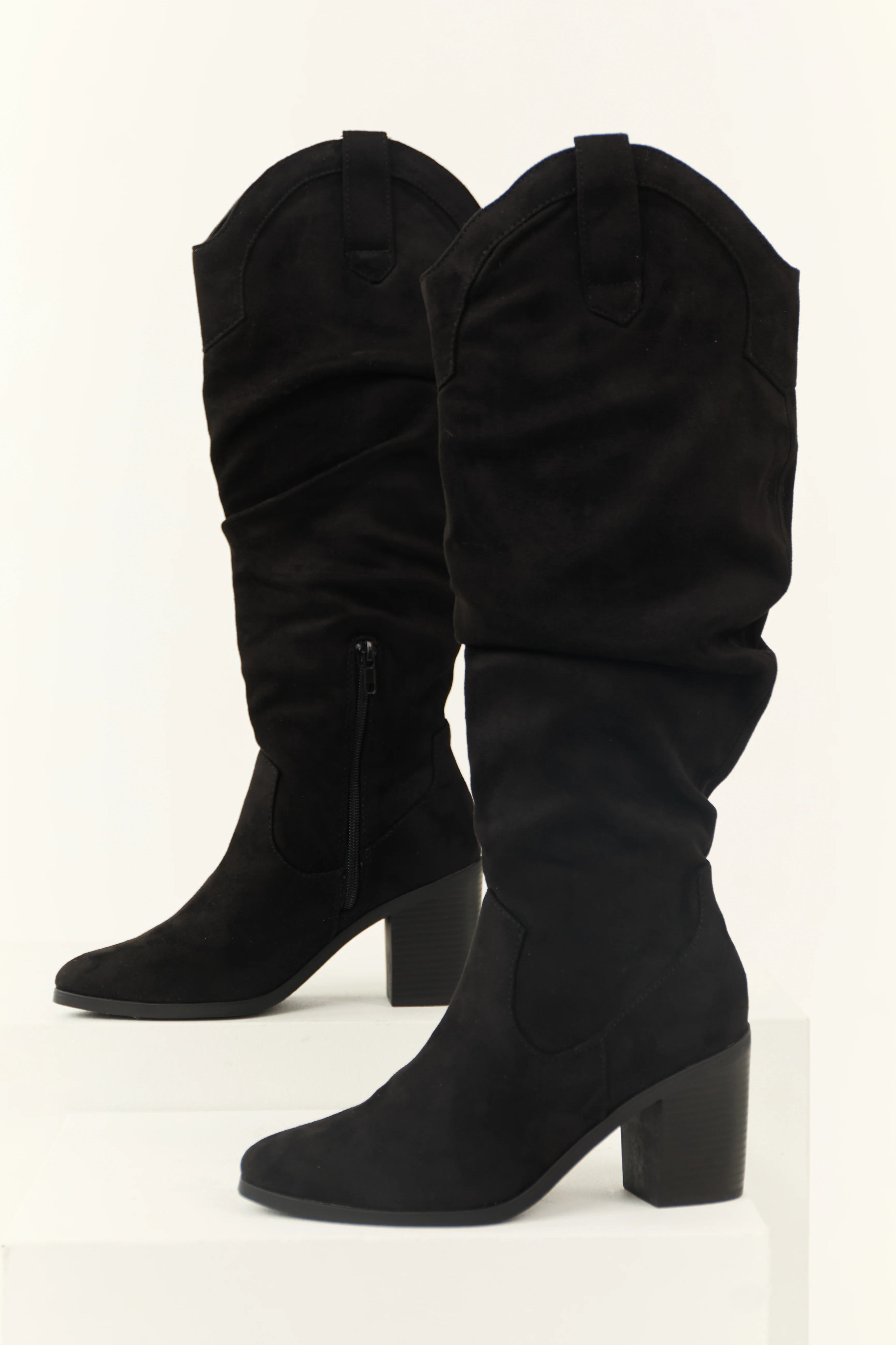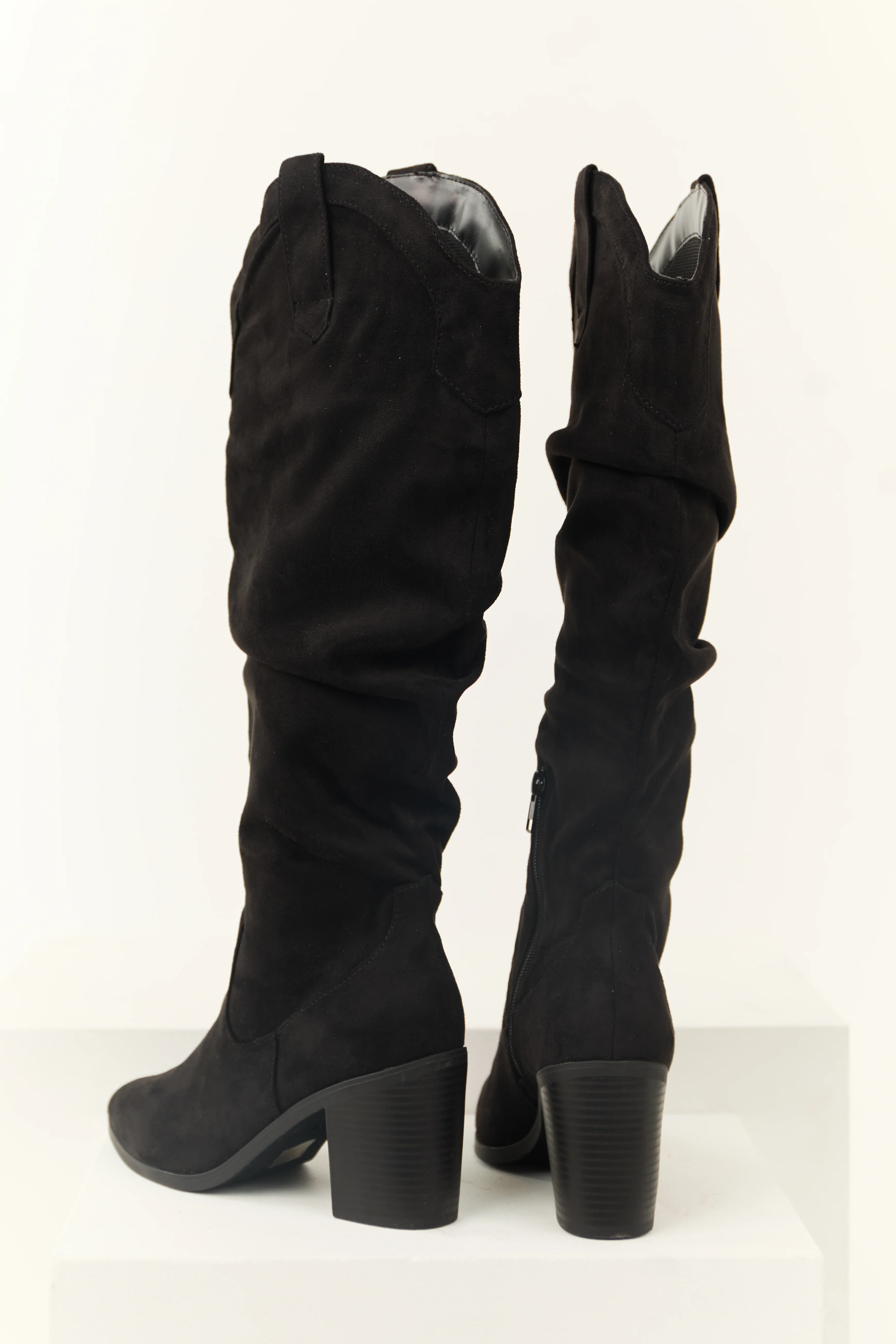 Black Faux Suede Slouchy Knee High Heeled Boots
