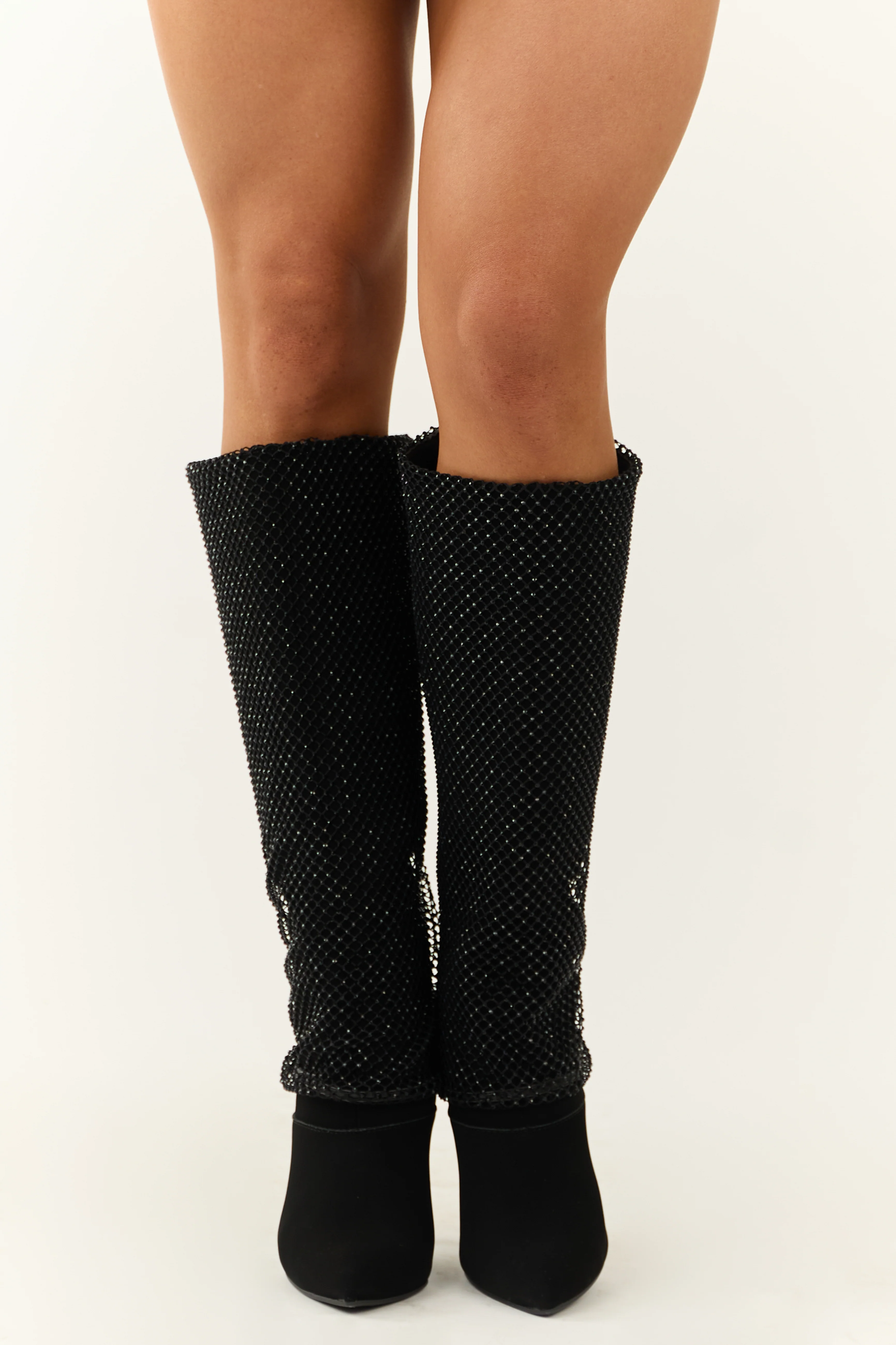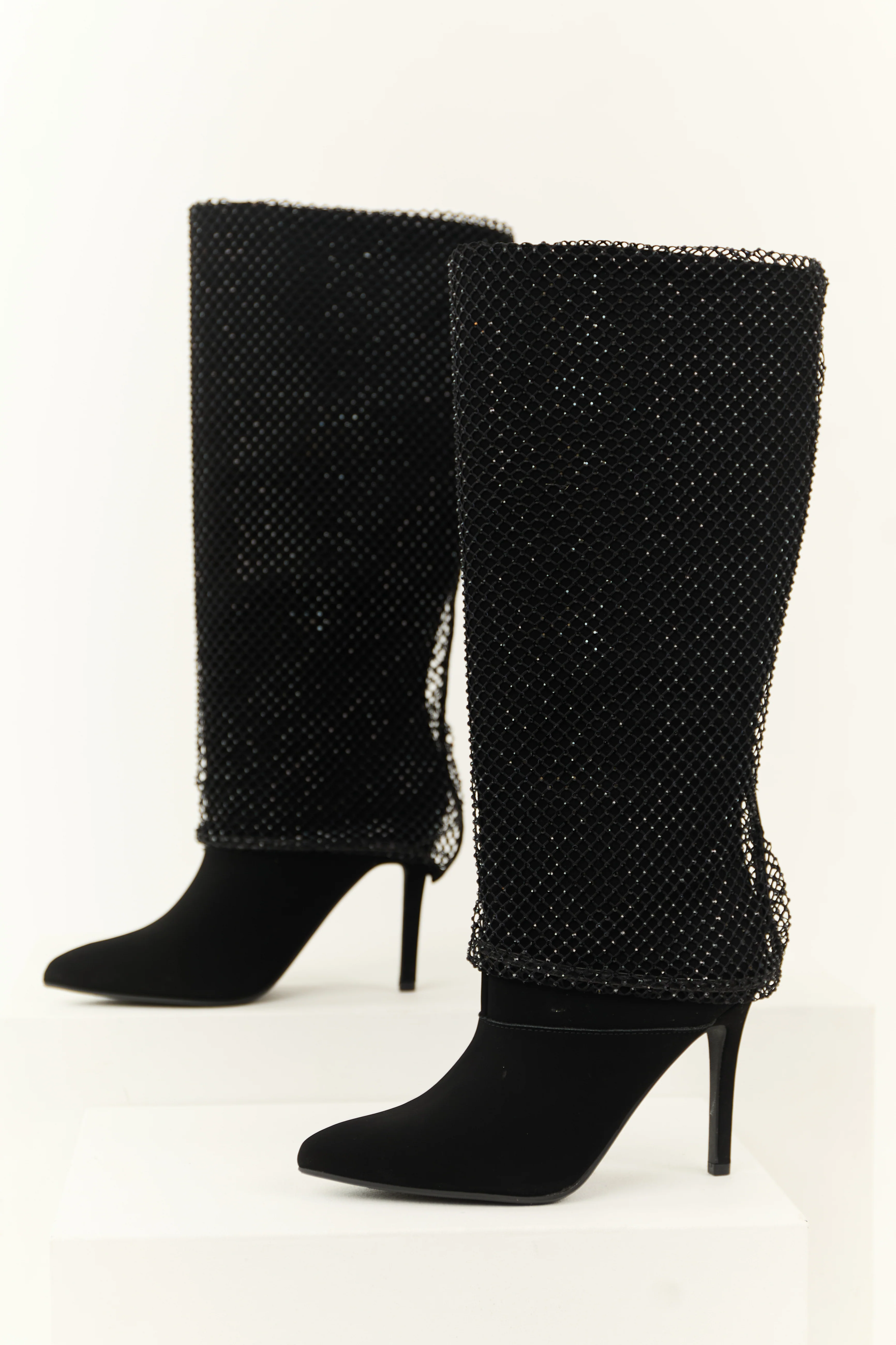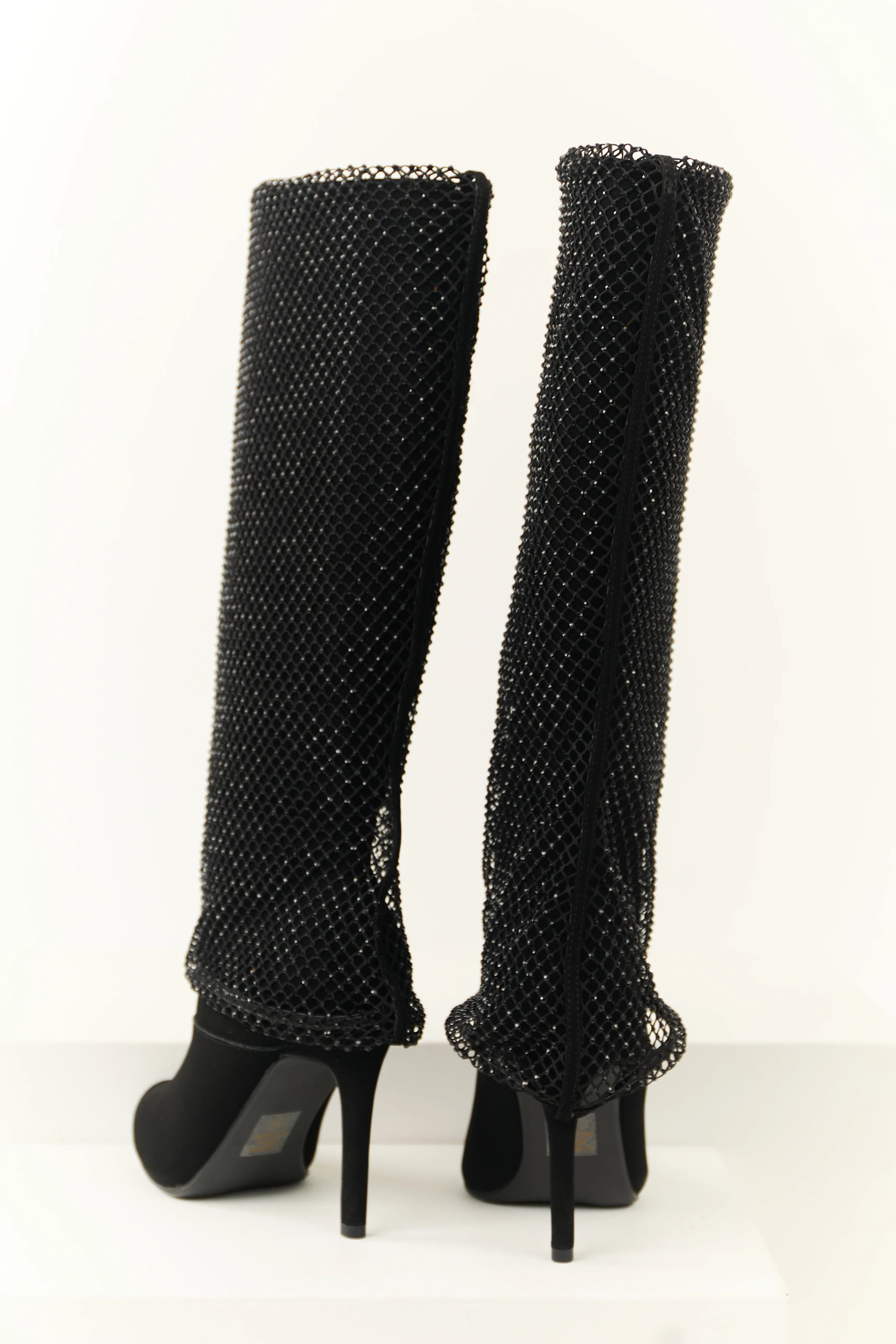 Black Mesh Overlay Stiletto Knee High Boots