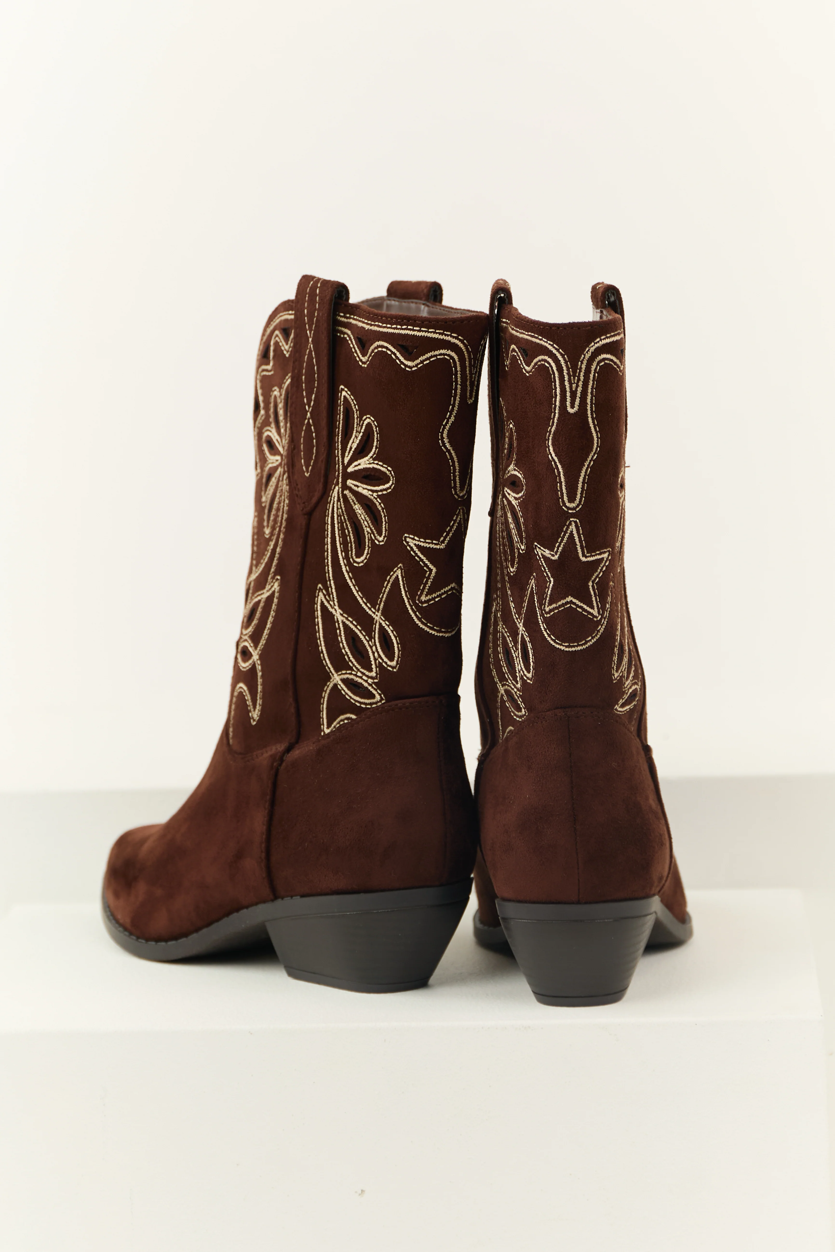 Chocolate Faux Suede Mid Calf Embroidered Boots