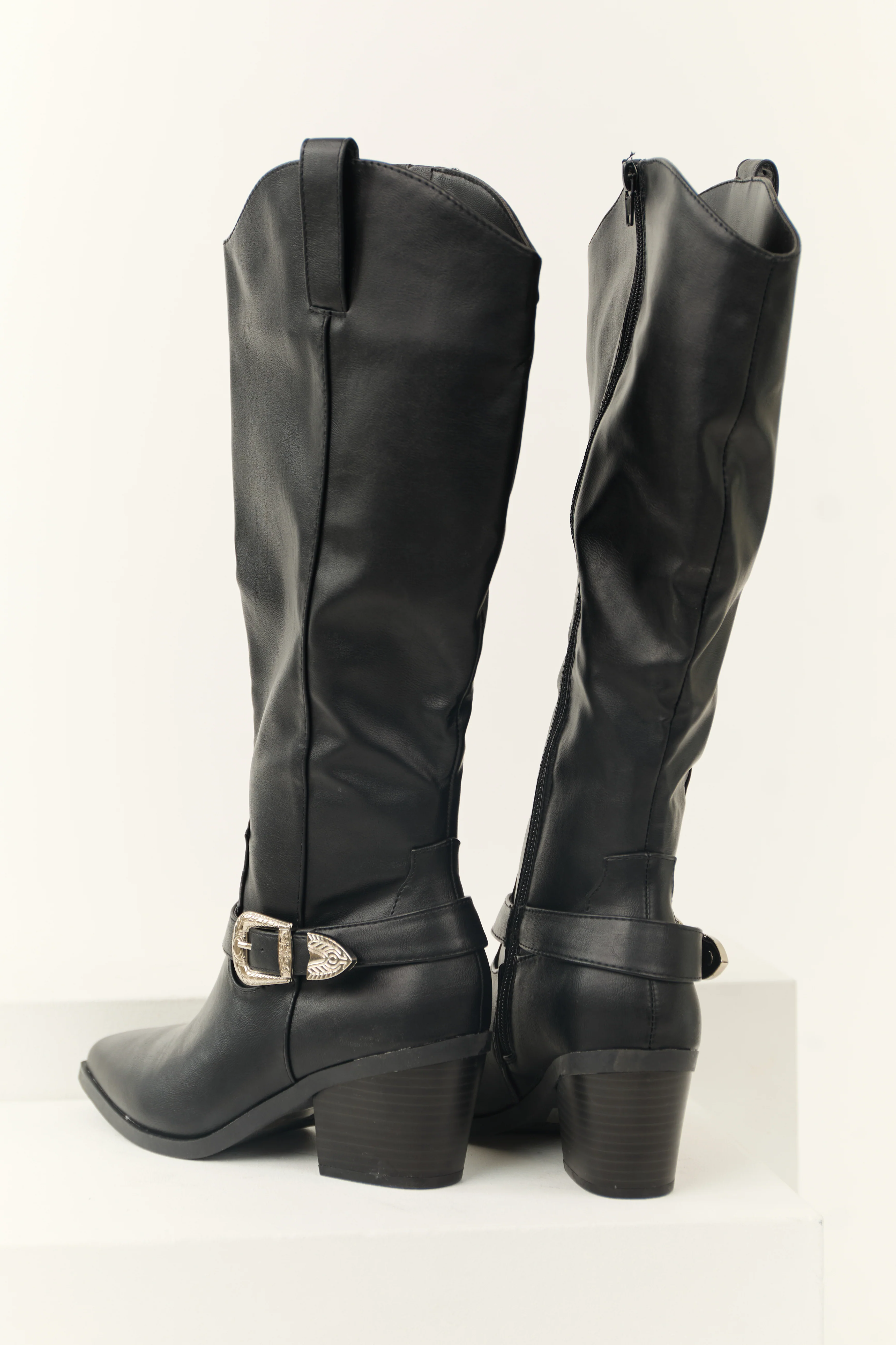 Black Faux Leather Pointed Toe Buckle Boot