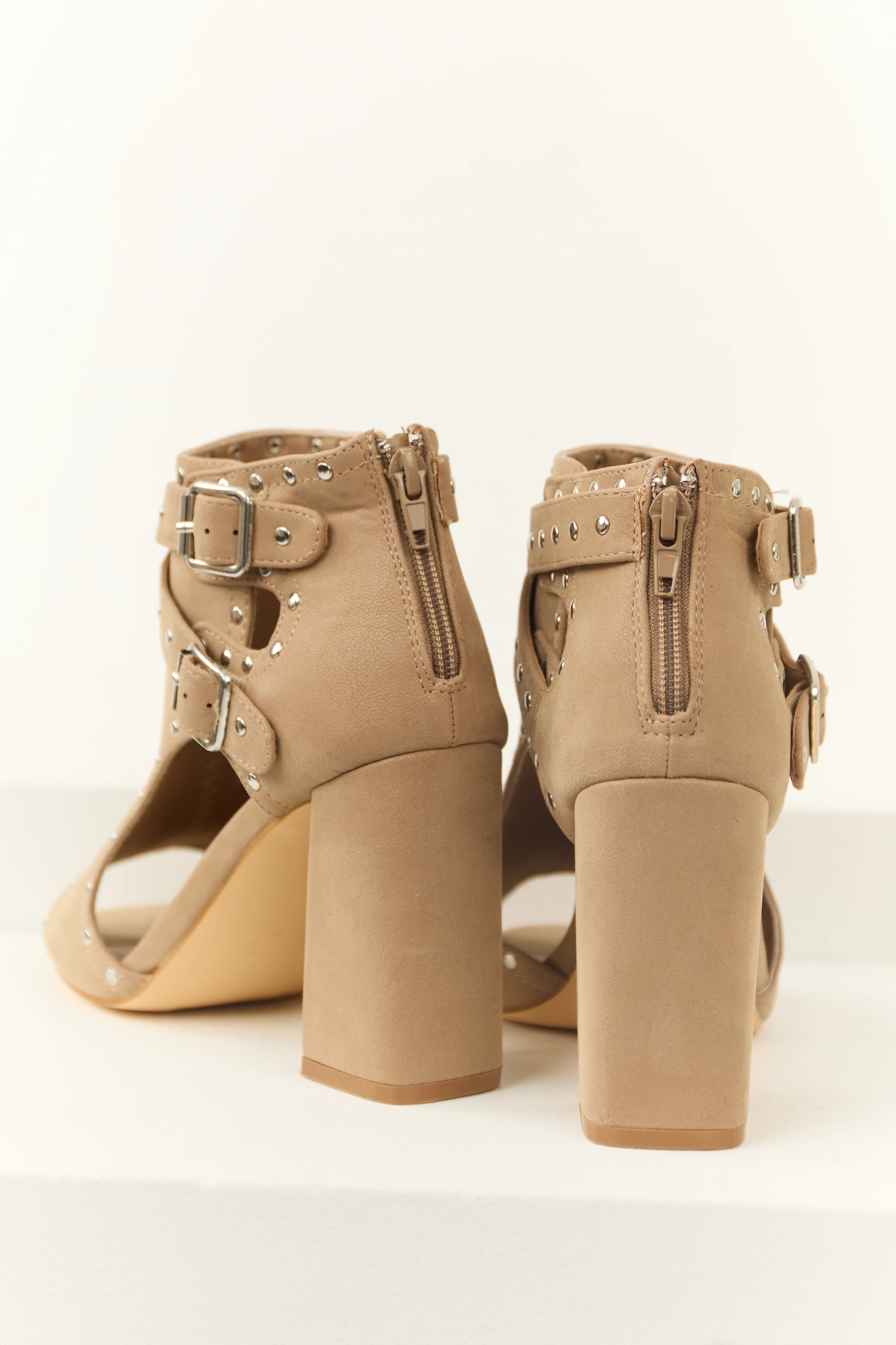 Latte Studded Buckle Straps Open Toed Heels