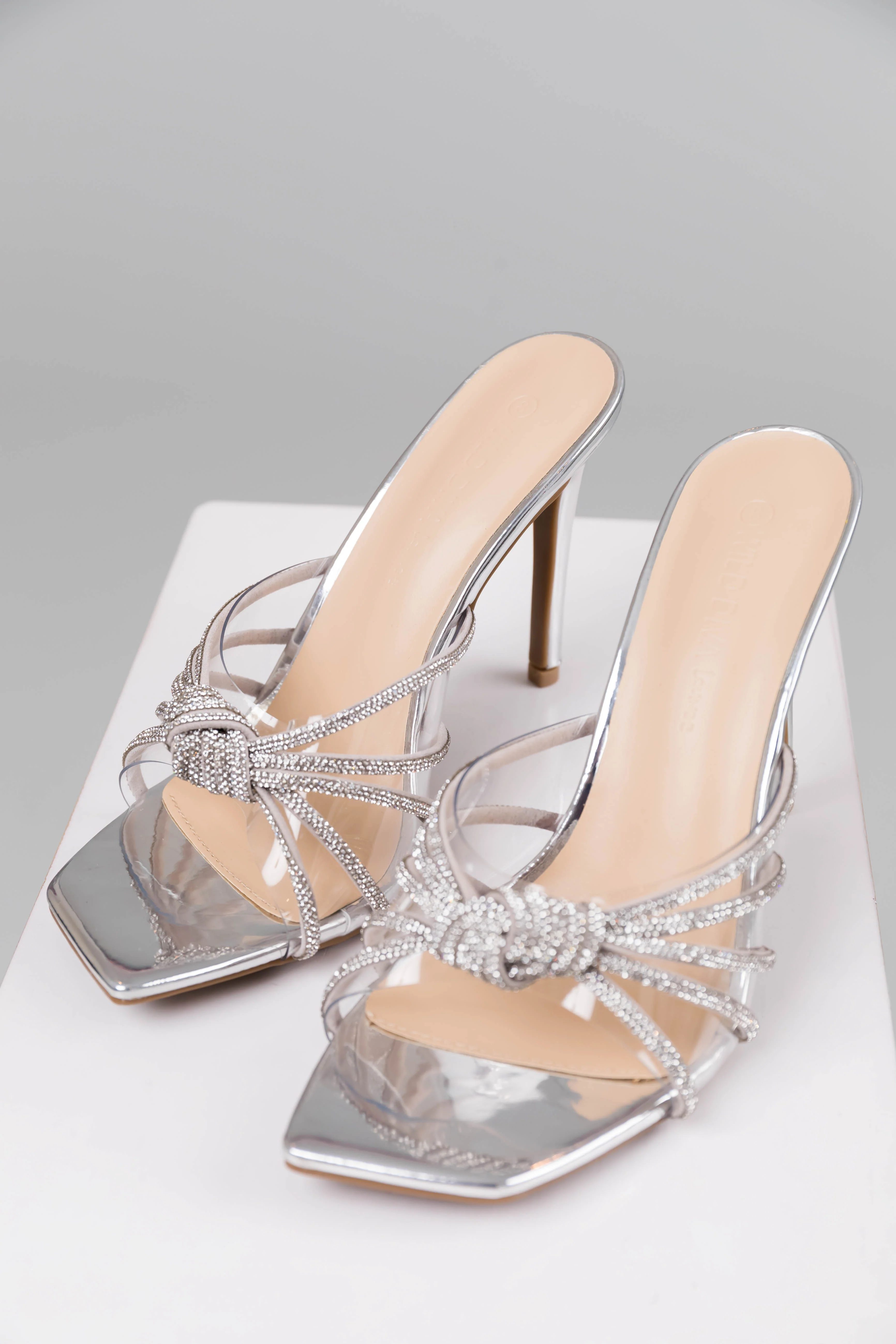 Silver Faux Leather Rhinestone Knot Strap Heels
