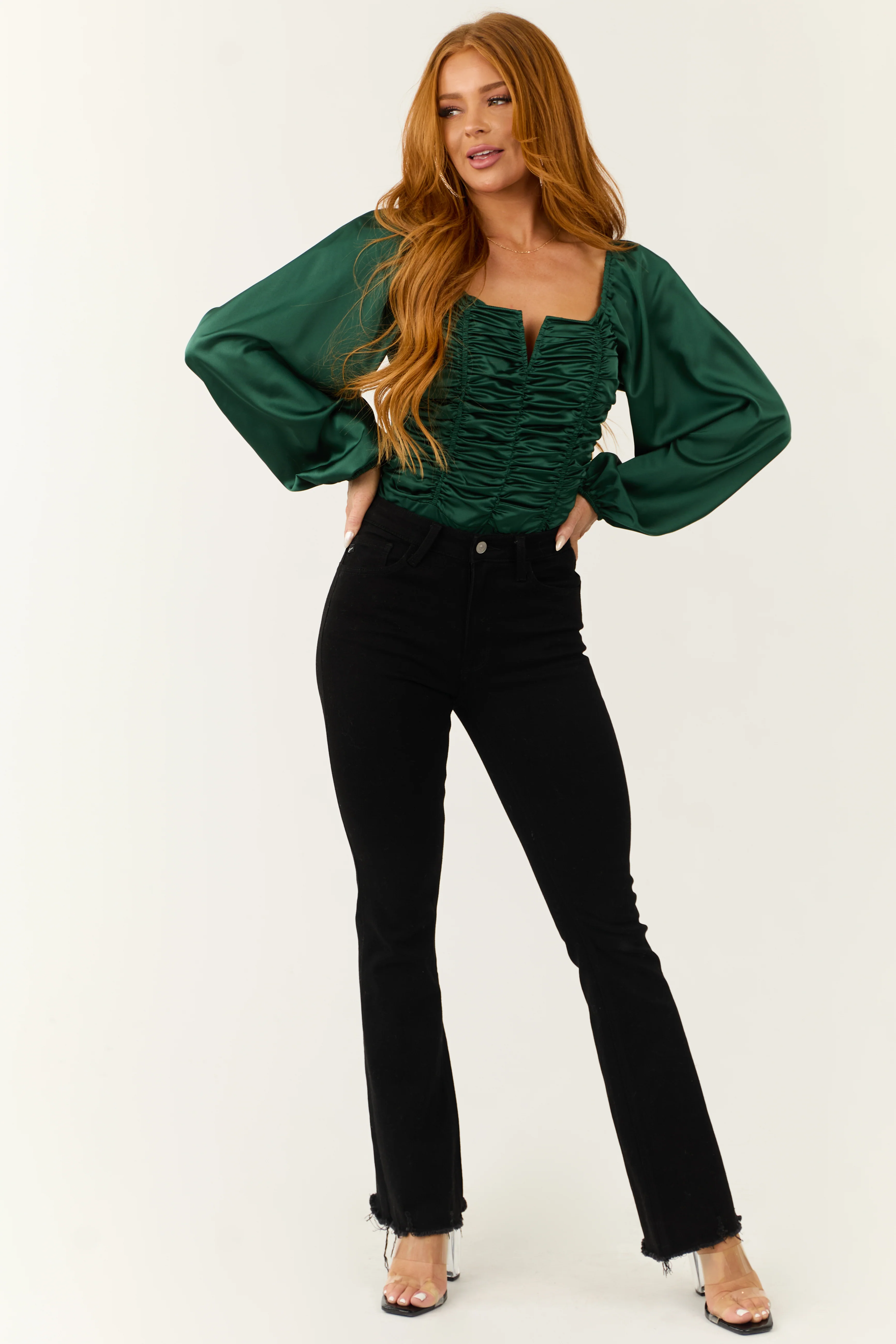 Deep Pine Long Bubble Sleeve Ruched Satin Bodysuit