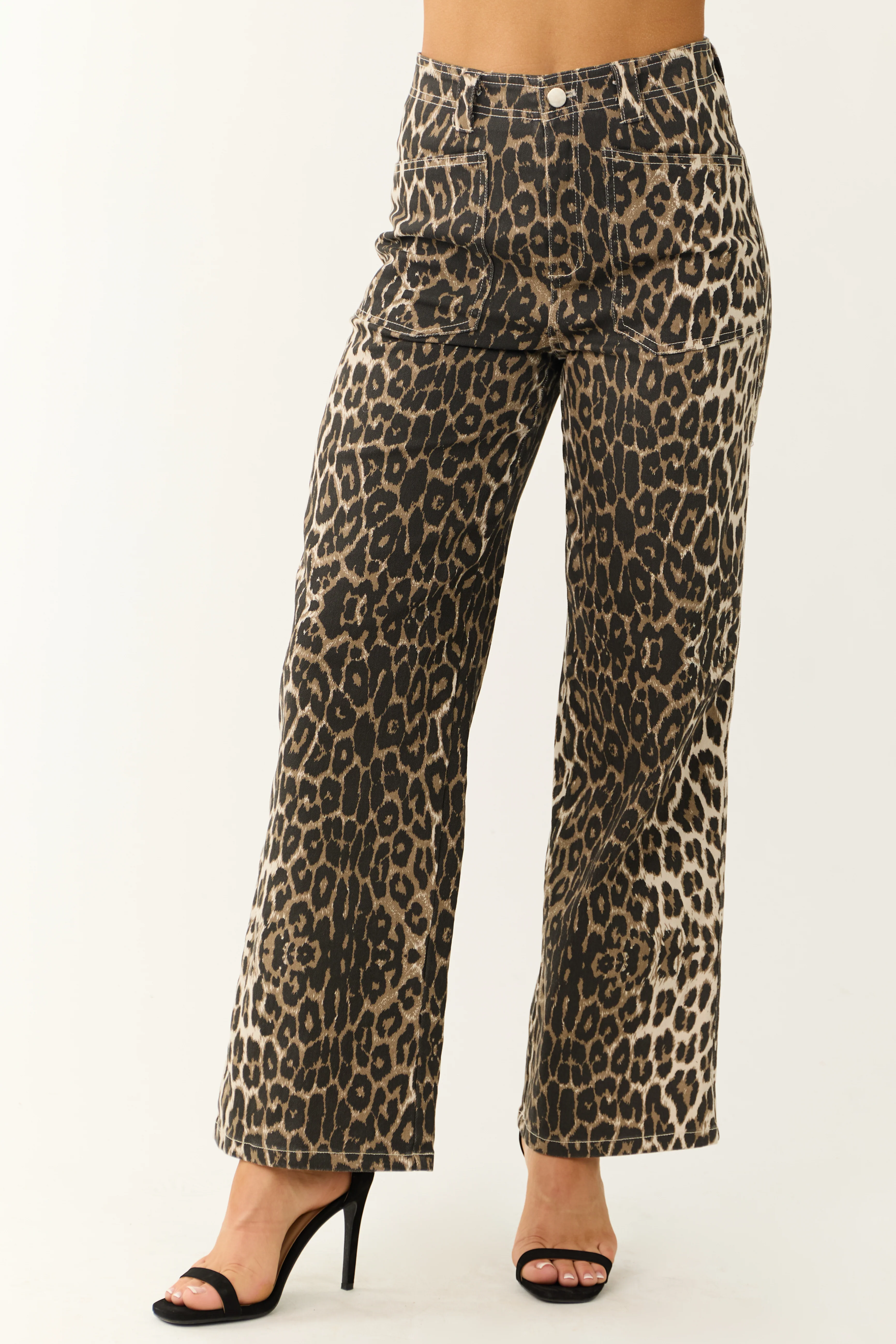 Camel Leopard Print Denim Wide Leg Pants