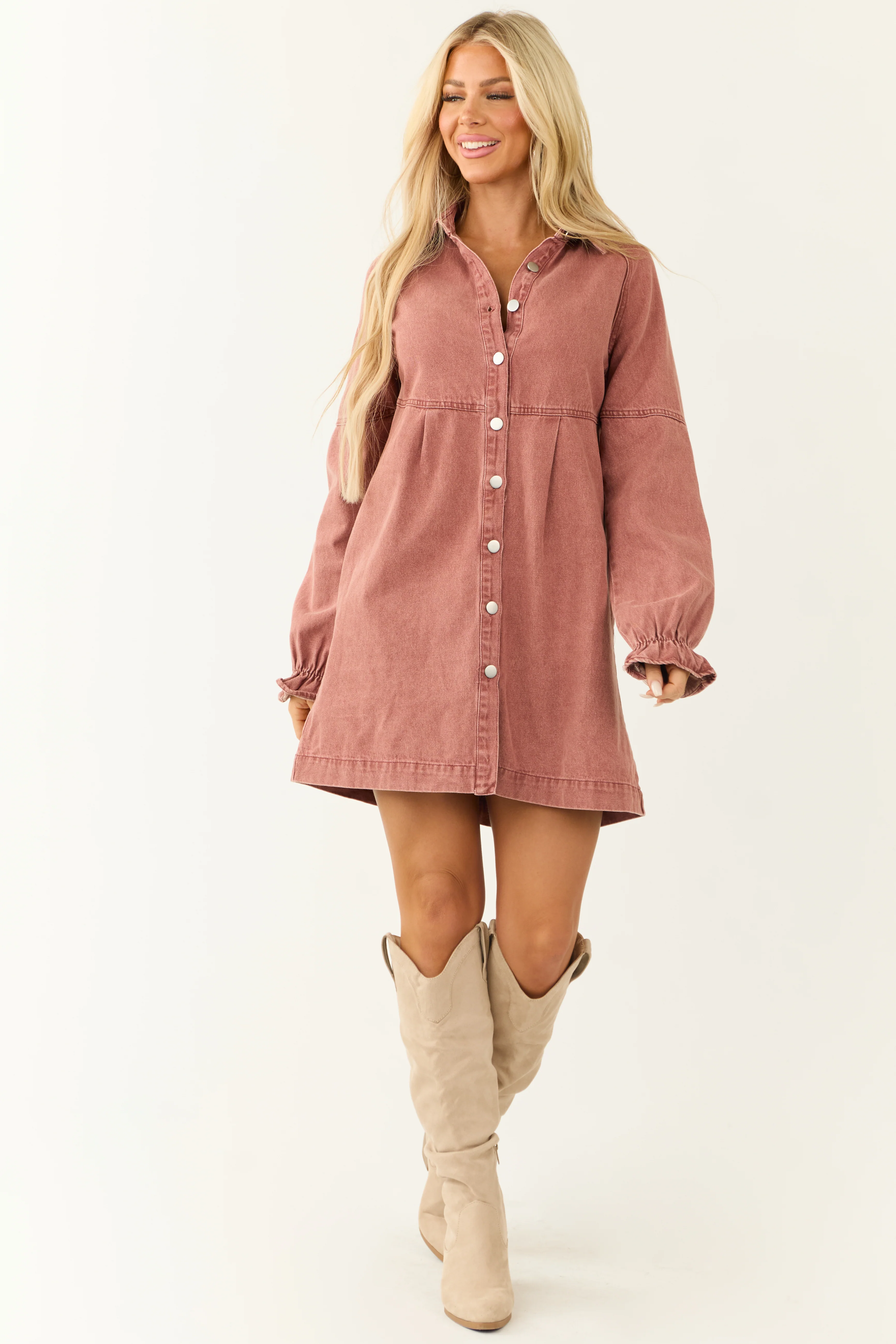 Dusty Rose Denim Button Down Shirt Short Dress