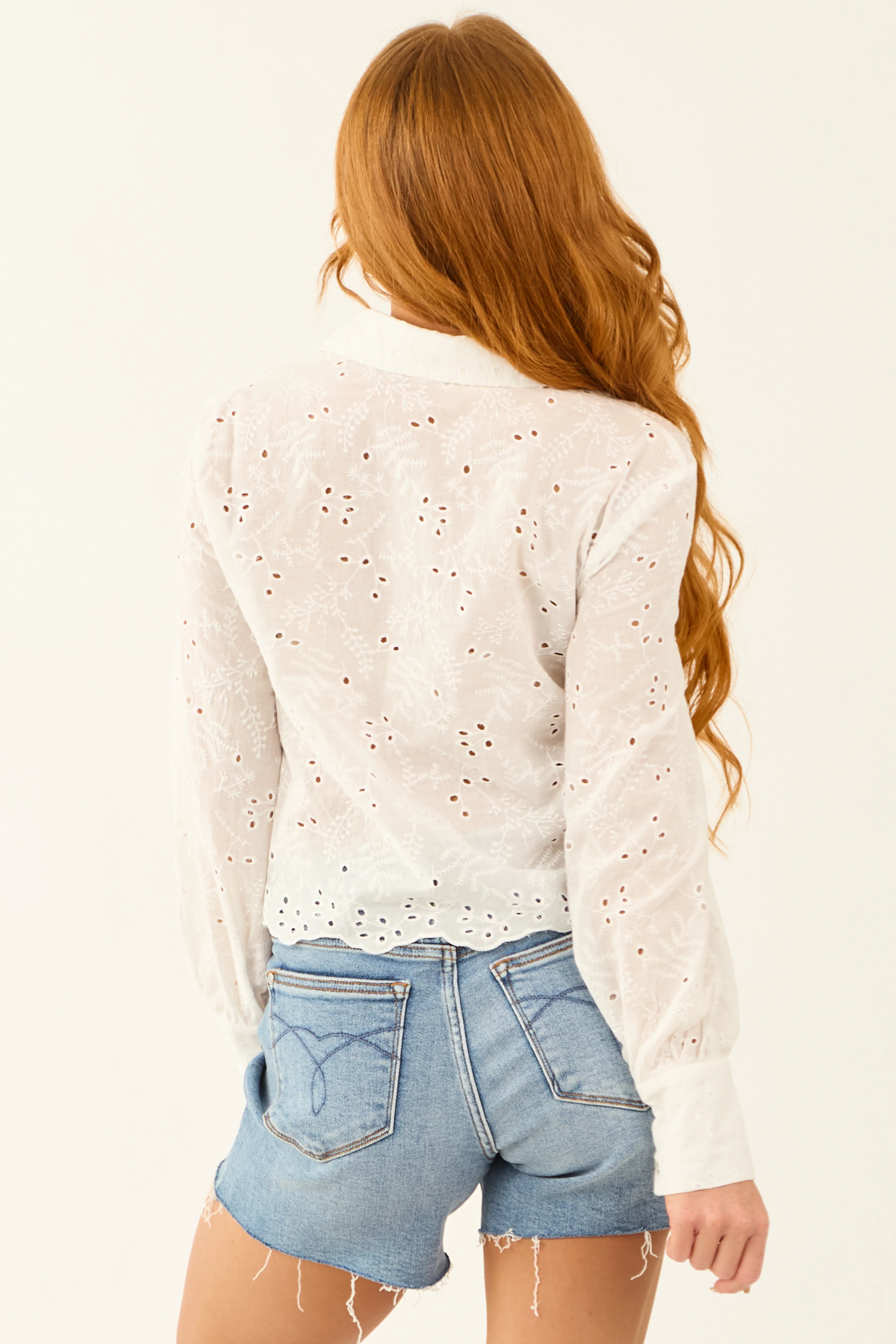 White Eyelet Button Down Scallop Hem Long Sleeve Top