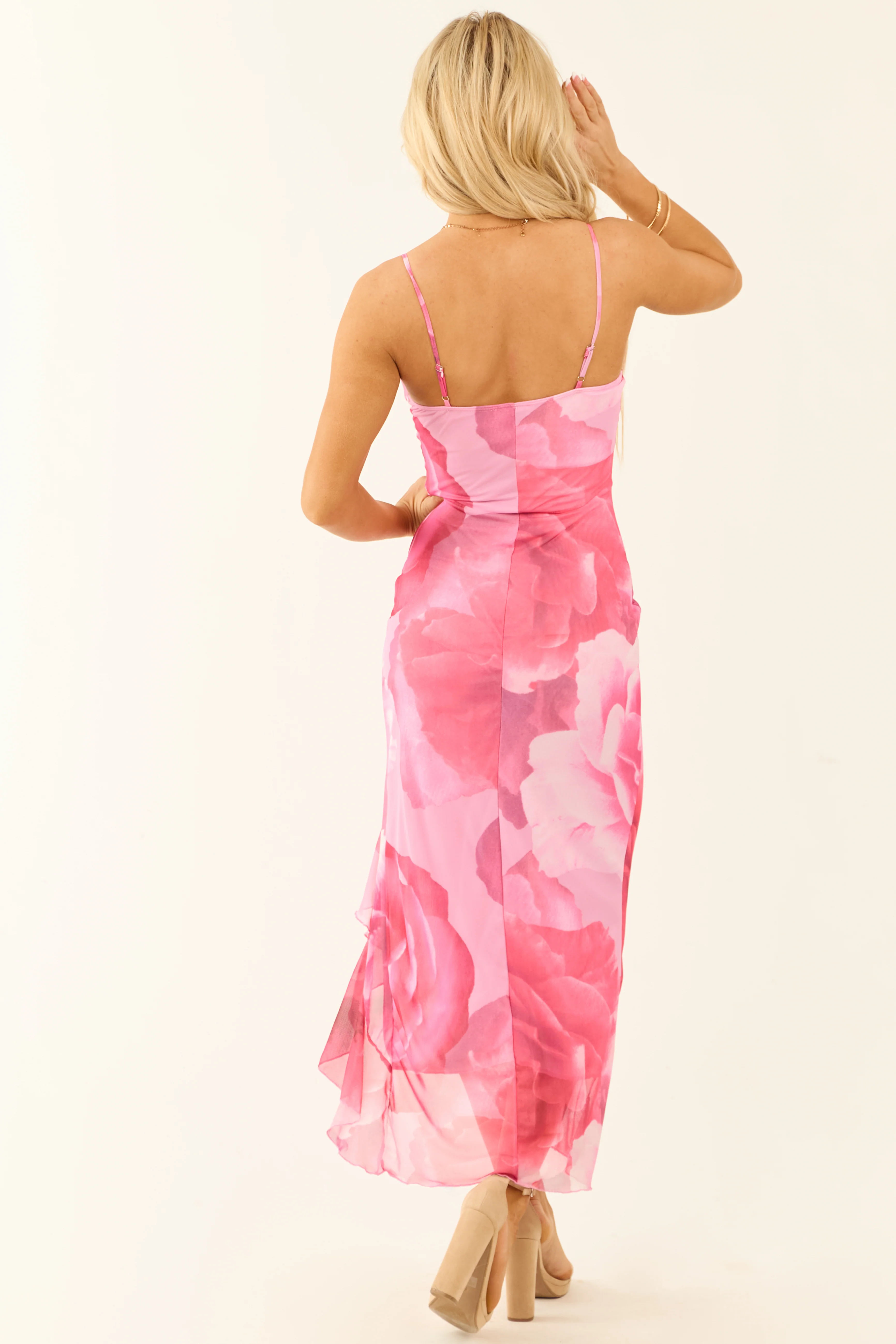 Baby Pink Floral Print Ruffle Slit Midi Dress