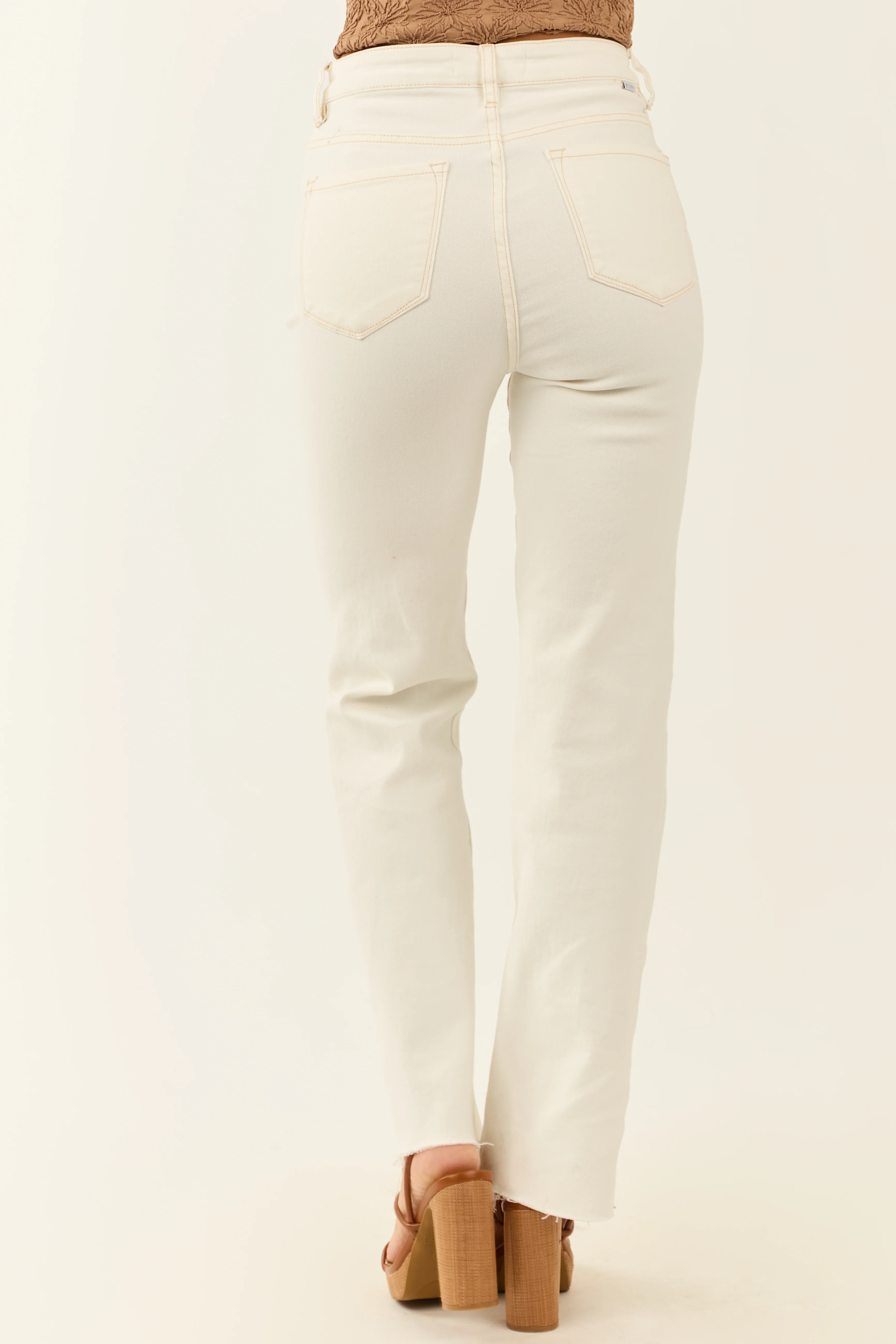Risen Off White Stretchy Straight Leg Raw Hem Jeans