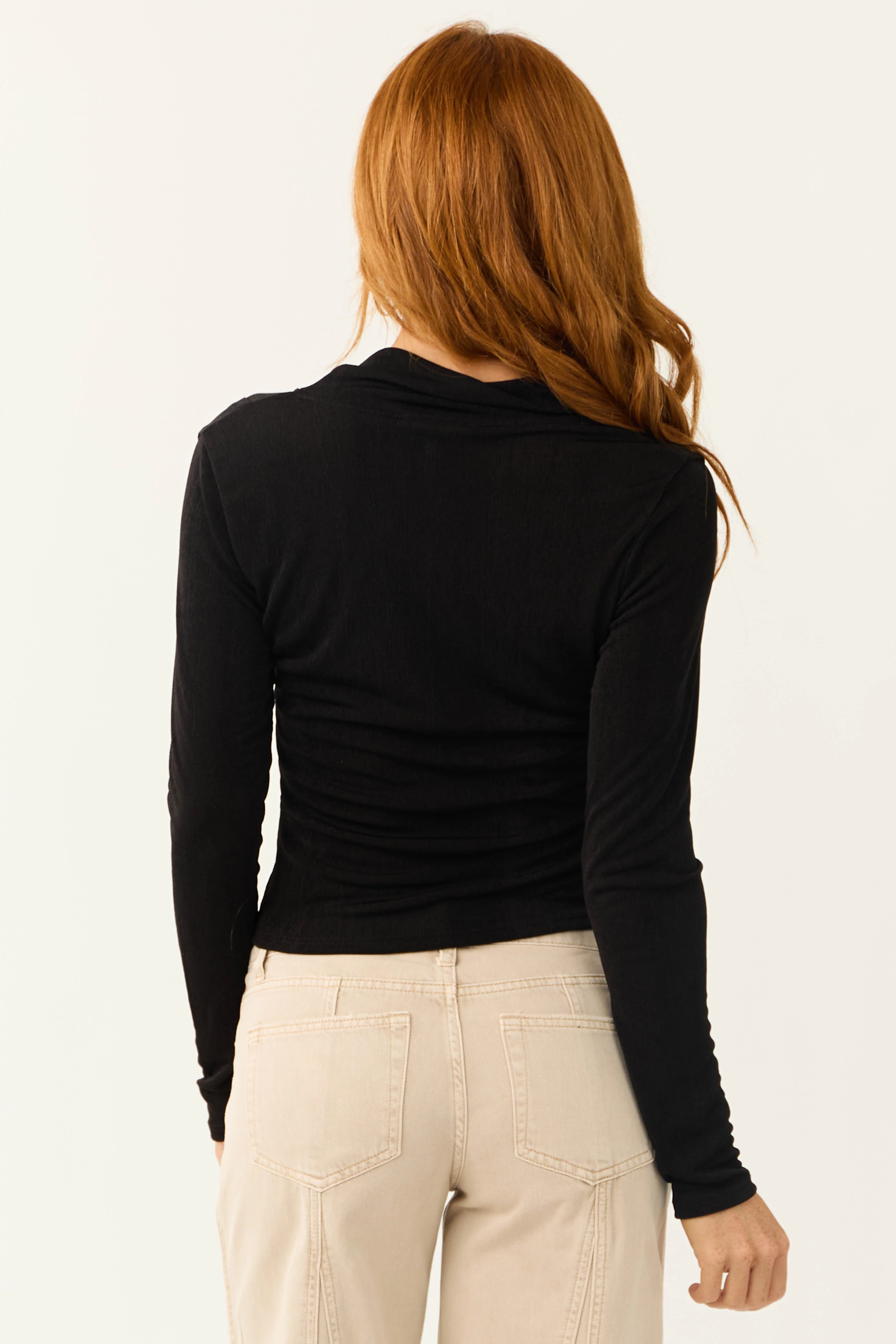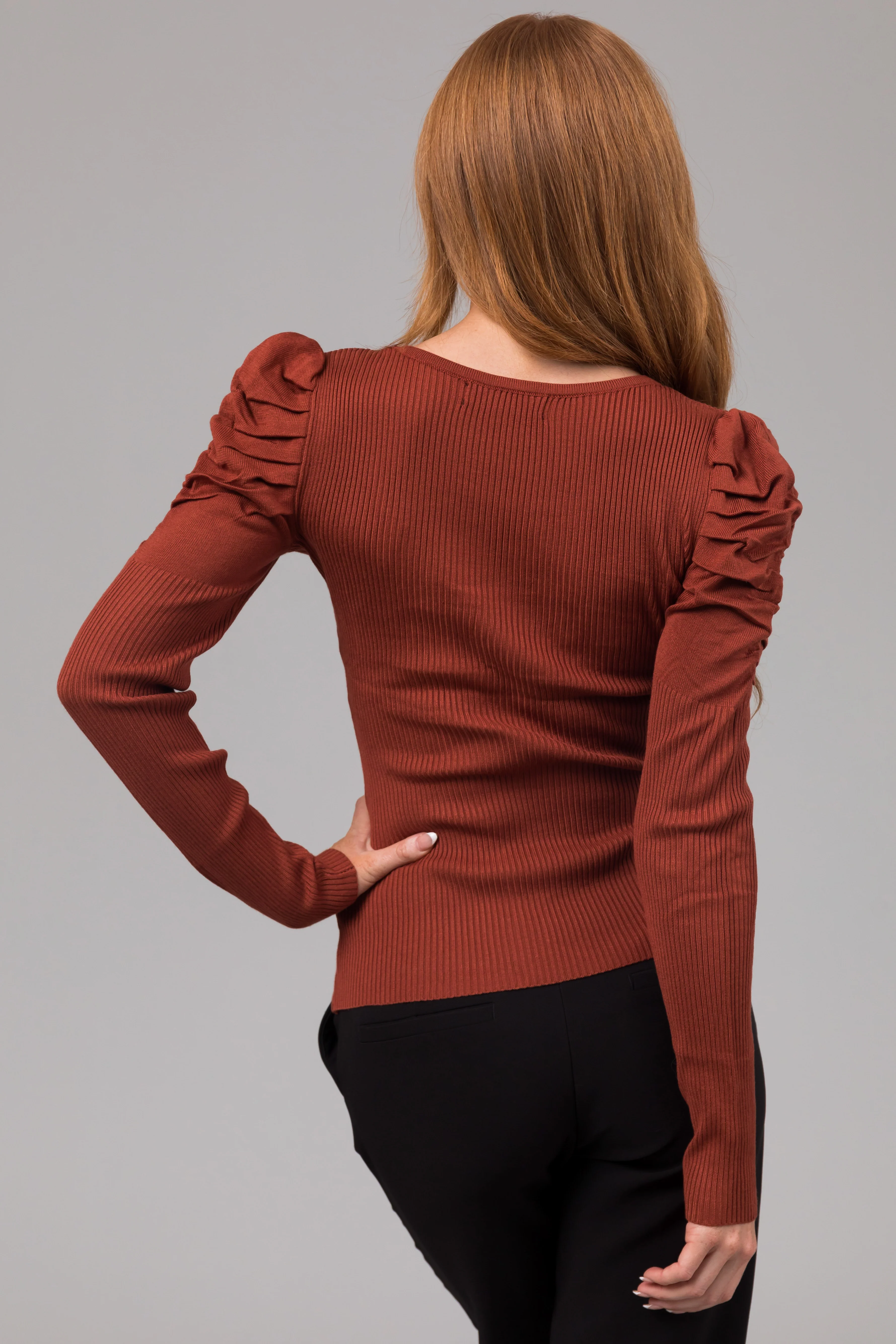 Cinnamon Ruched Puff Shoulder Ribbed Knit Top