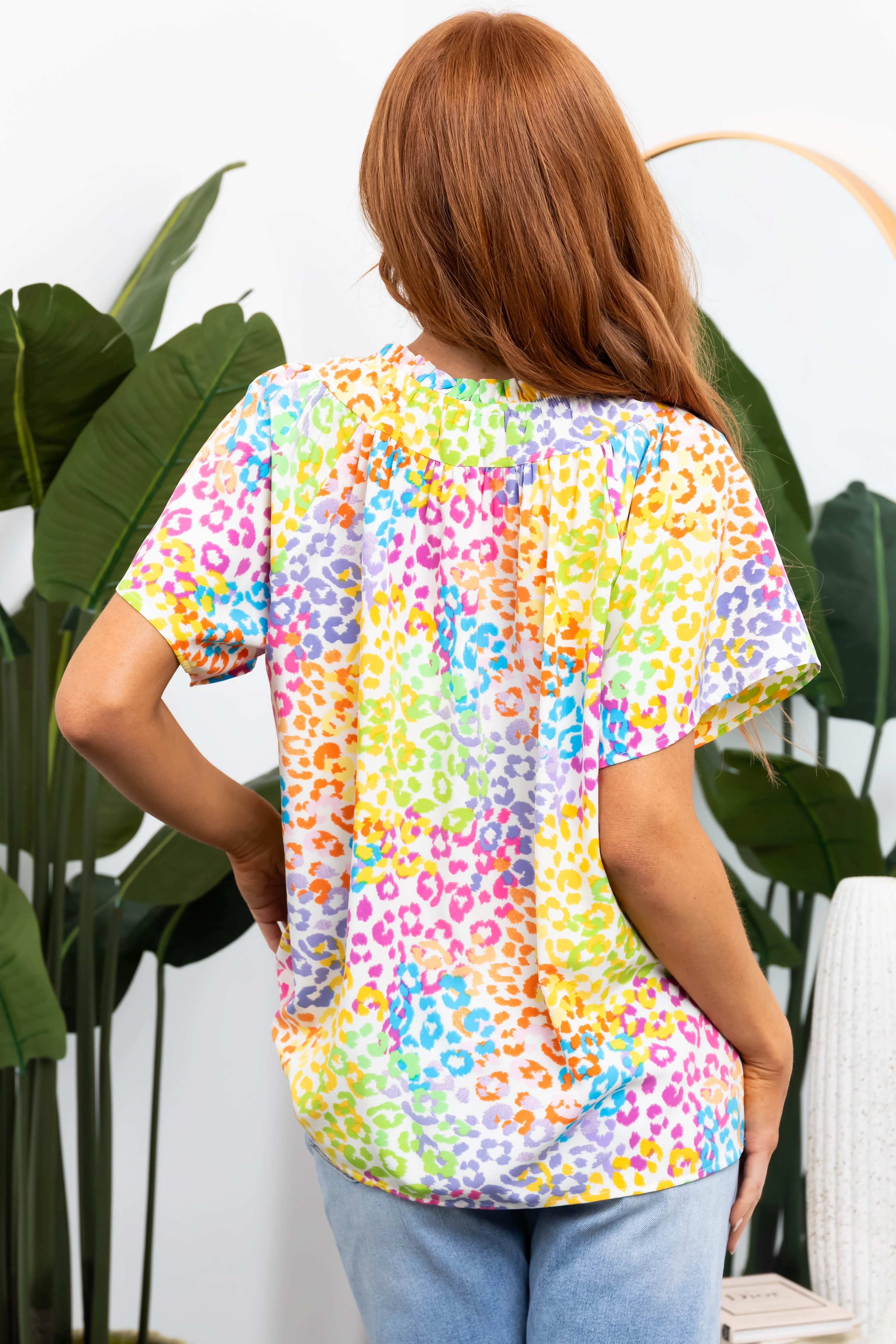 Ivory Leopard Print Short Sleeve V Neck Top