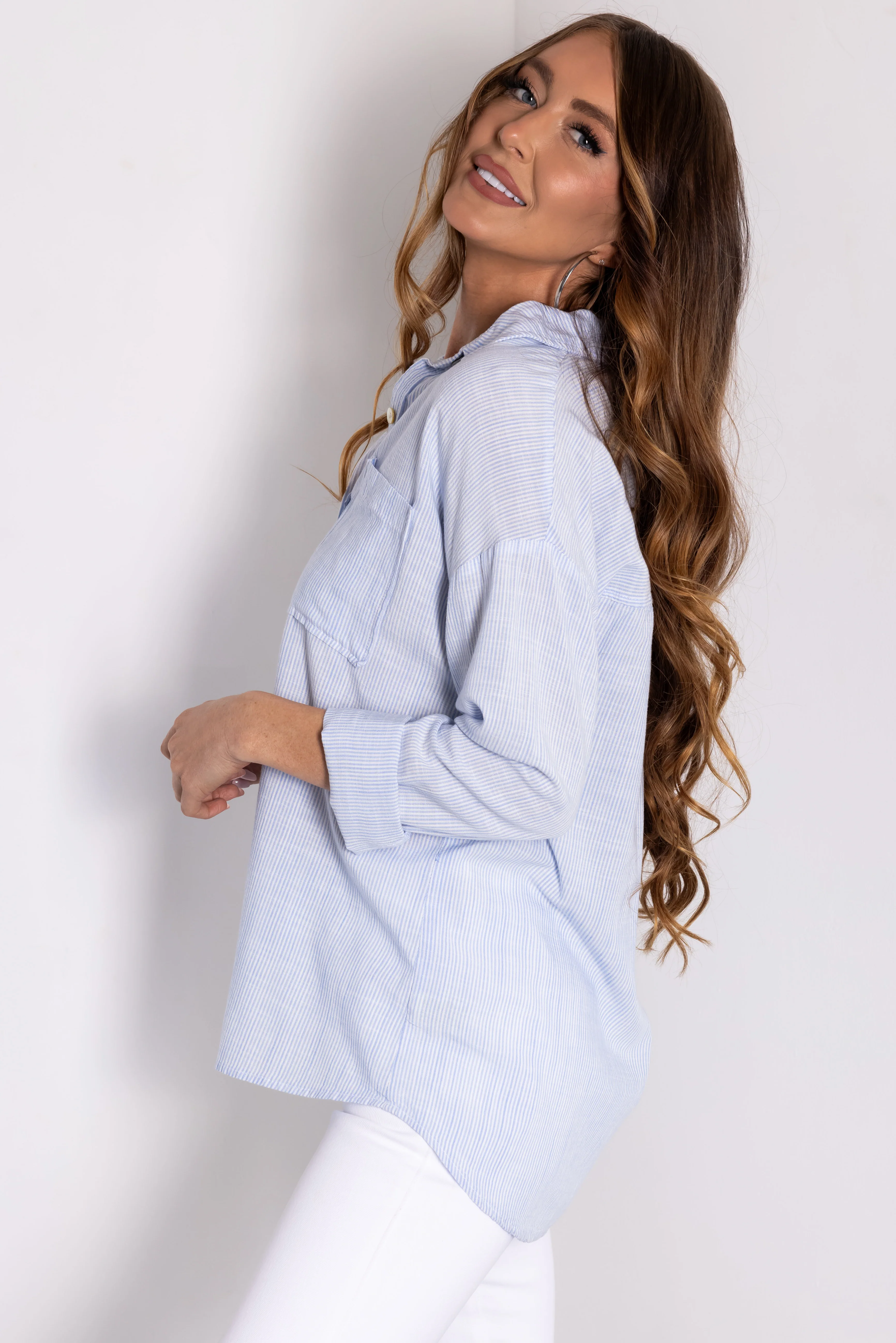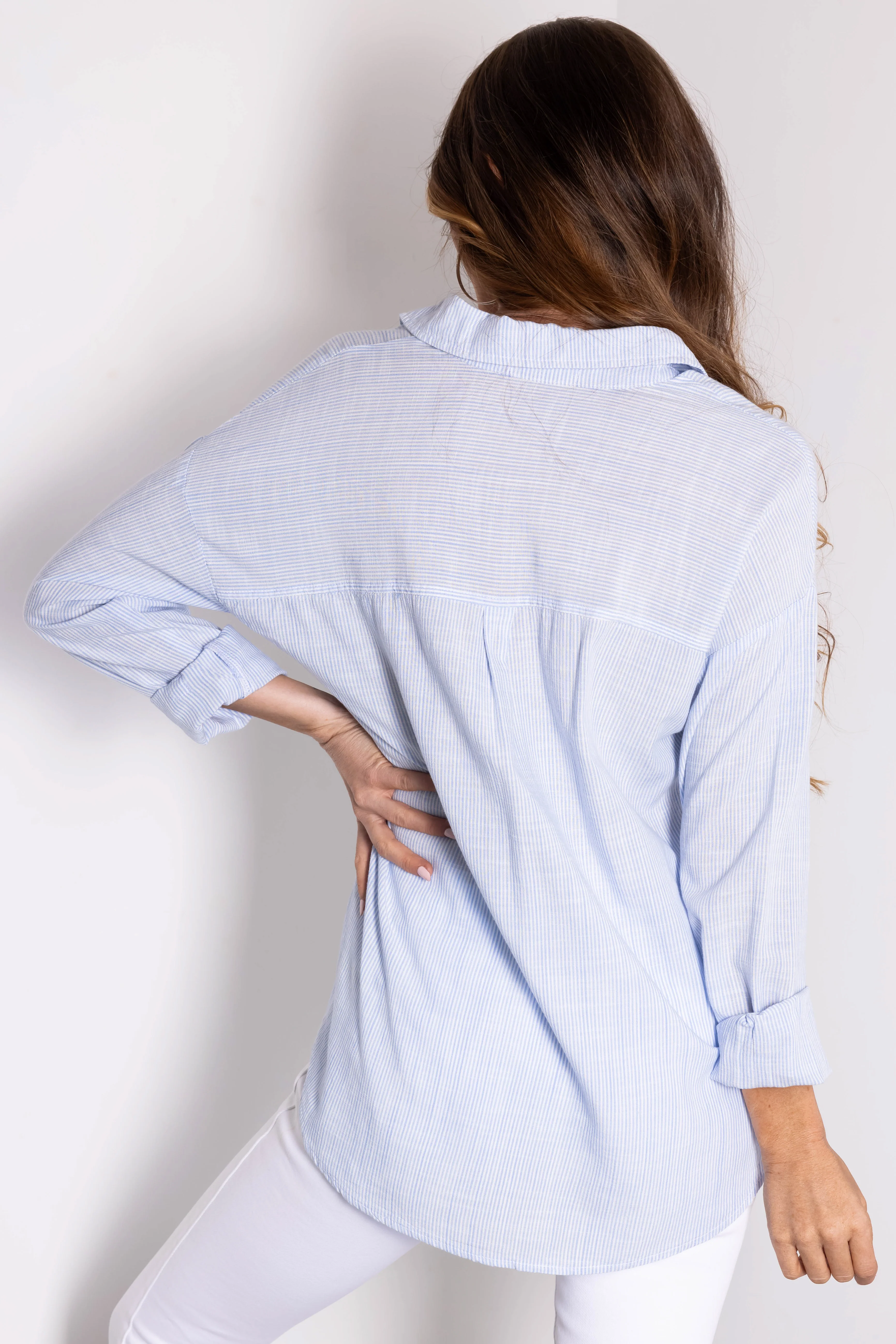 Sky Blue Striped Button Down Long Sleeve Top