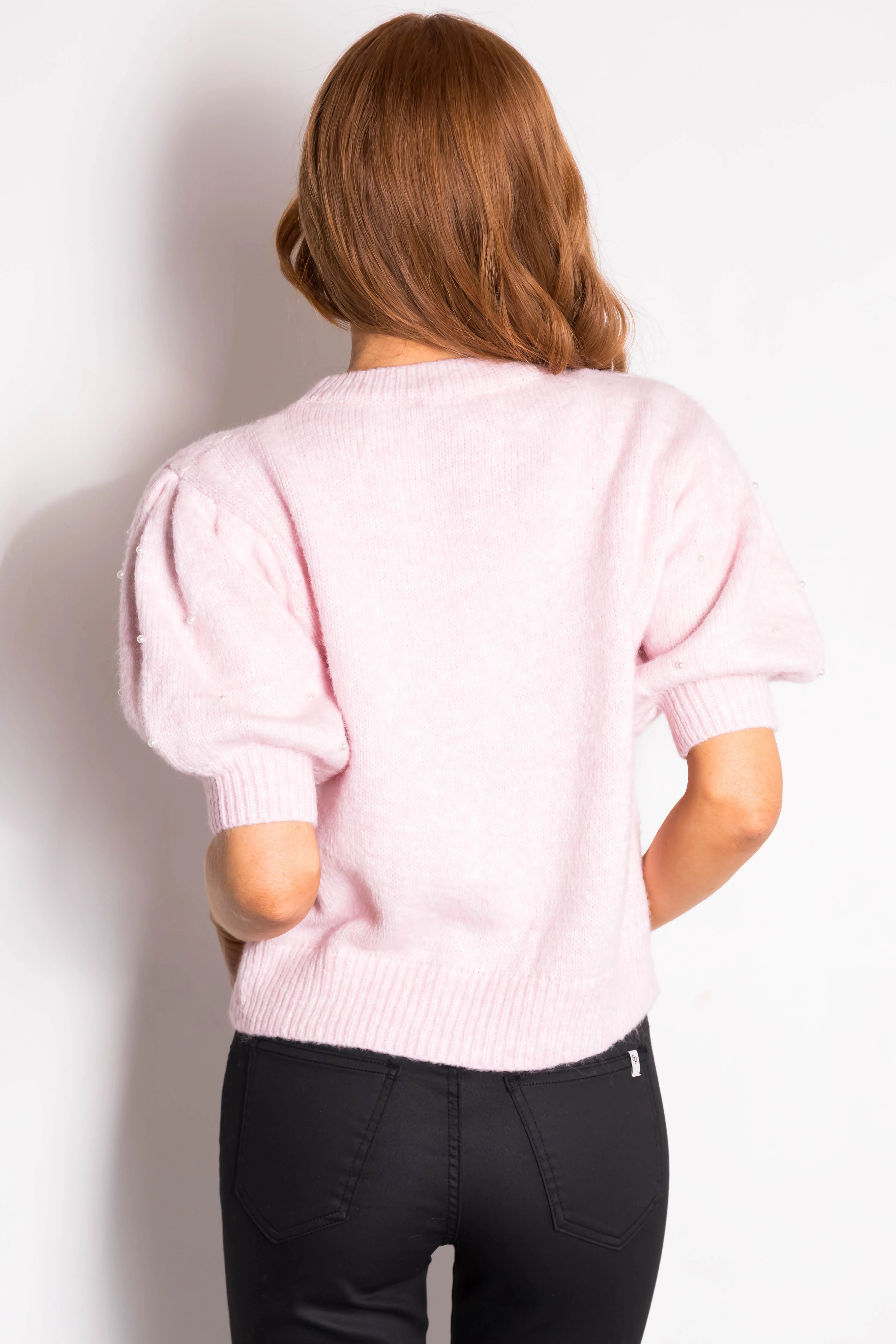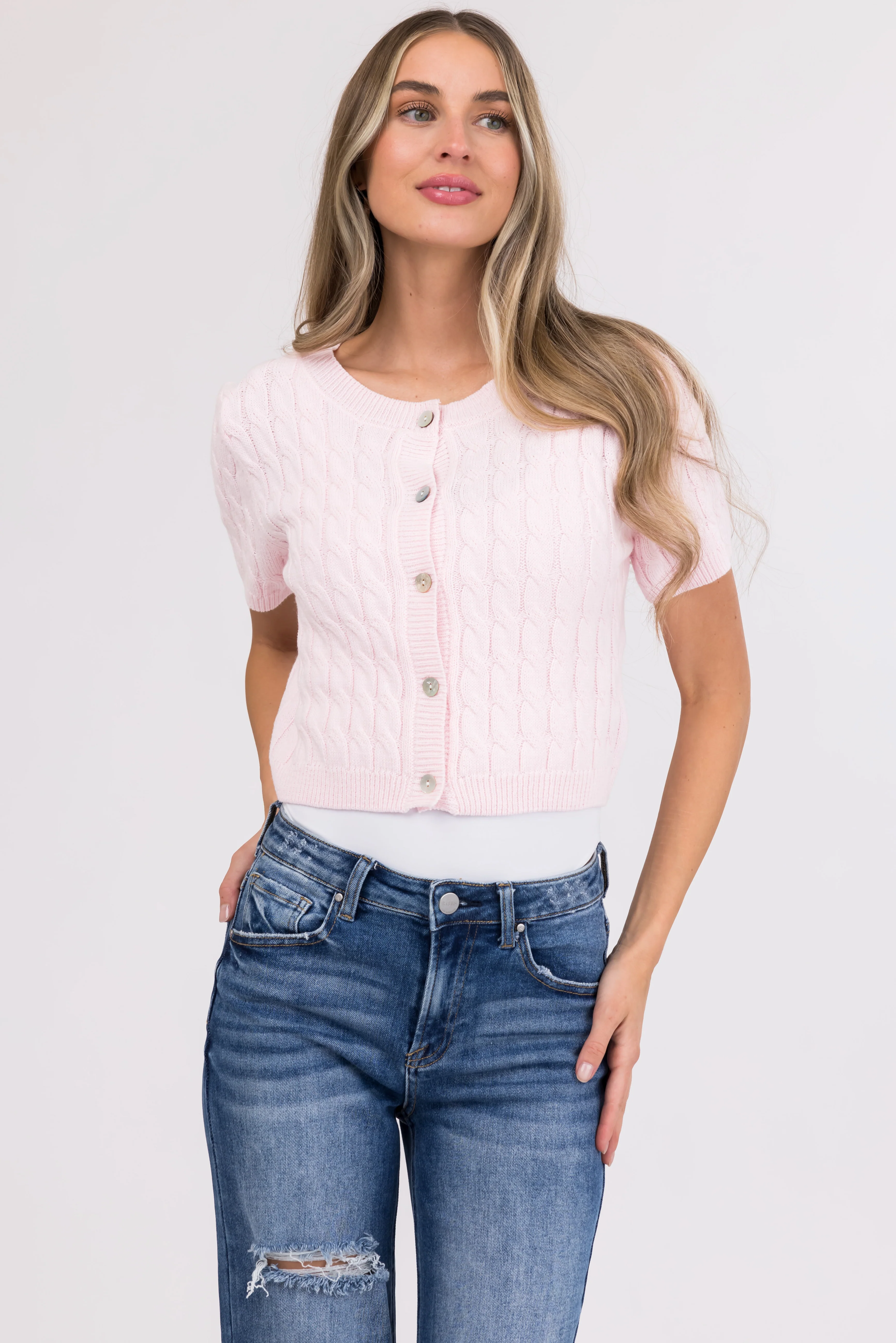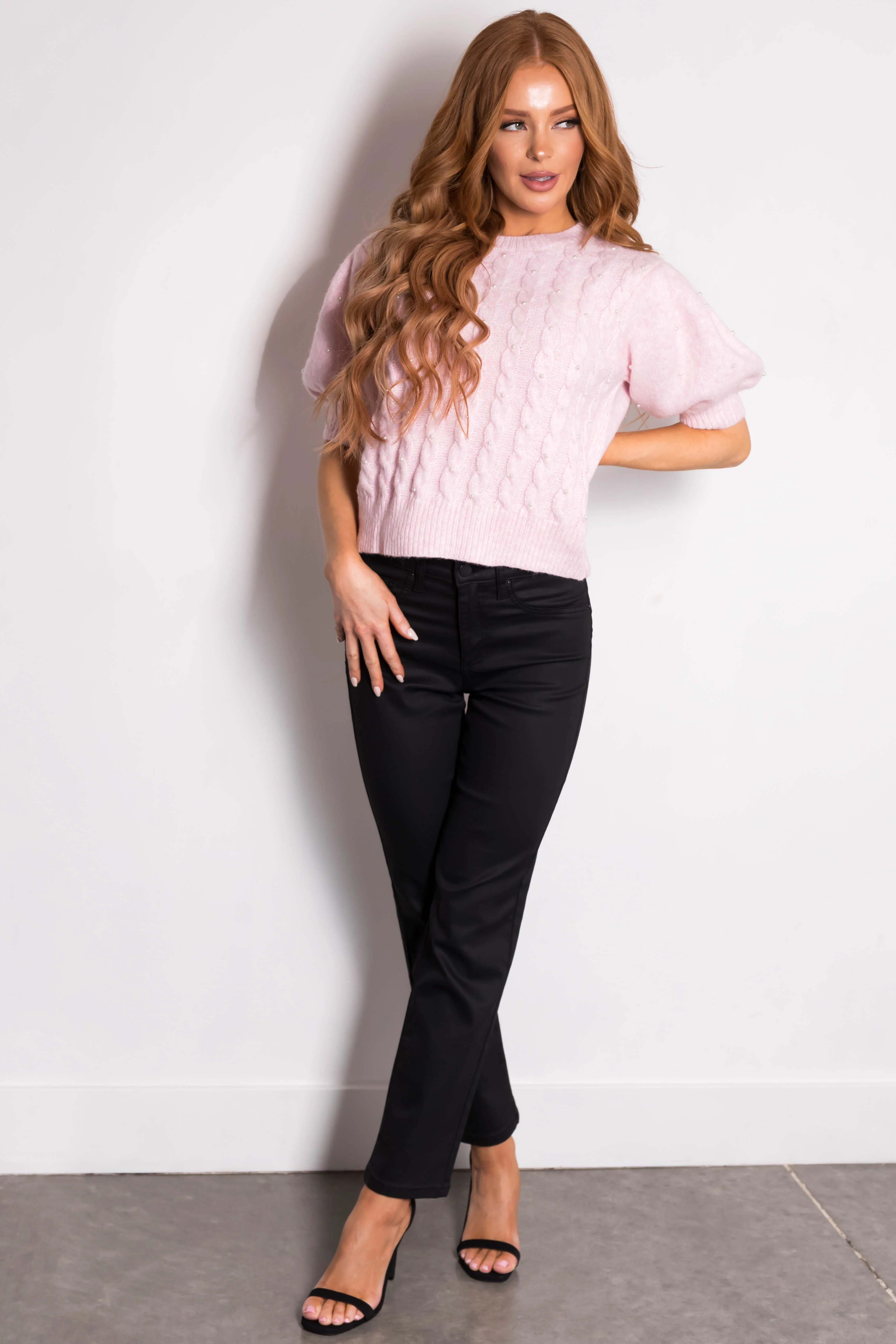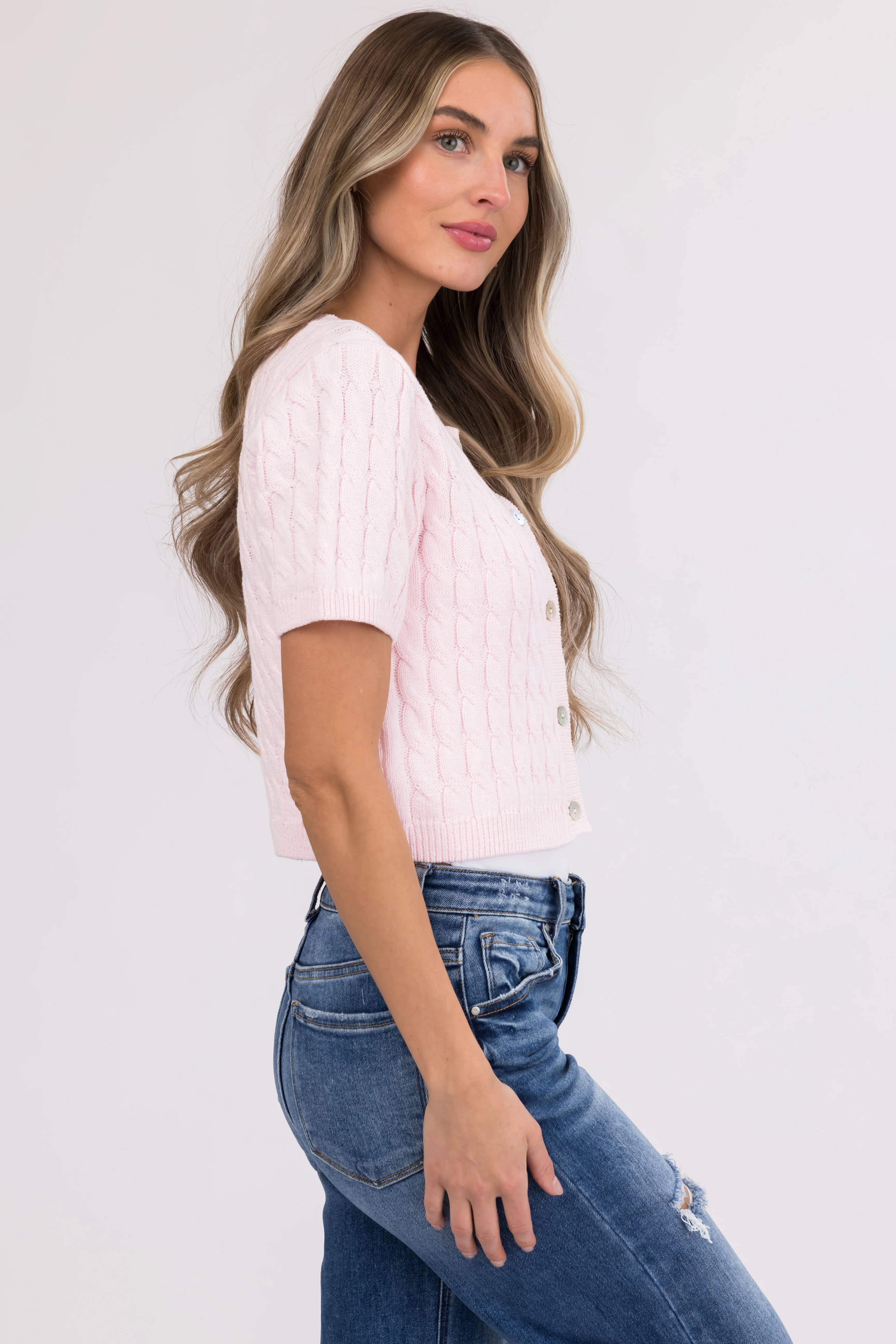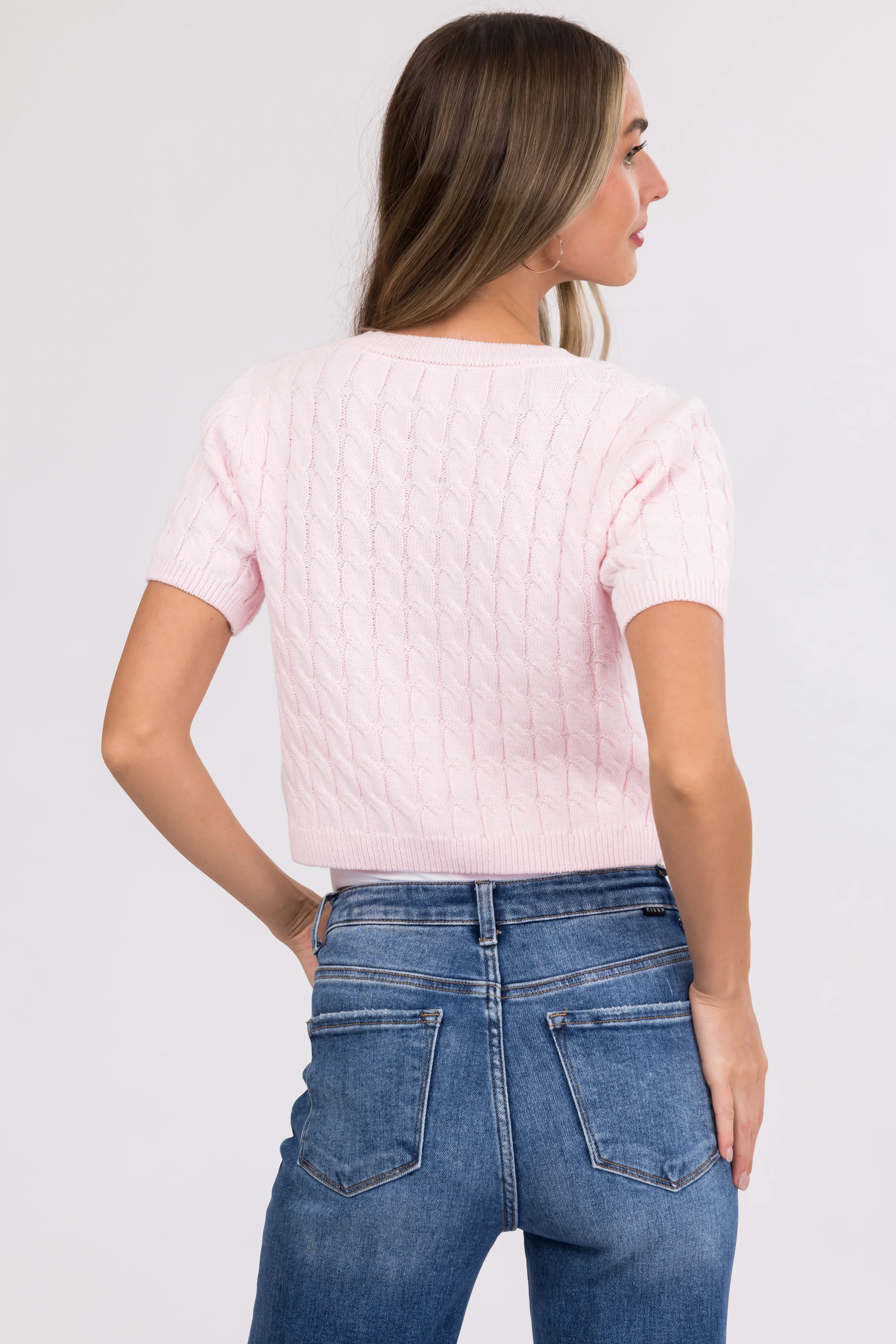 She+Sky Blush Cable Knit Pearl Studded Short Sleeve Sweater
