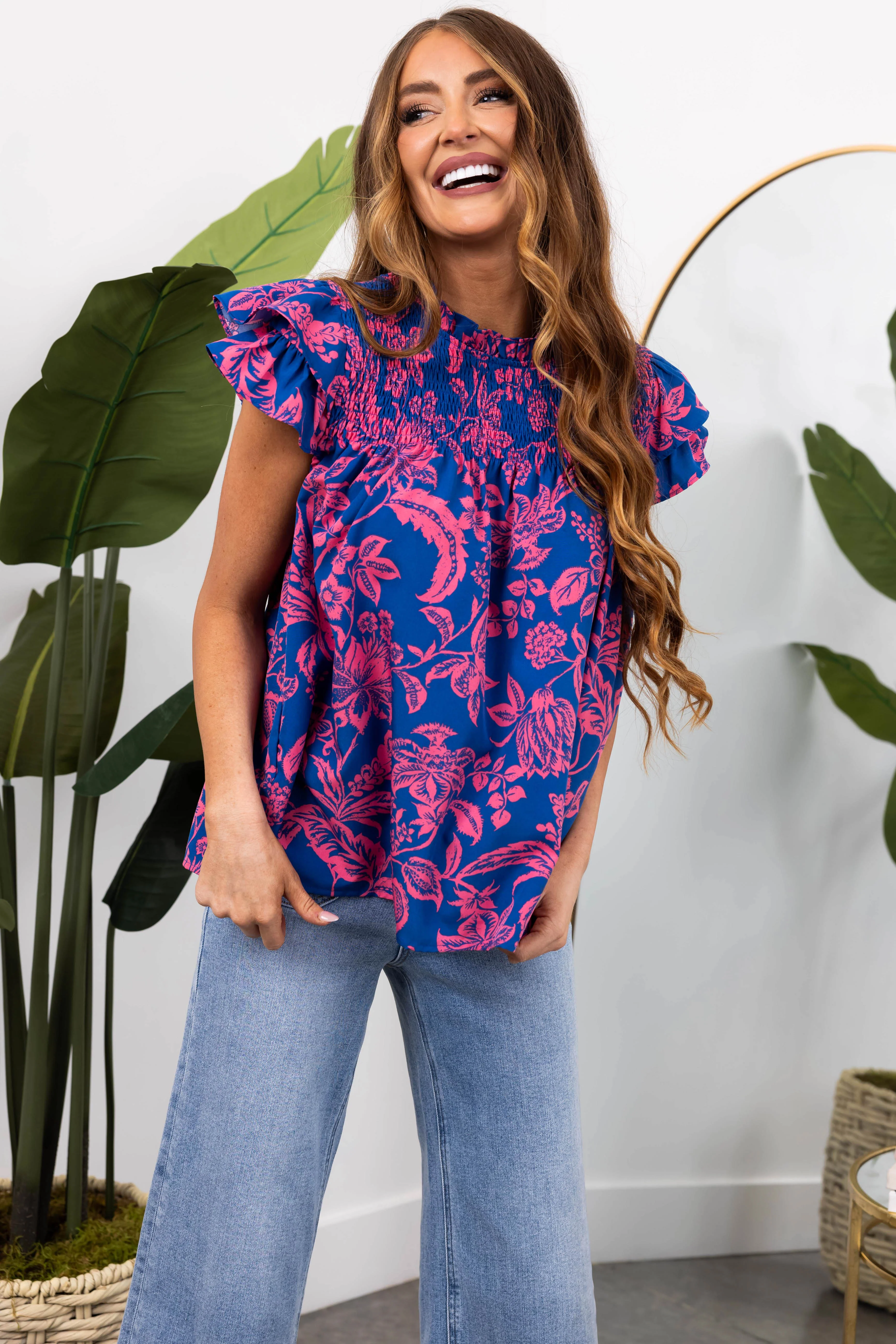She+Sky Cobalt Flutter Sleeve Smocked Top