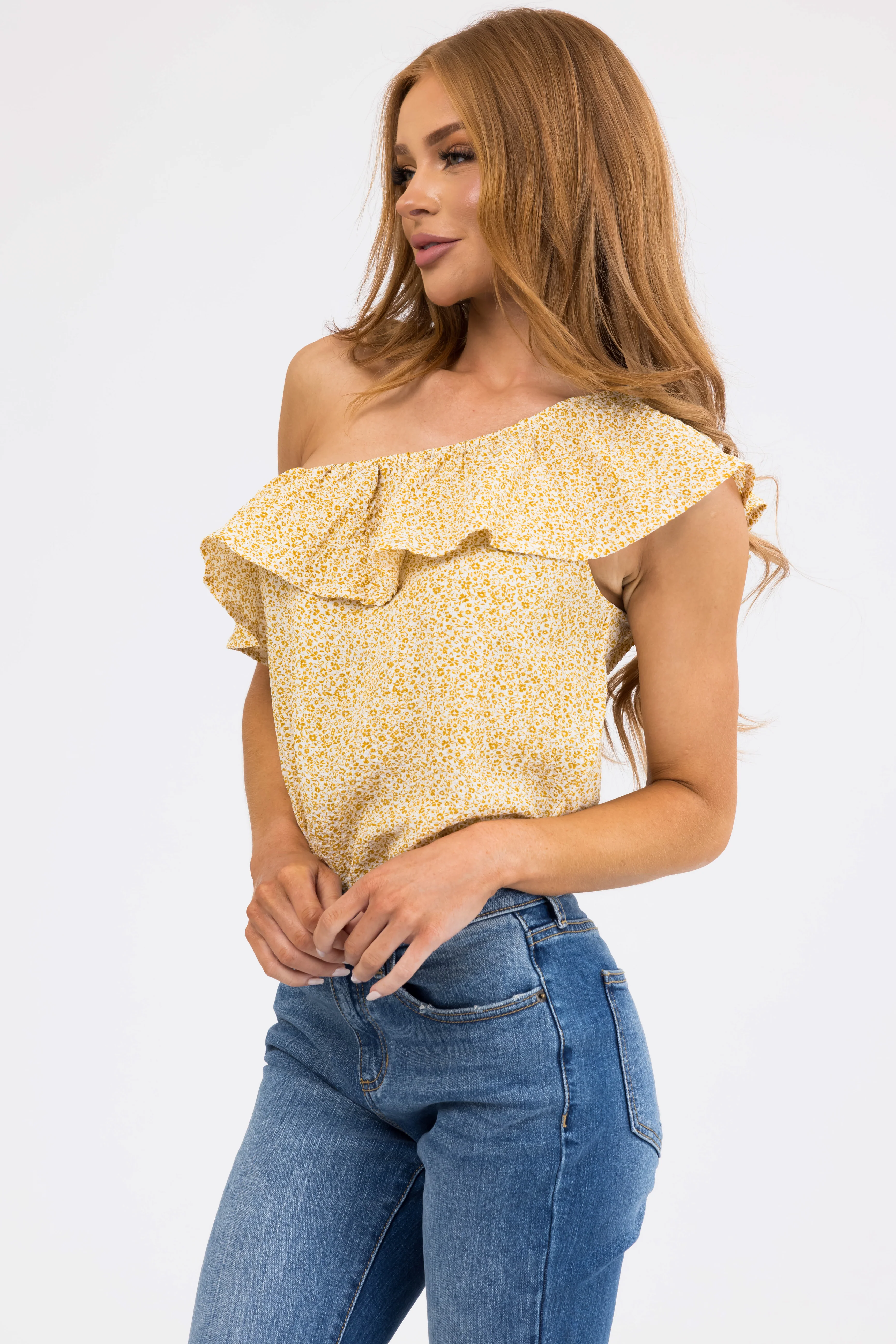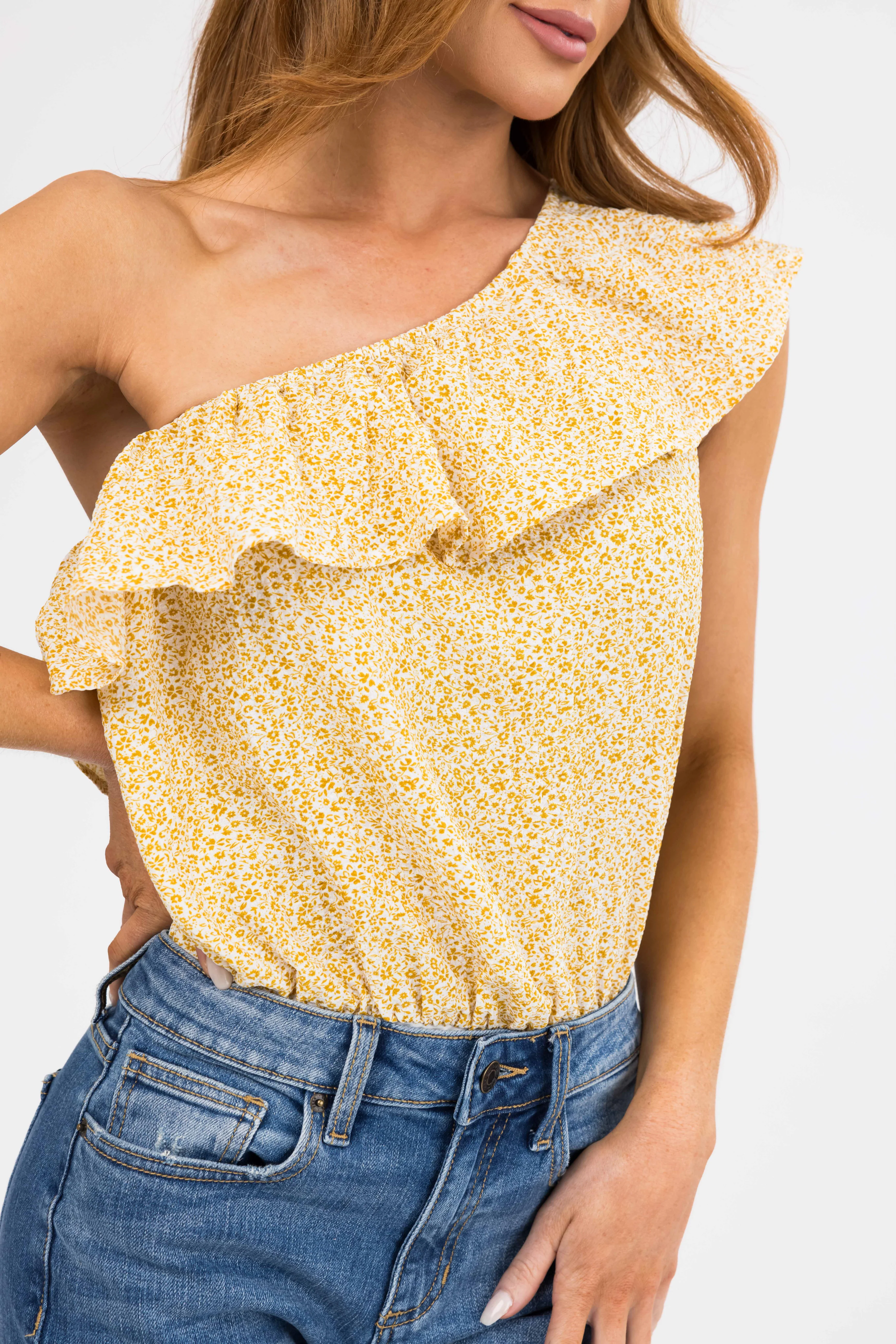 Mustard Ditsy Floral Ruffle One Shoulder Bodysuit