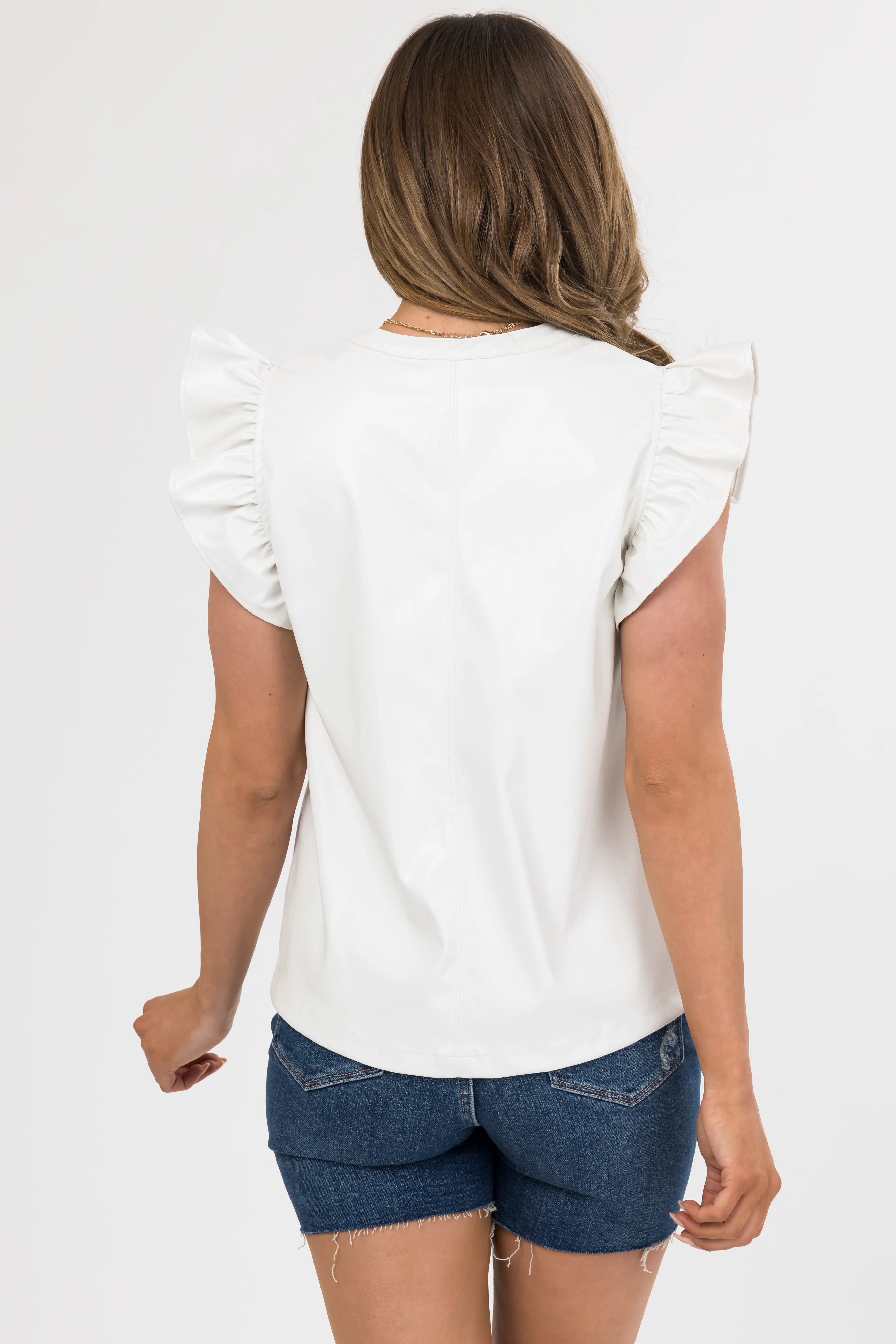 Coconut Faux Leather Ruffle Shoulder Blouse