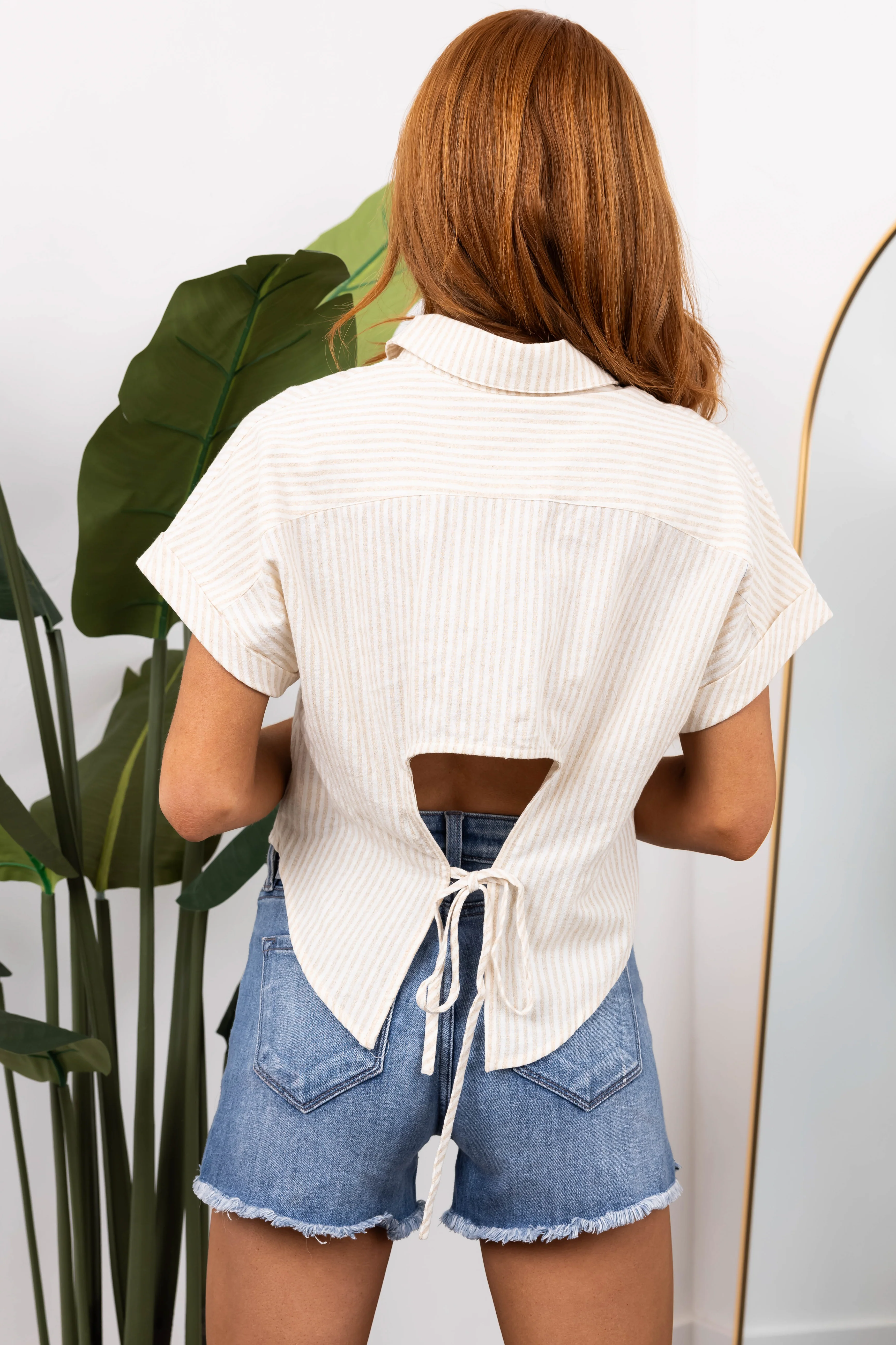 Sand Striped Open Back Button Up Top
