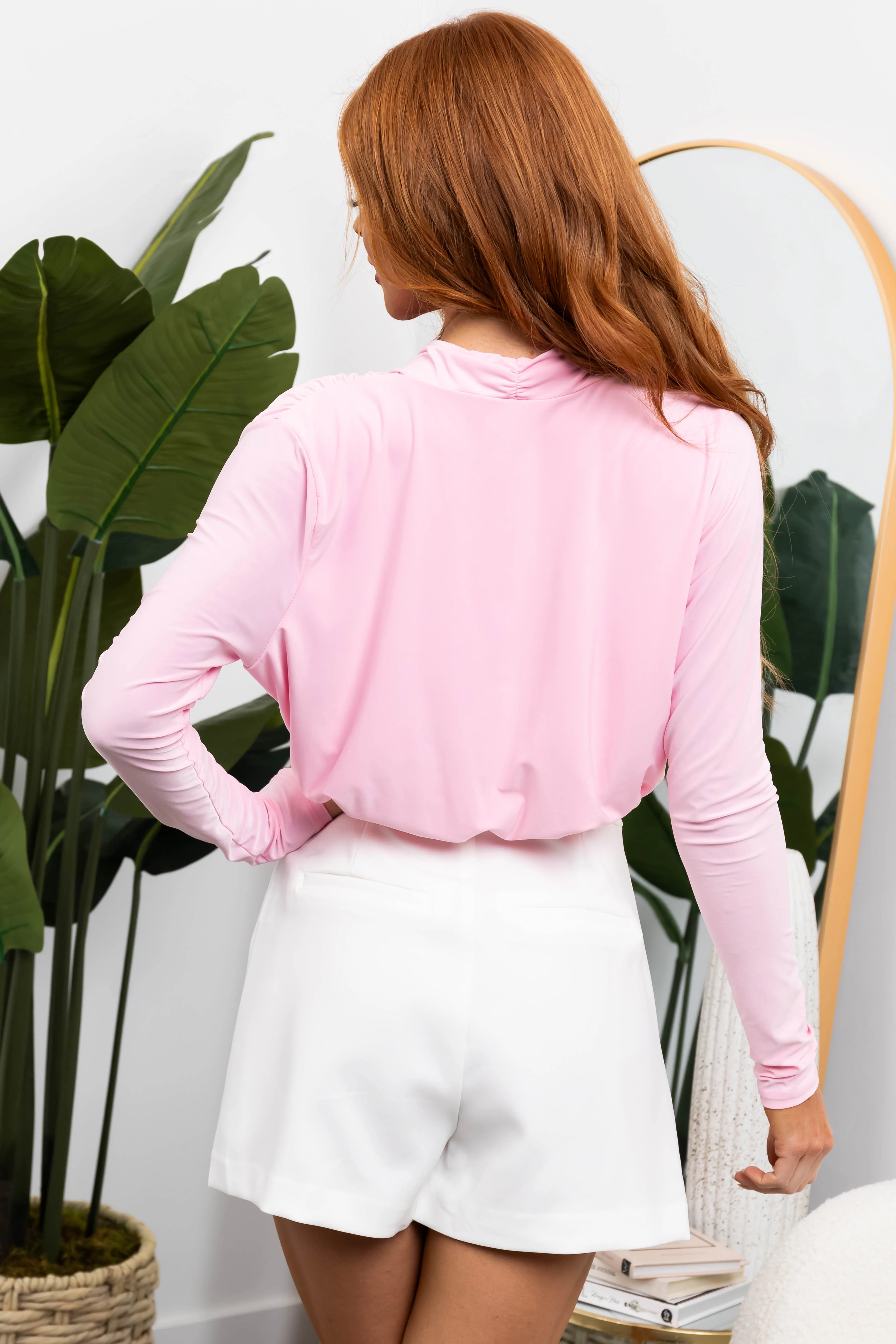 Baby Pink Surplice Long Sleeve Silky Bodysuit