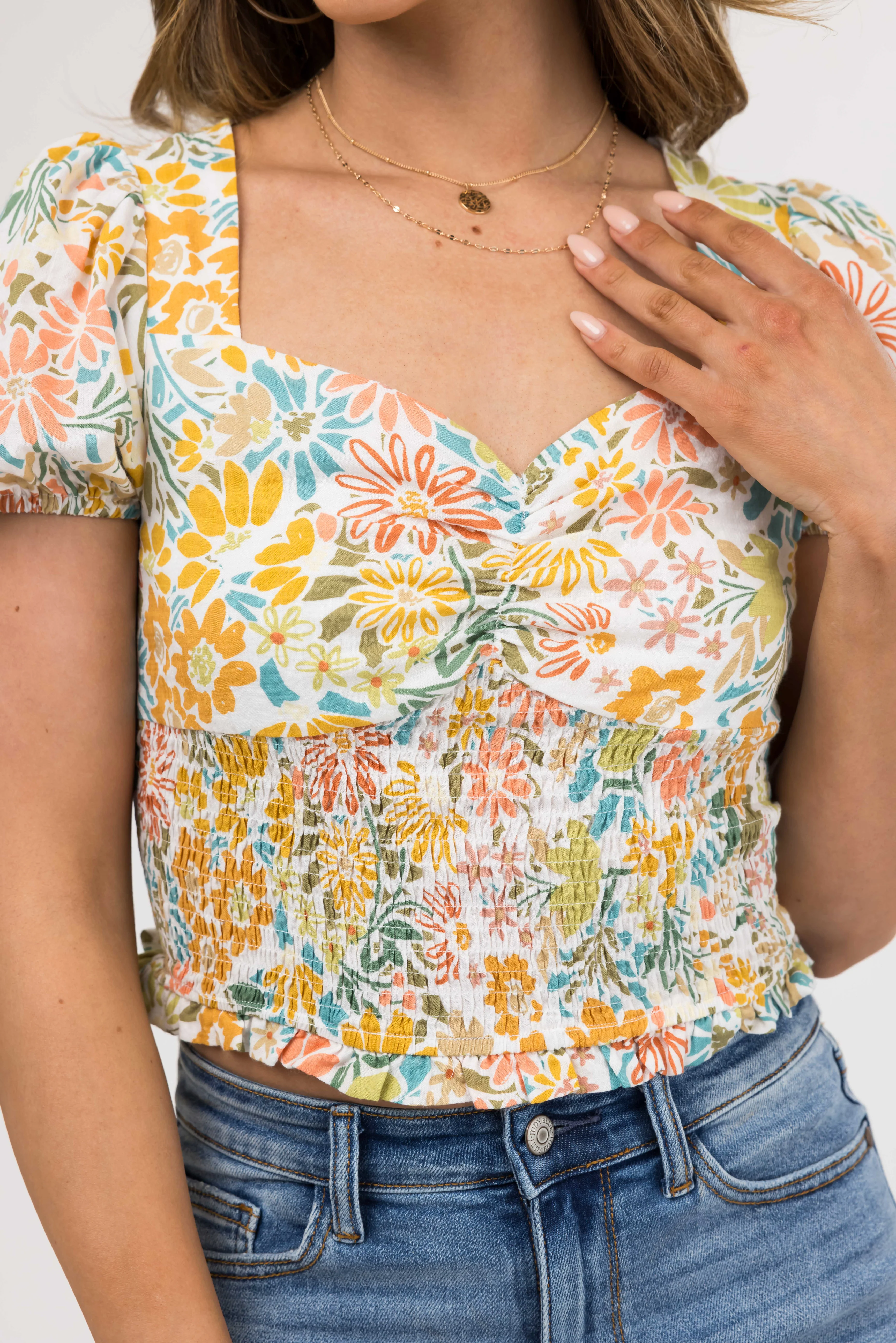 Ivory Floral Print Sweetheart Neck Crop Top