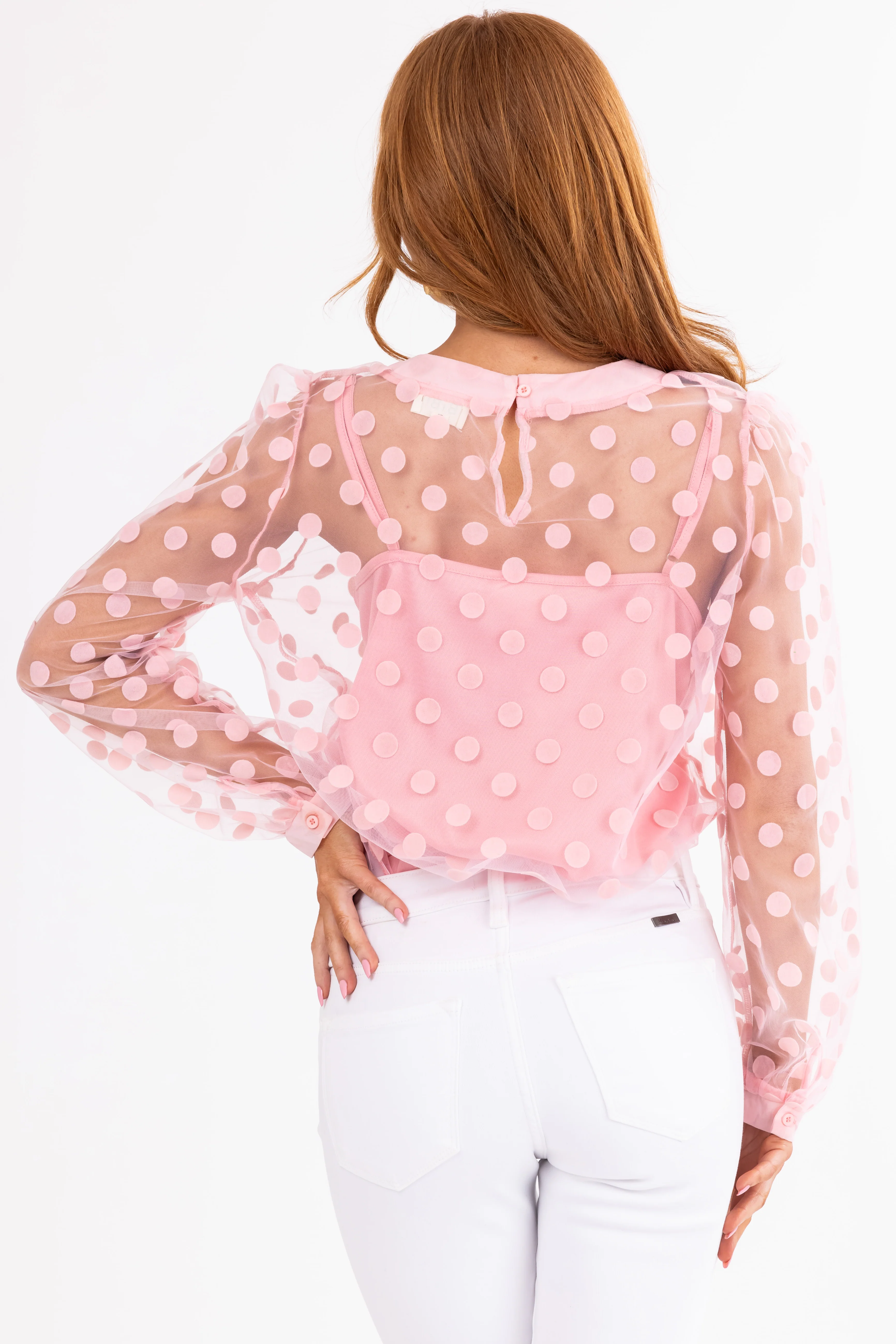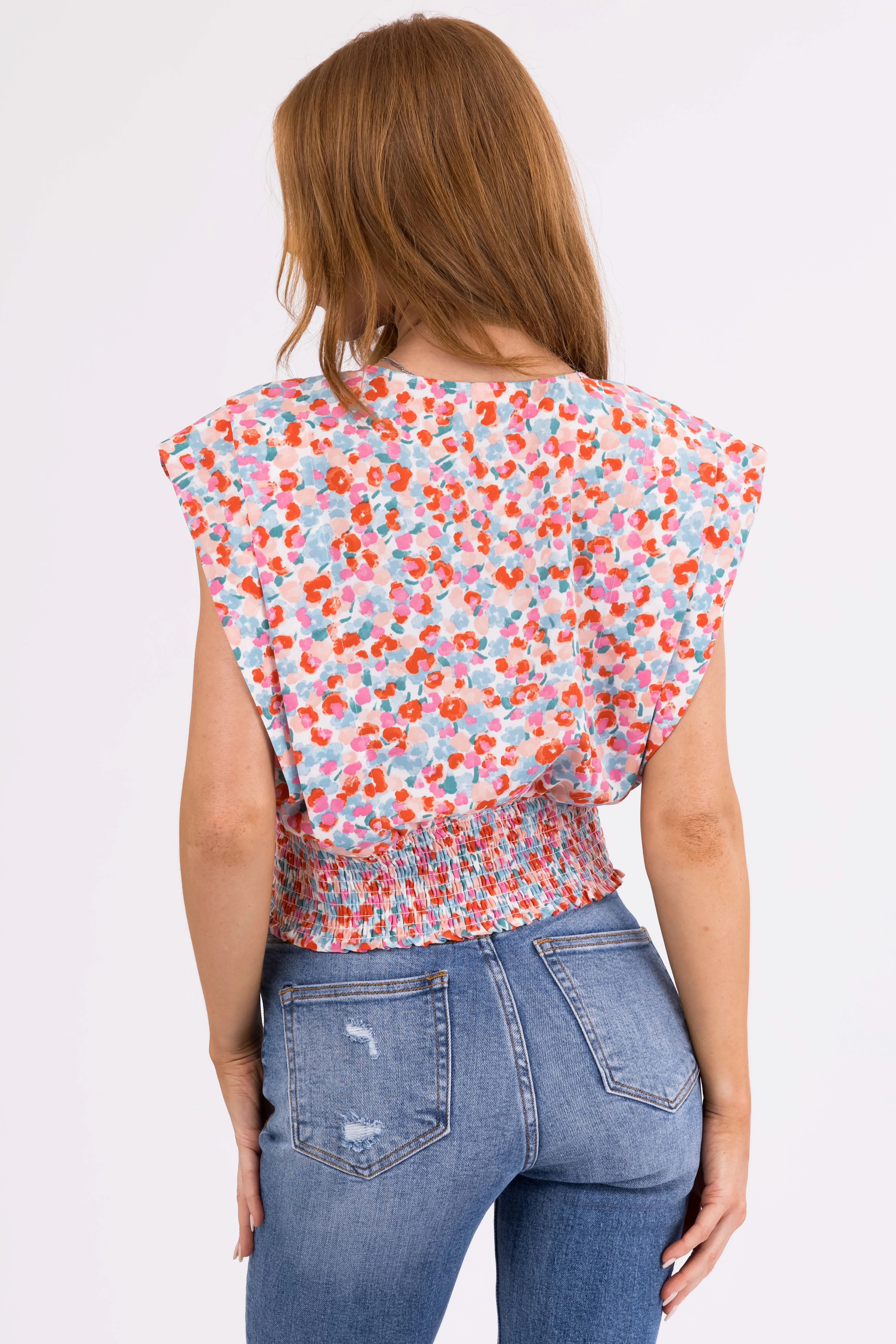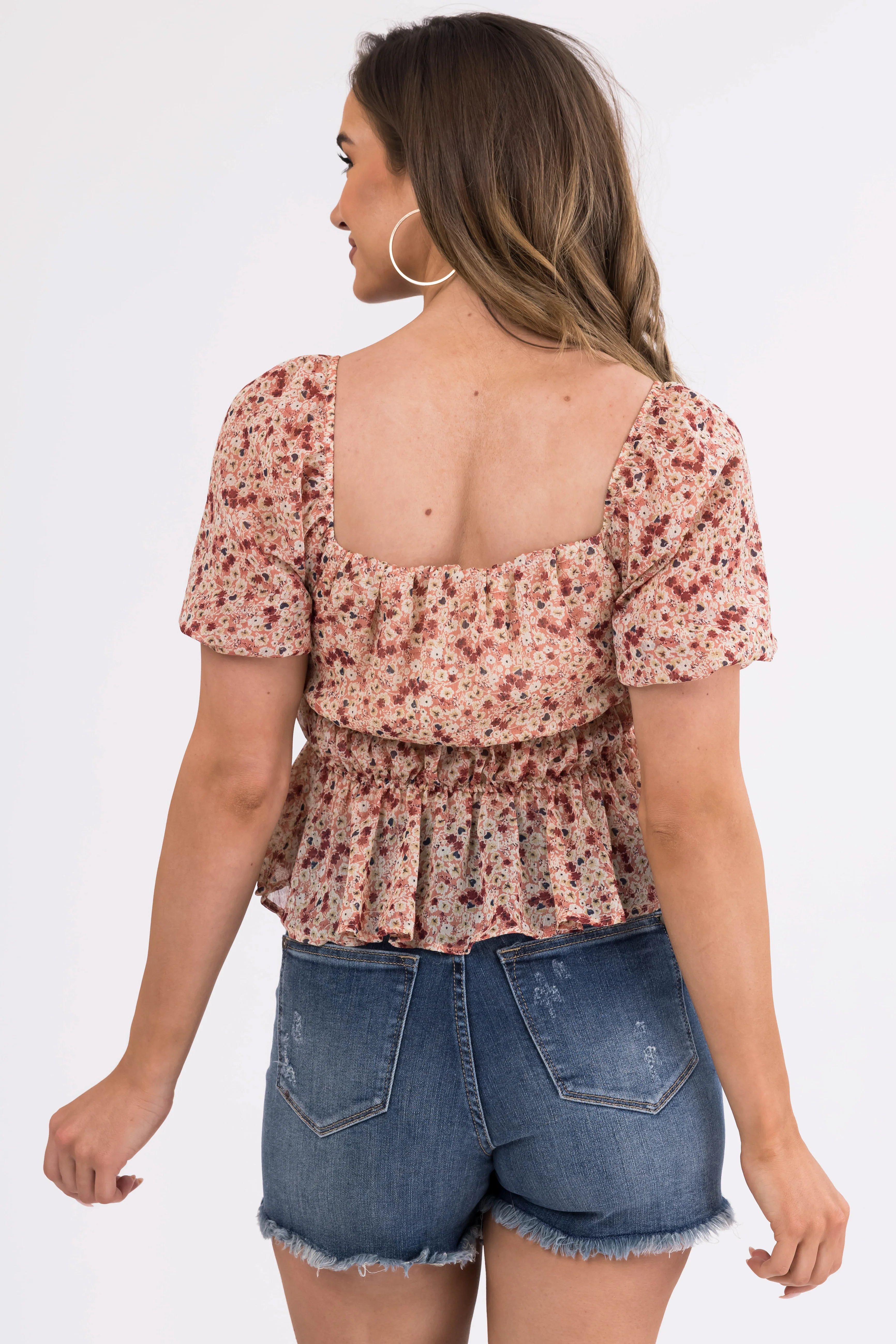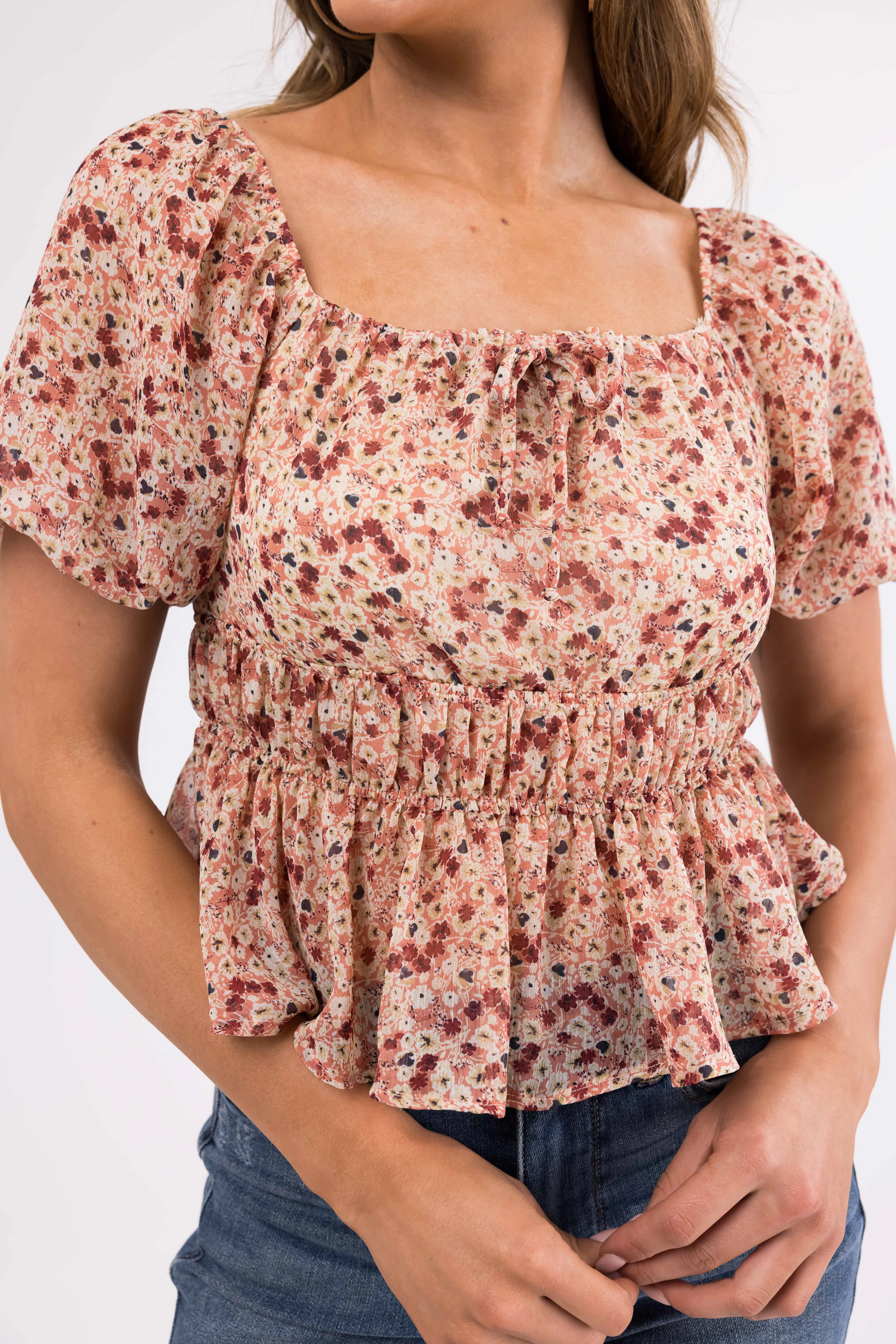 Hazy Coral Ditsy Floral Puff Sleeve Peplum Top