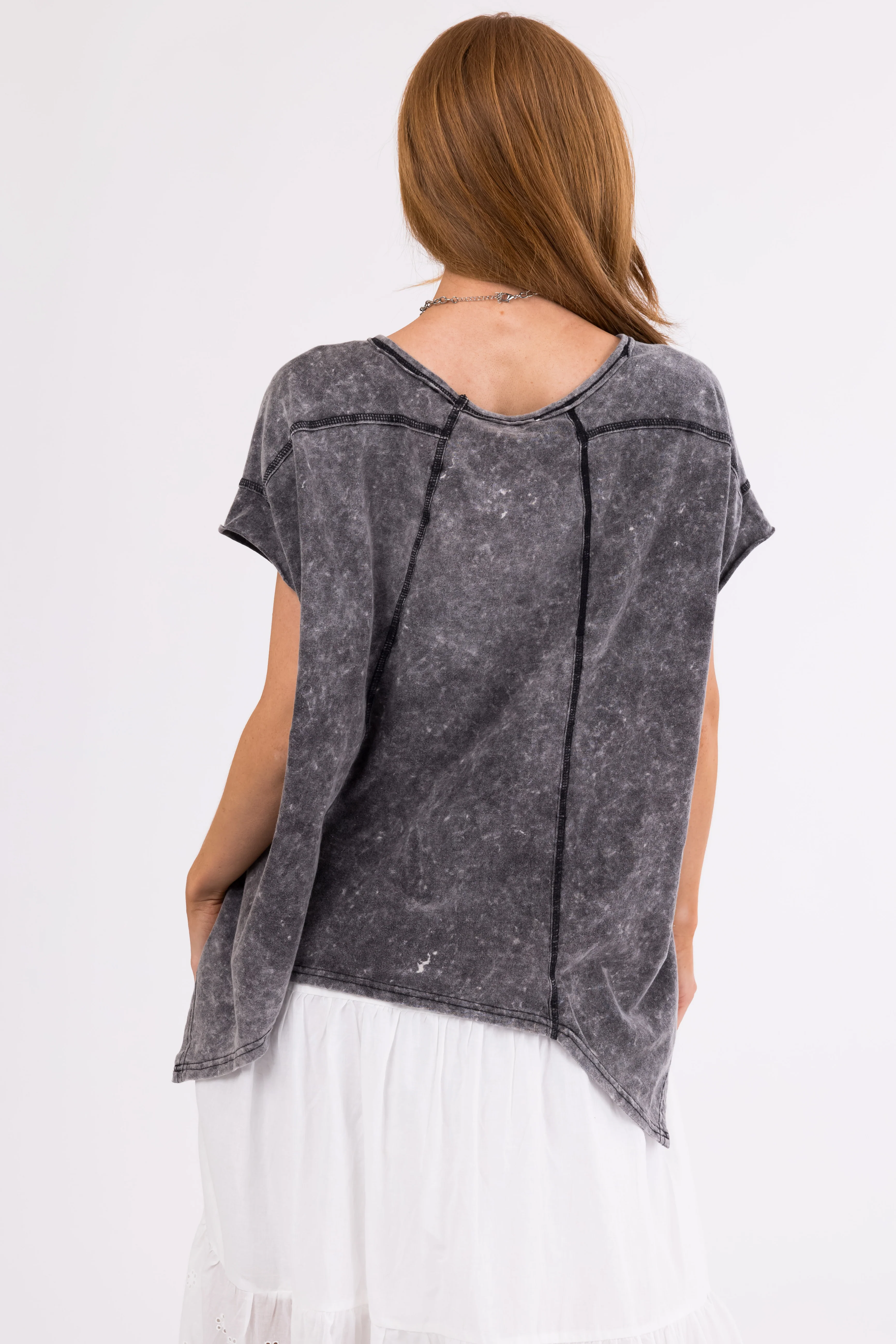Charcoal Acid Wash Curved Hem Soft Knit Top