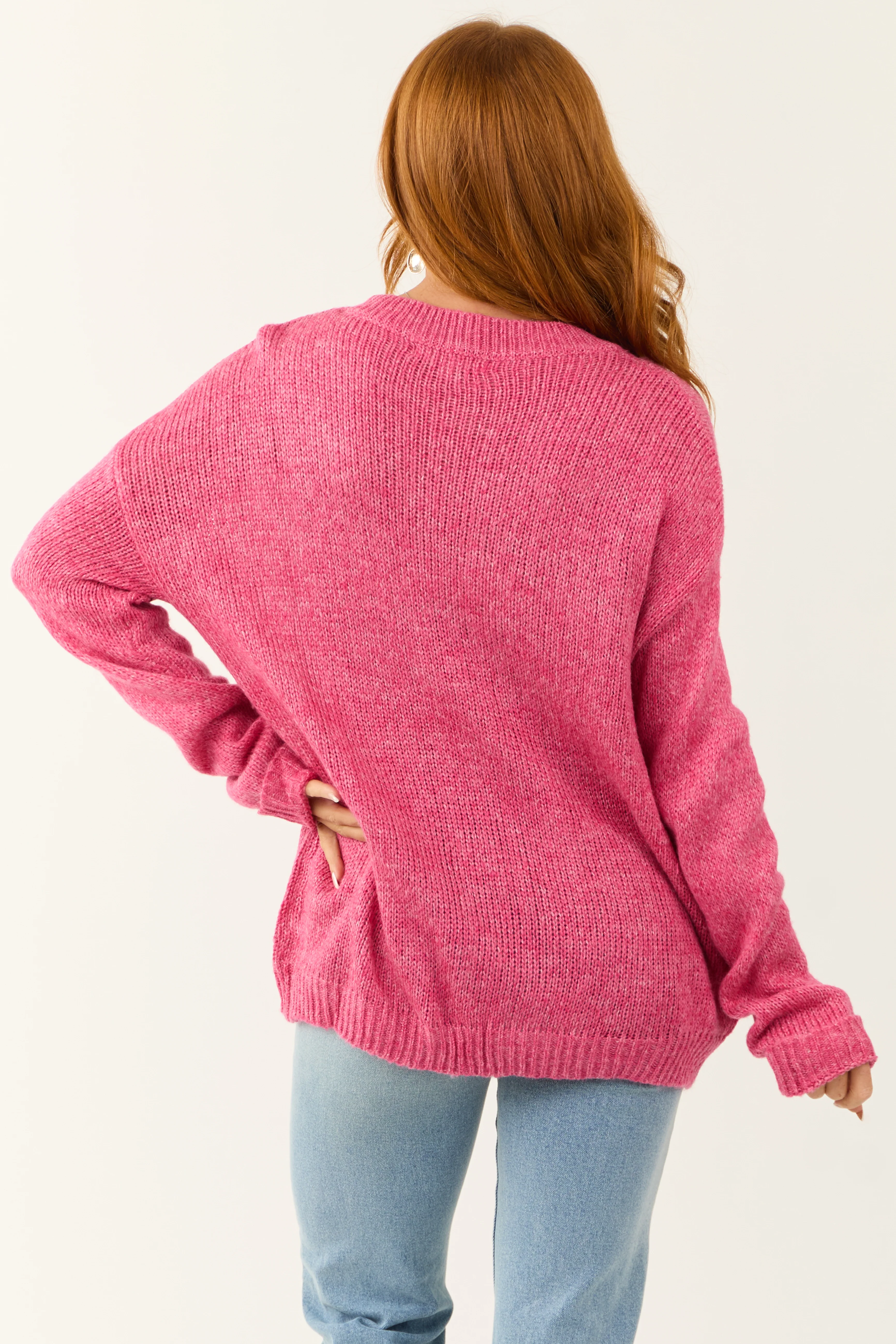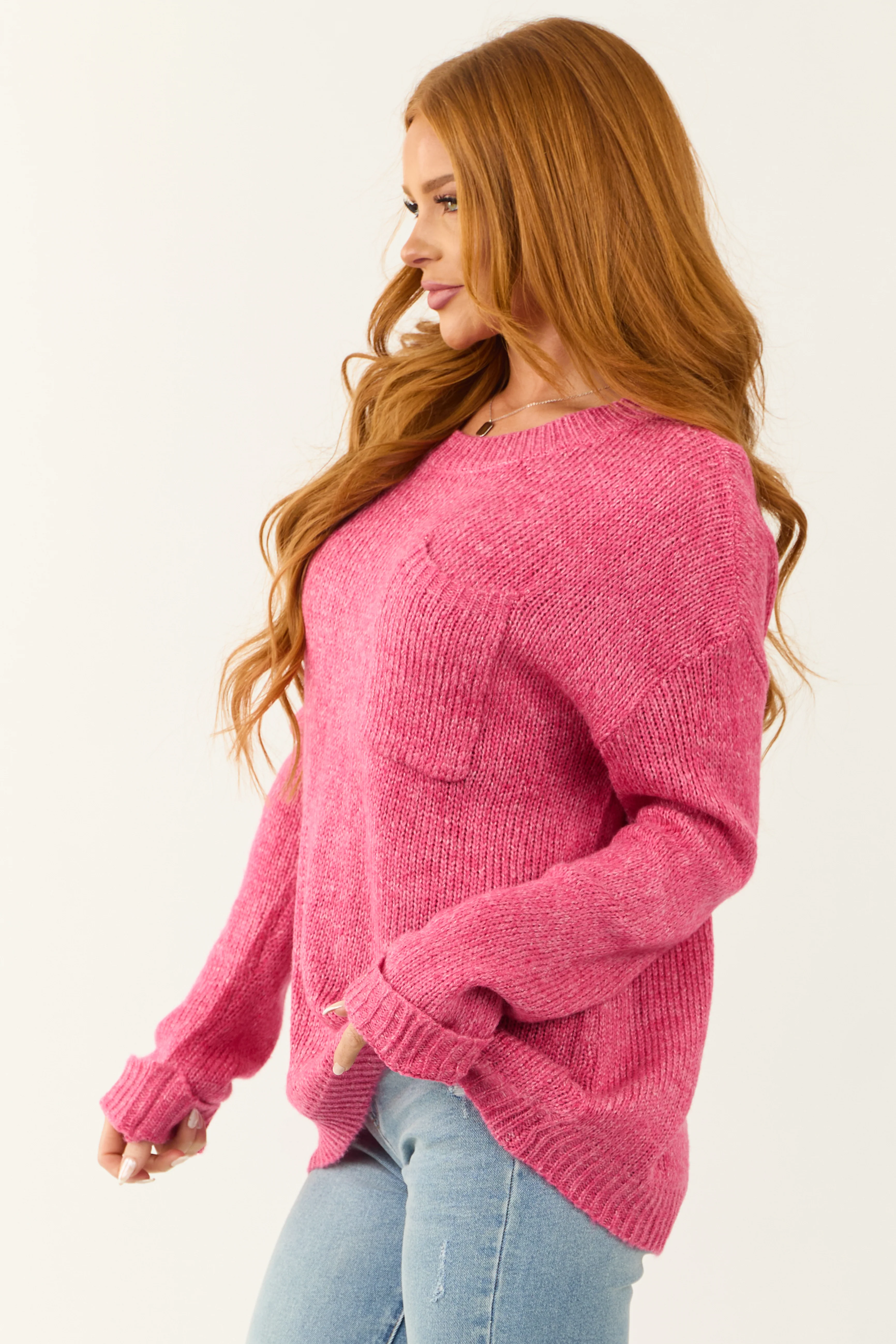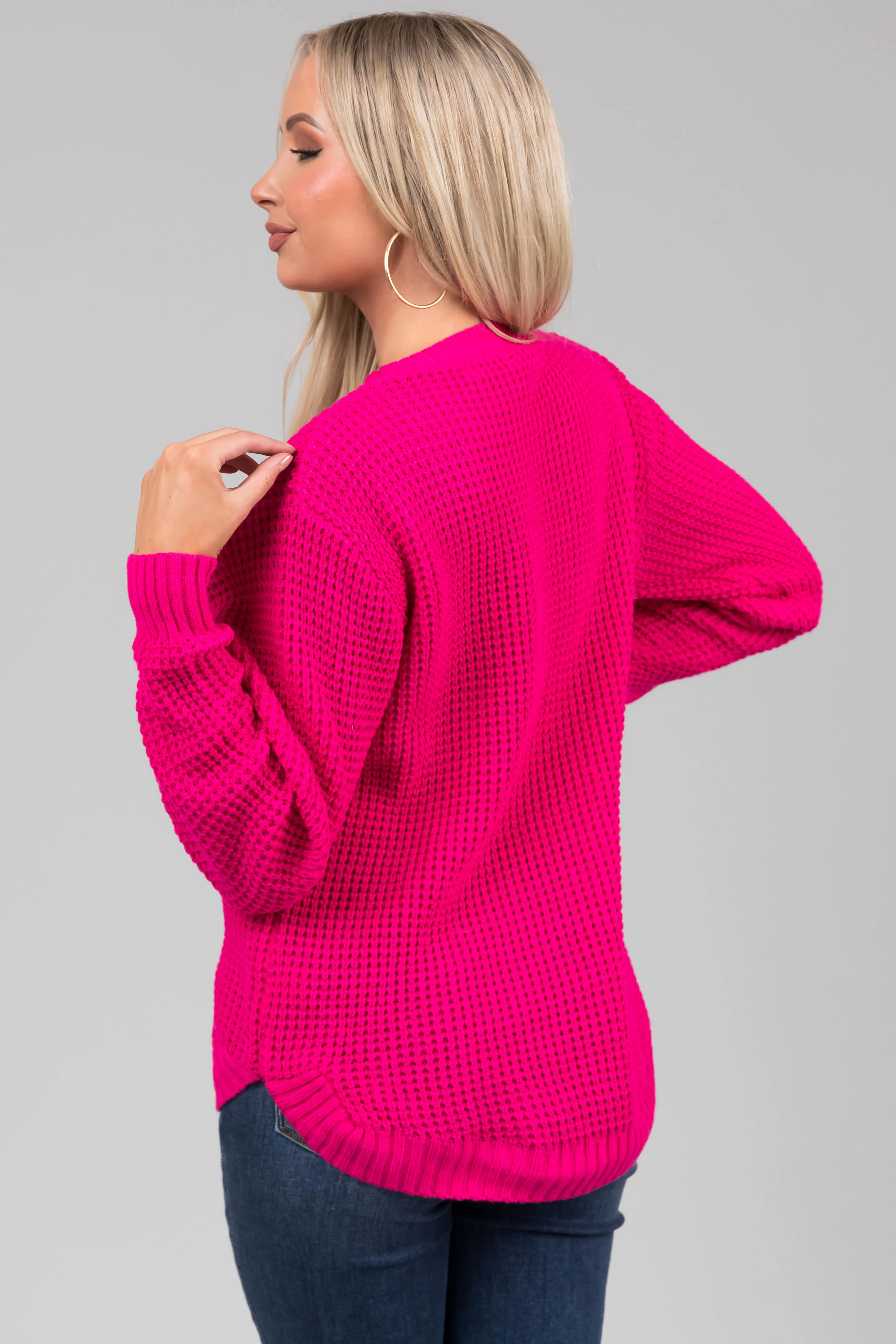 Hot Pink Thick Waffle Knit Curved Hem Sweater