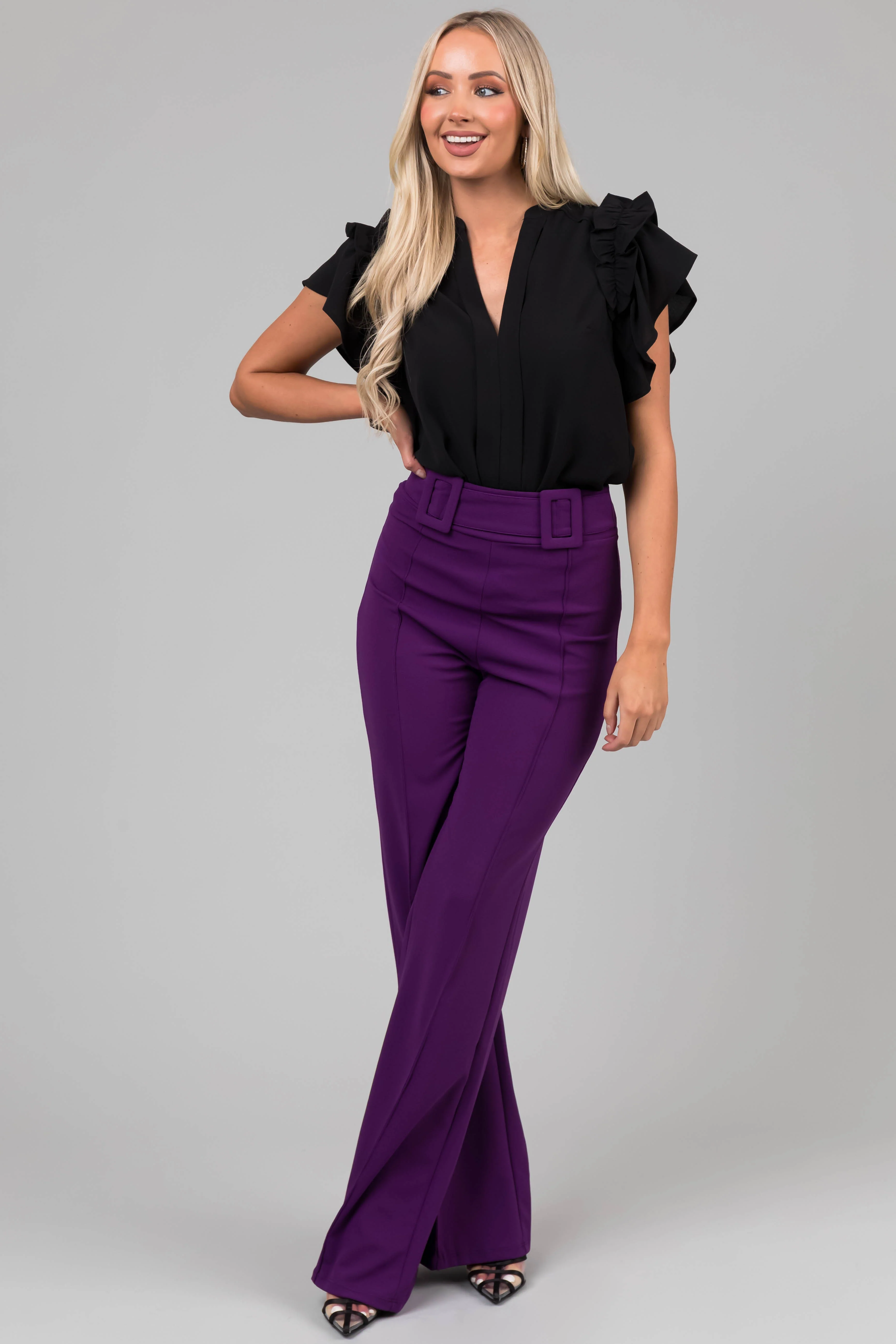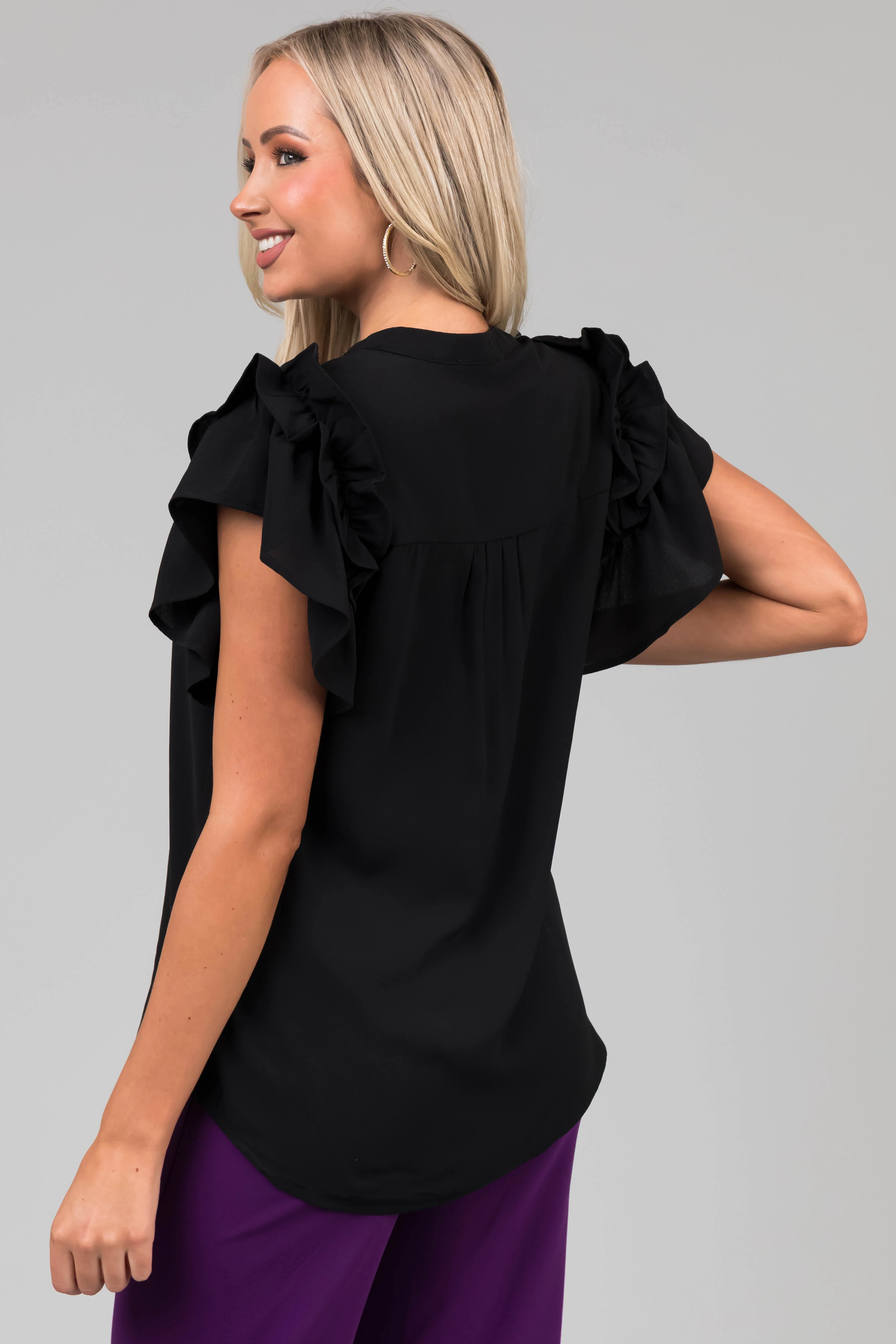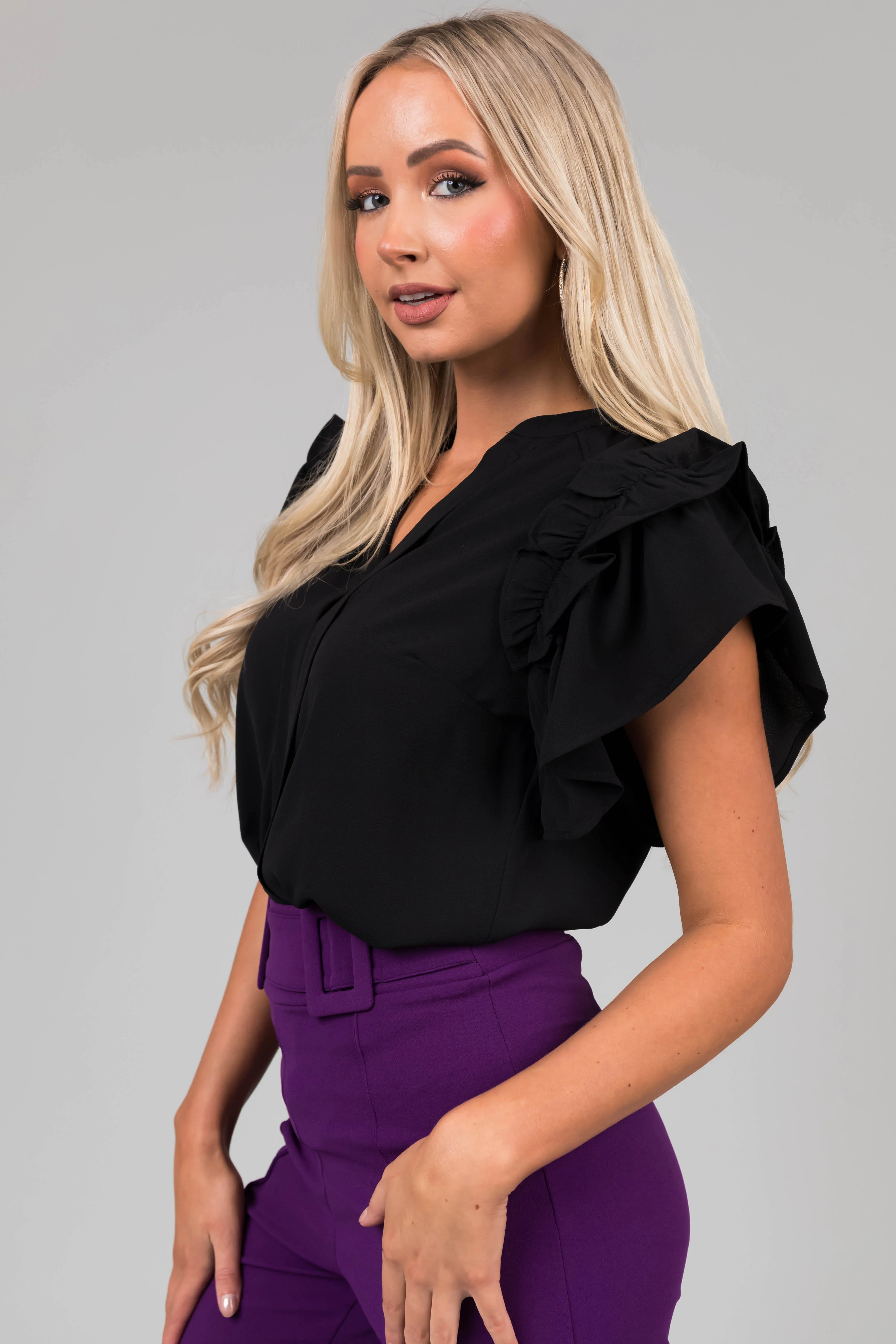 Black Short Ruffle Sleeve V Neck Blouse