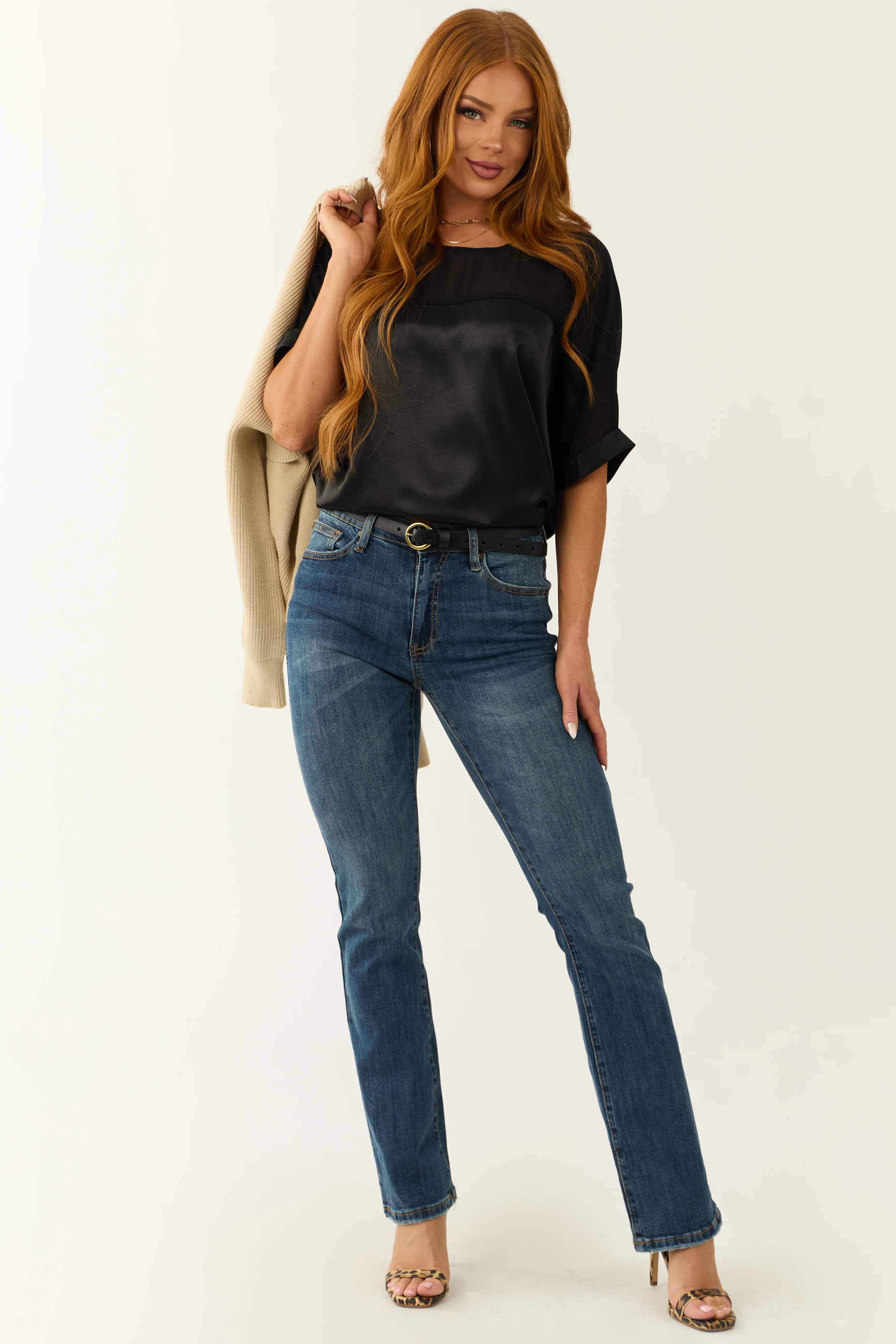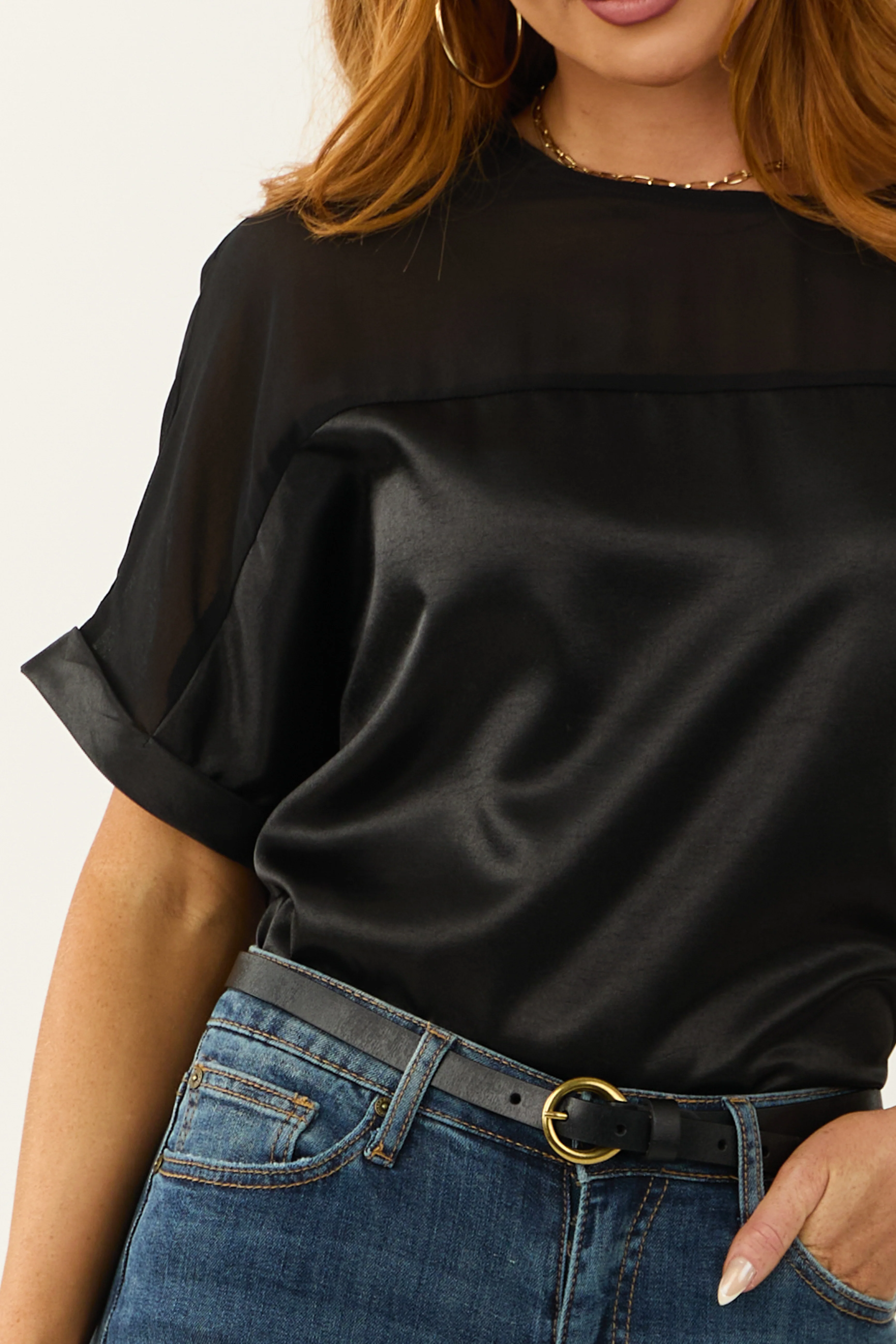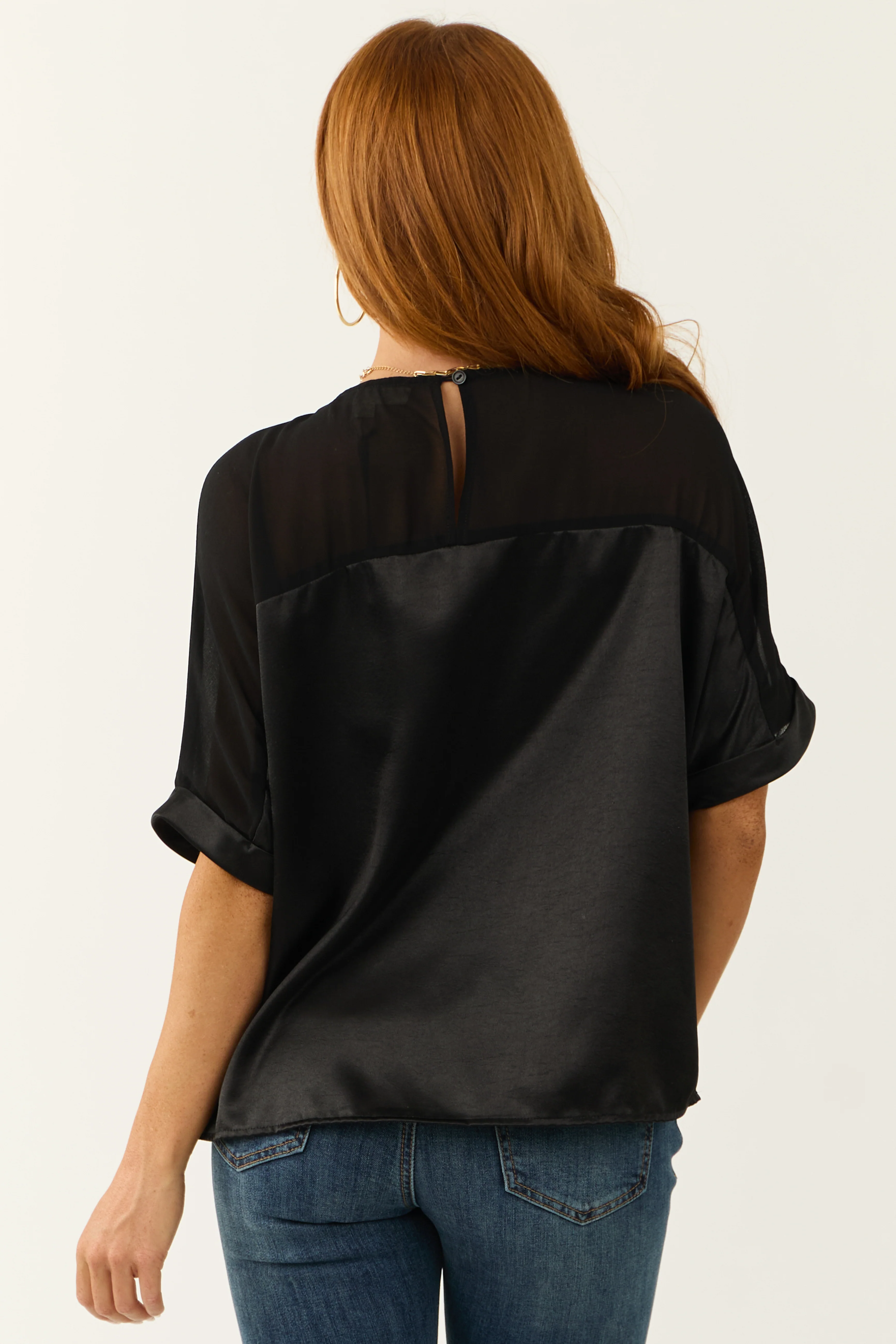 Black Contrast Yoke Cuffed Sleeve Satin Blouse