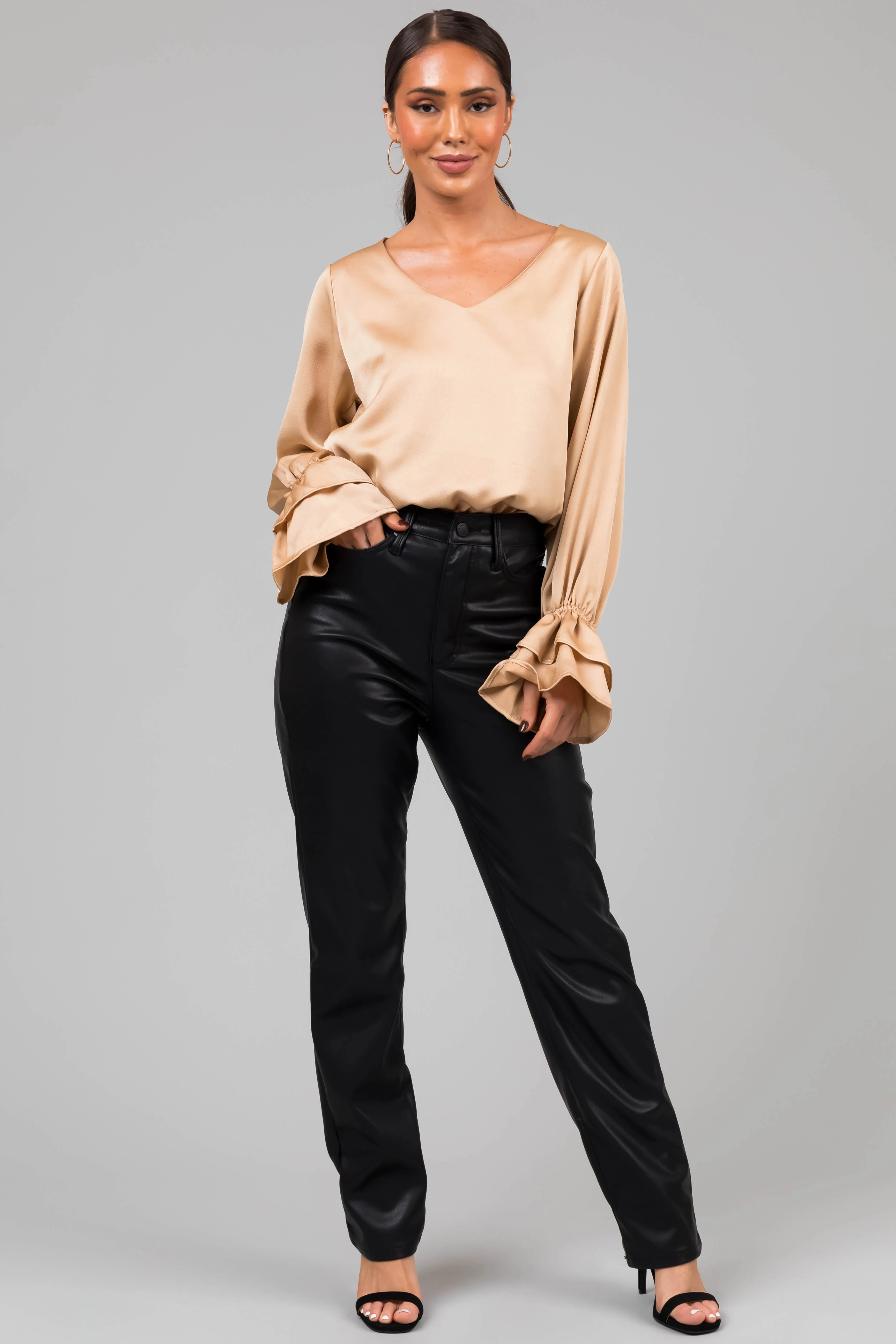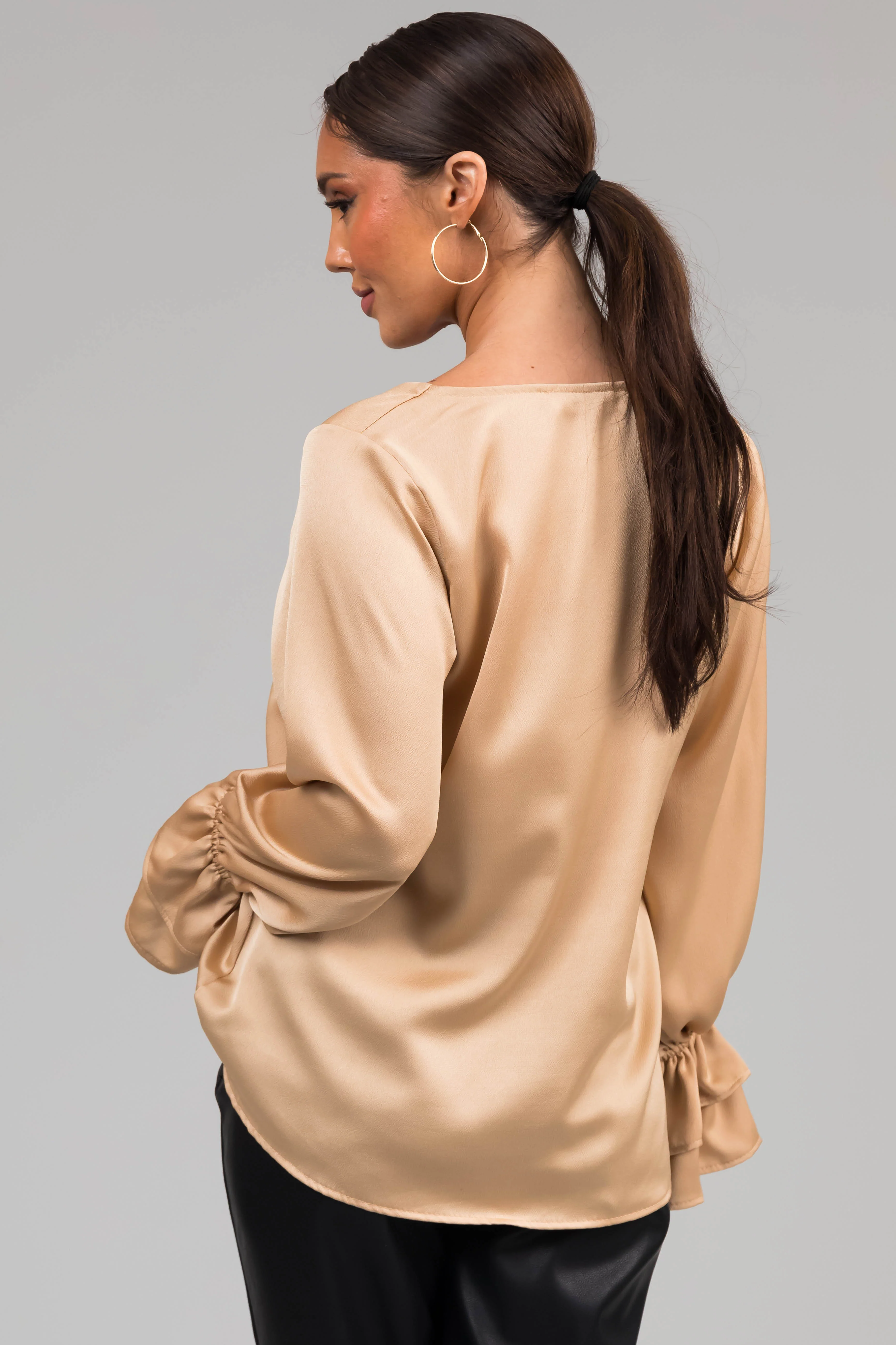 Gold V Neck Ruffle Cuff Satin Blouse