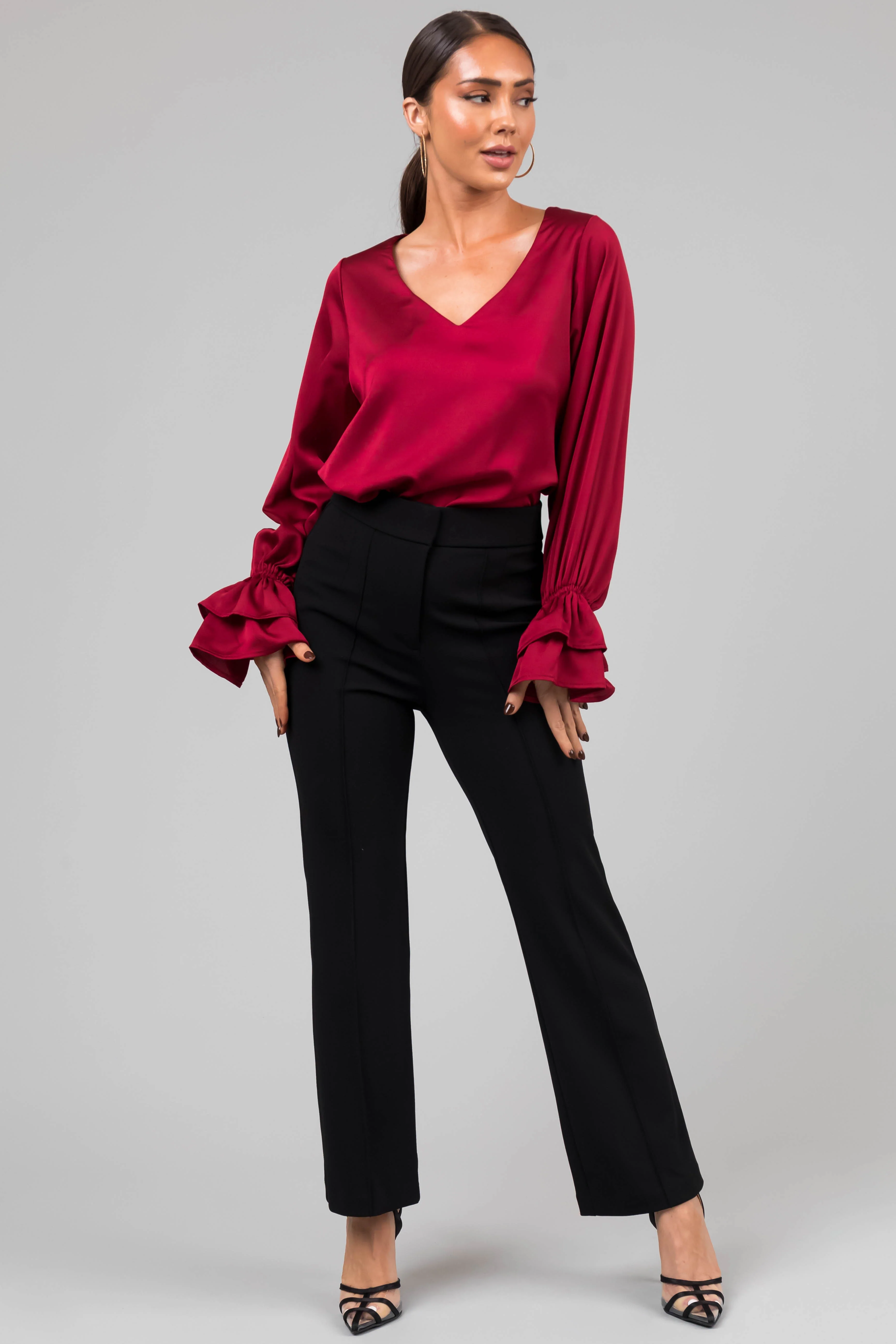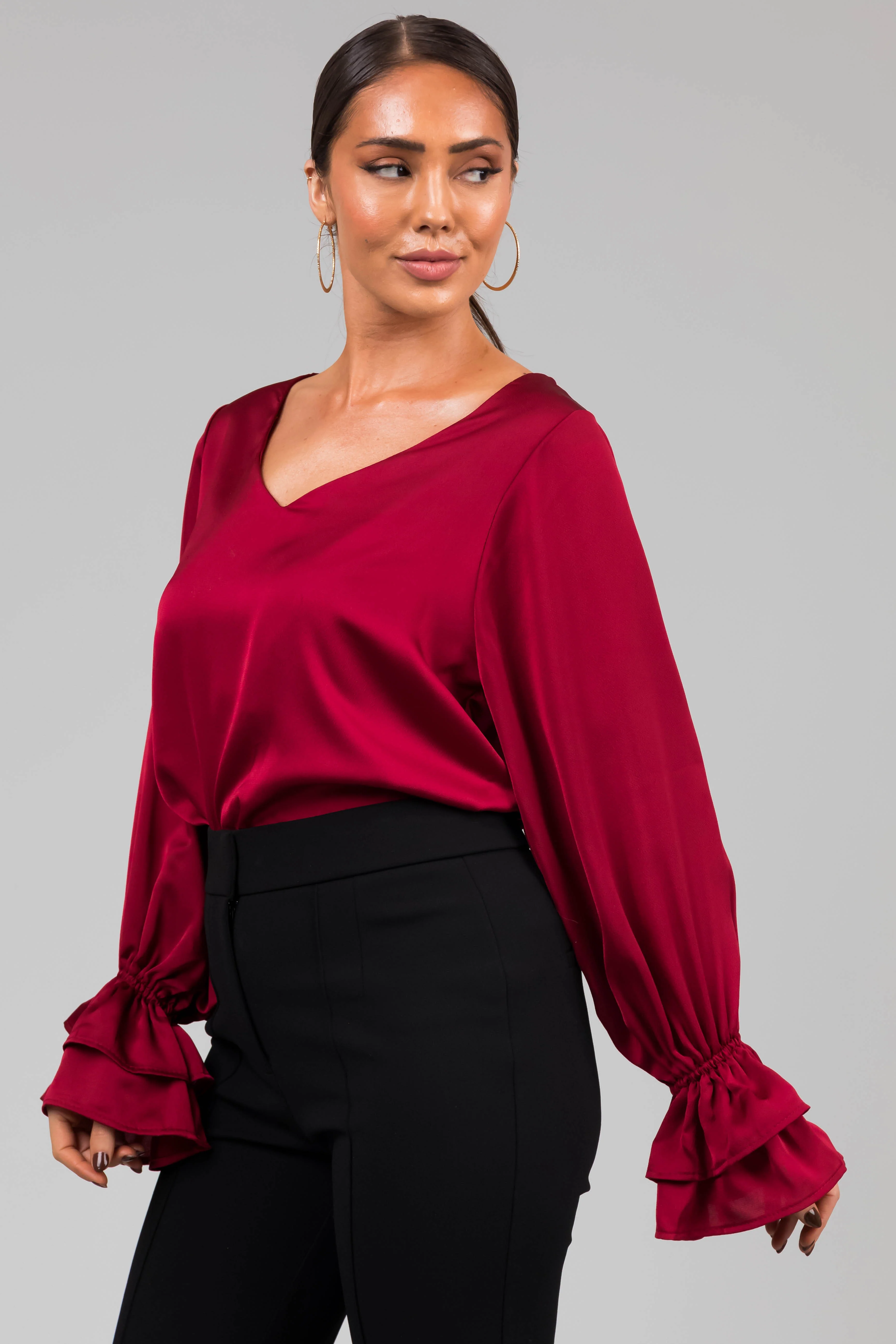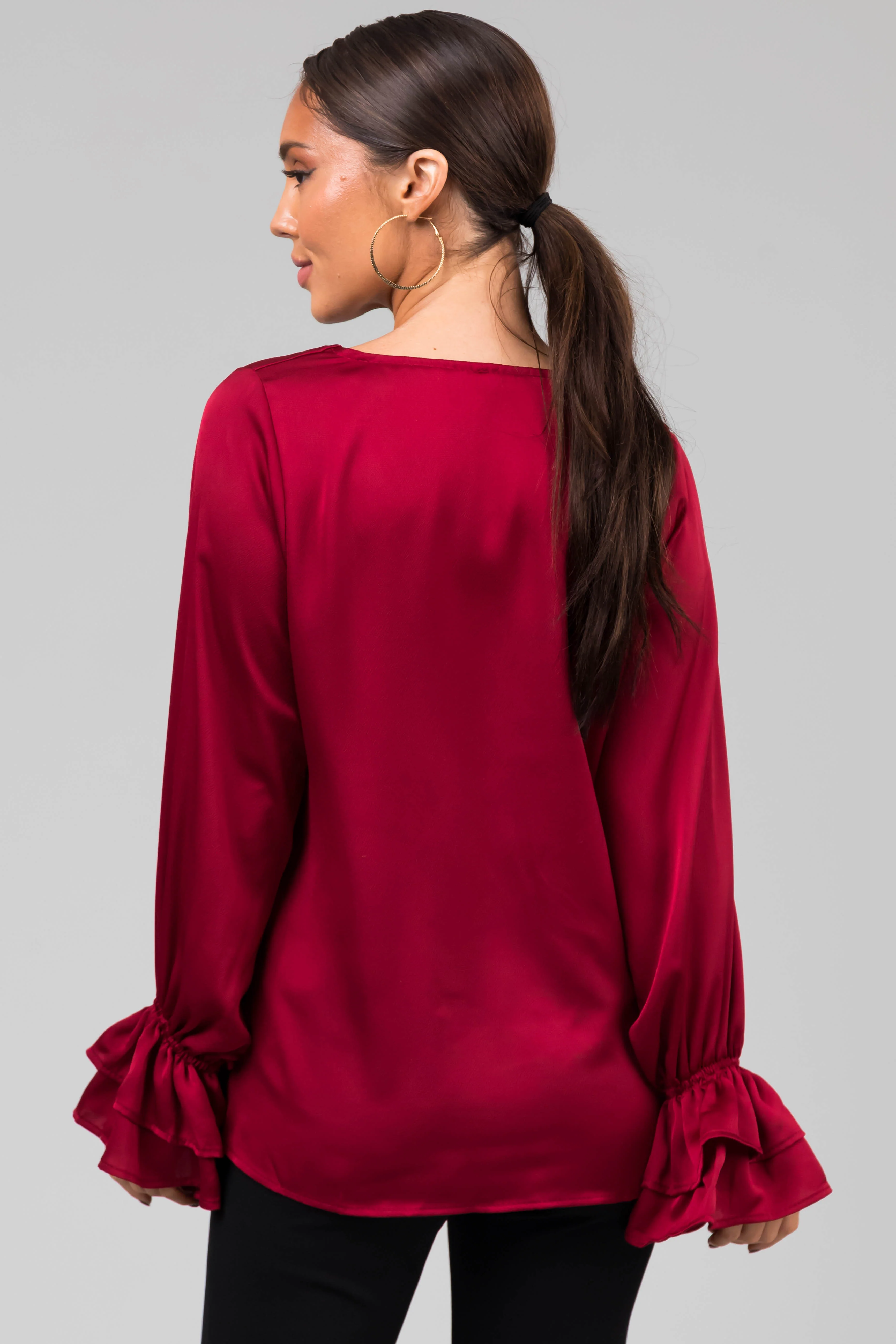 Burgundy V Neck Ruffle Cuff Satin Blouse