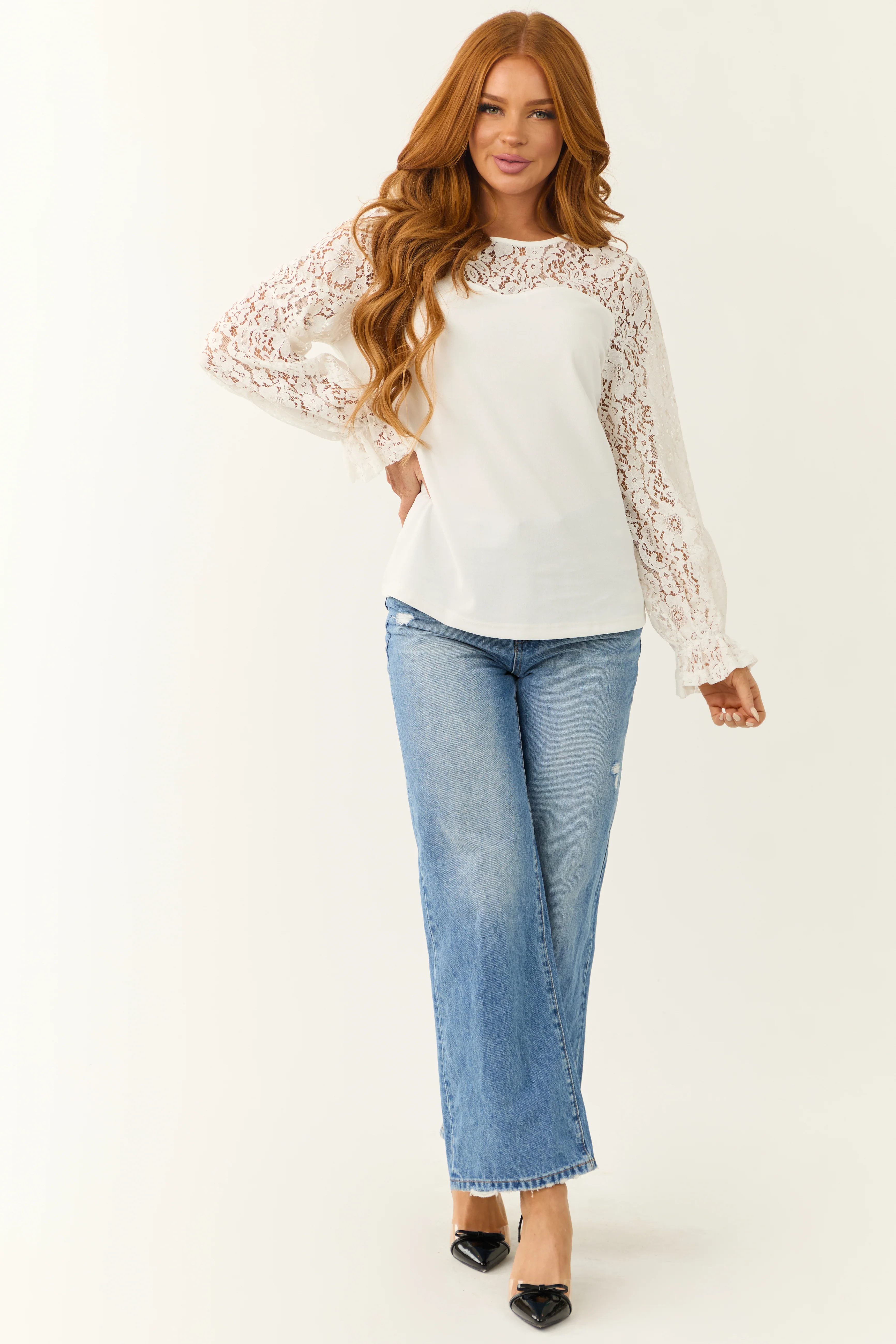 Off White Sweetheart Lace Long Sleeve Top