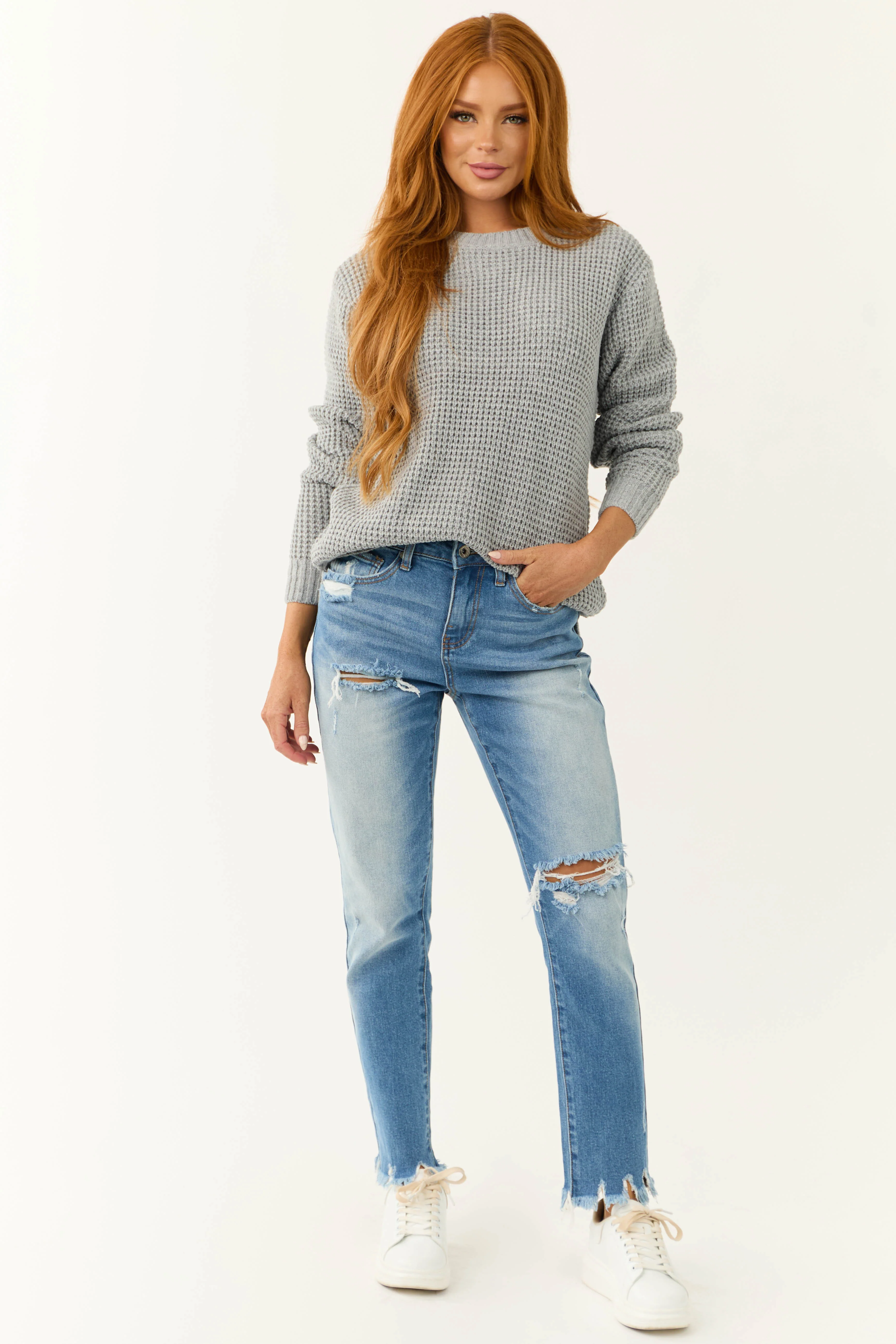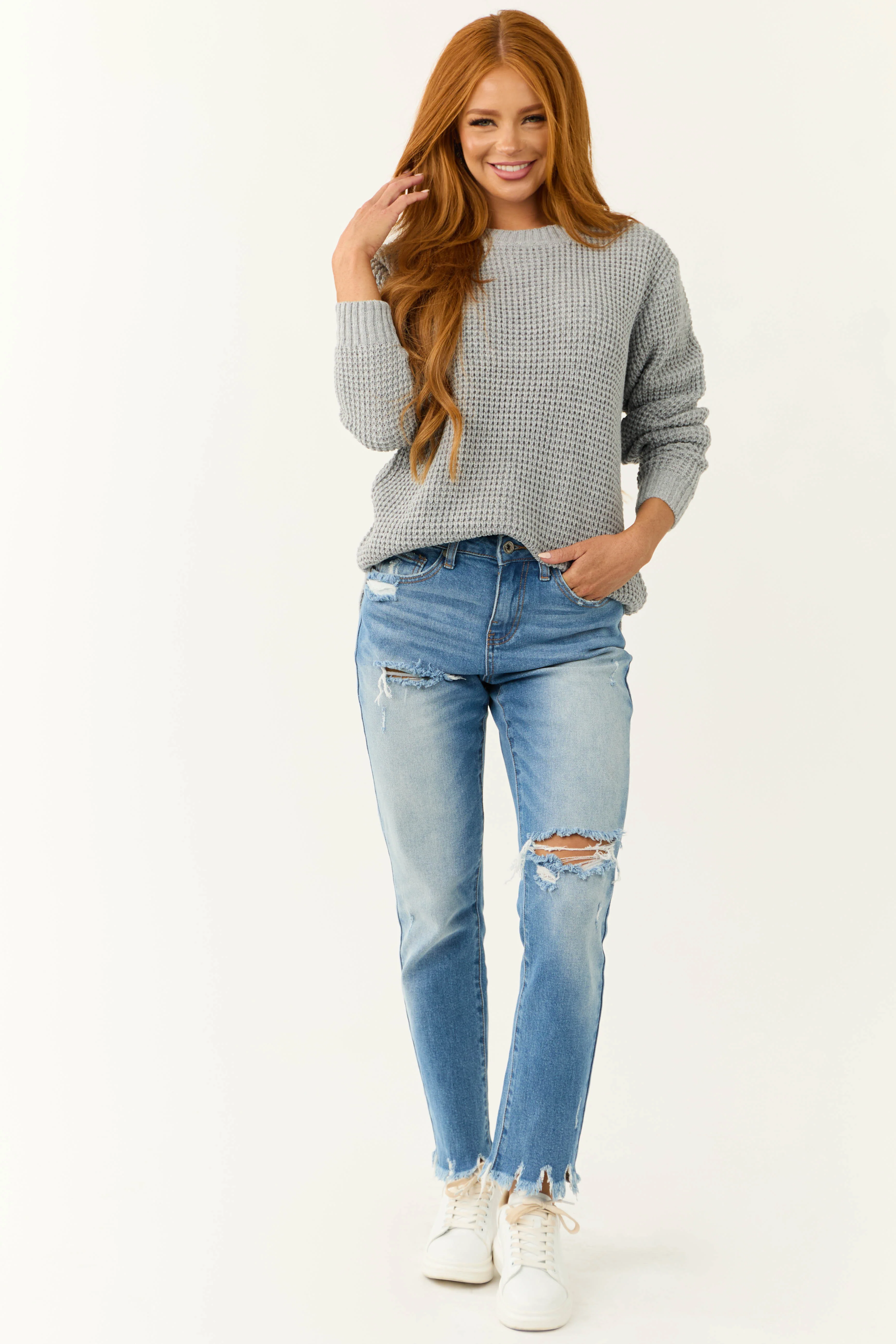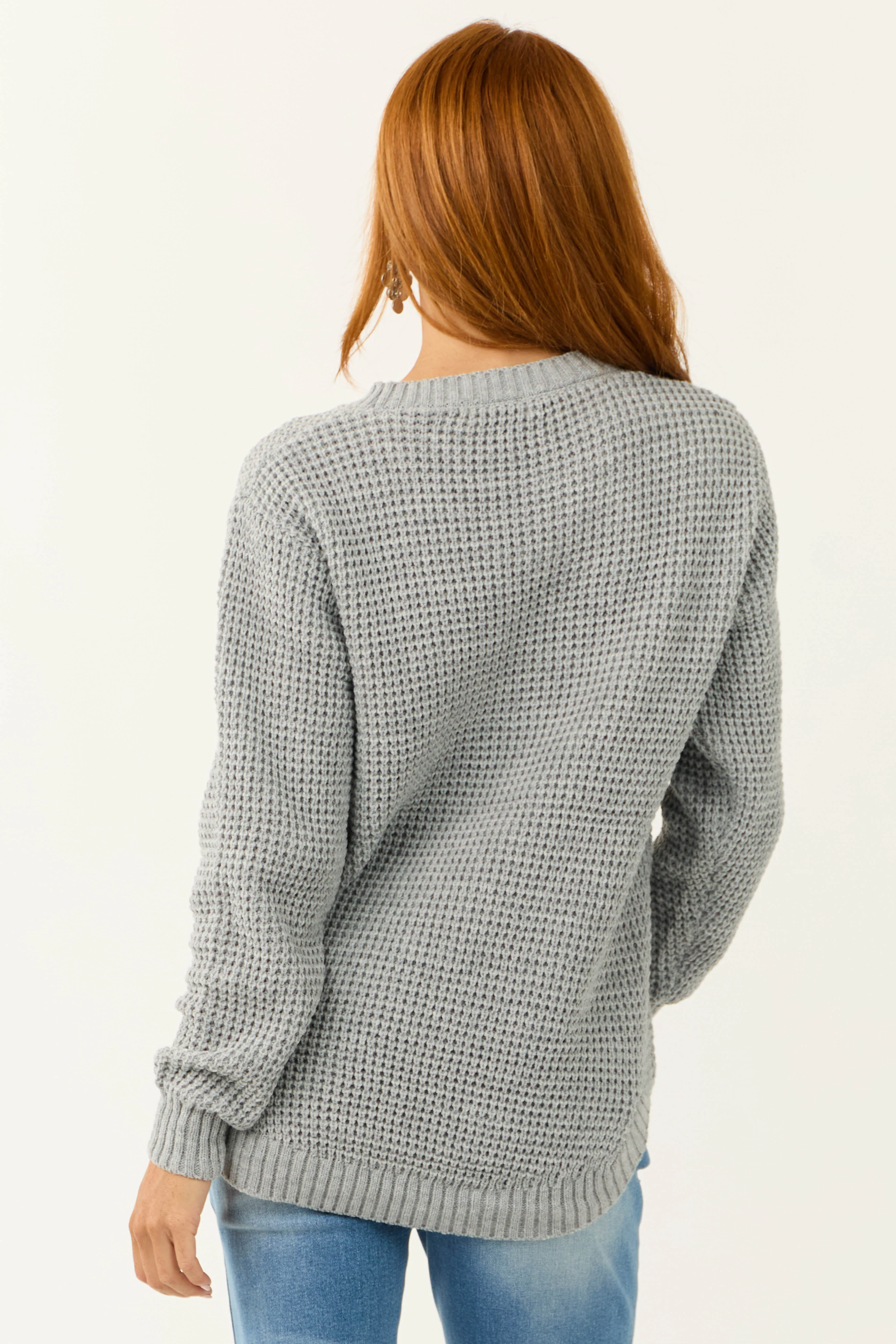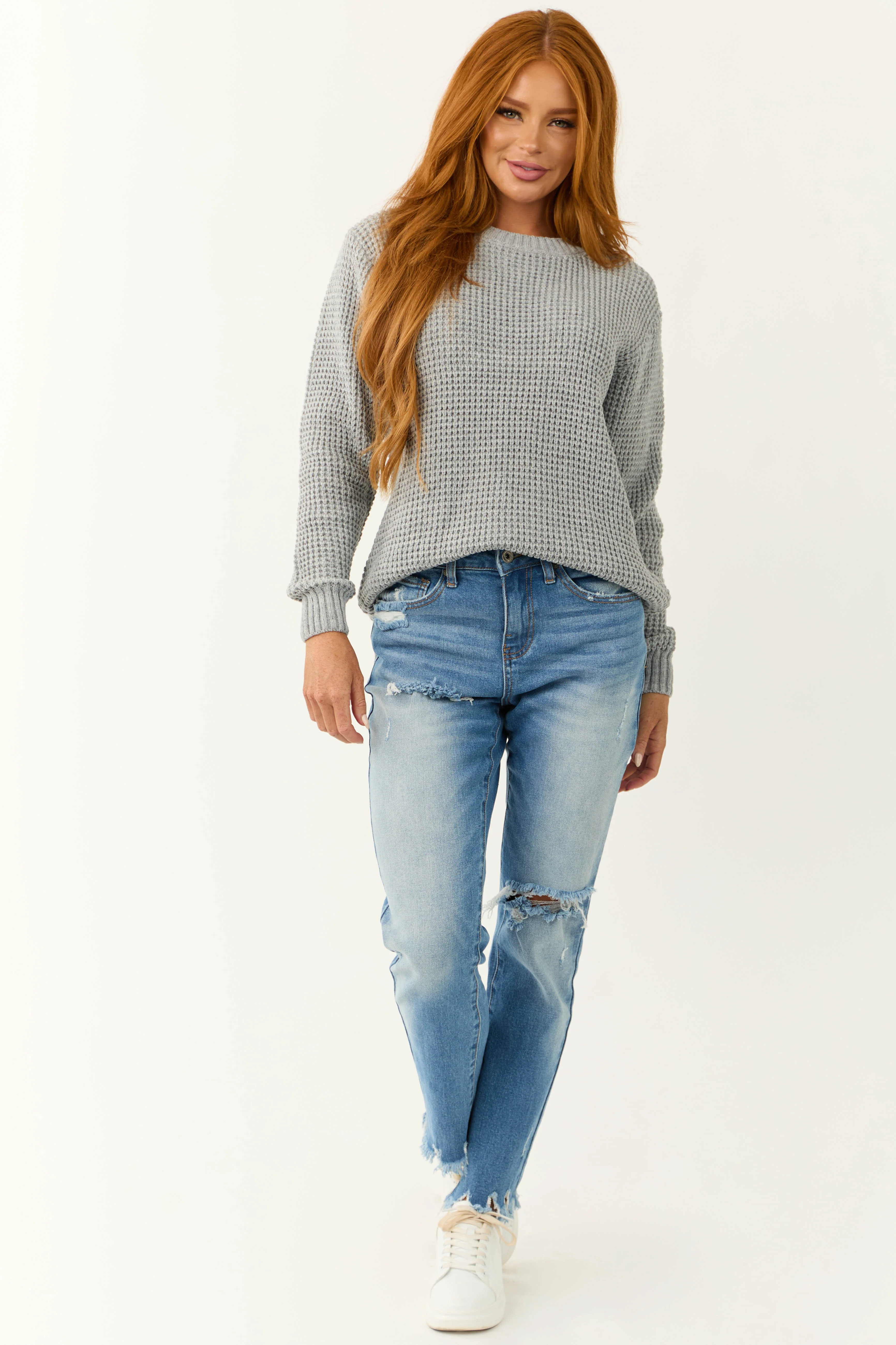 Dove Grey Thick Waffle Knit Curved Hem Sweater