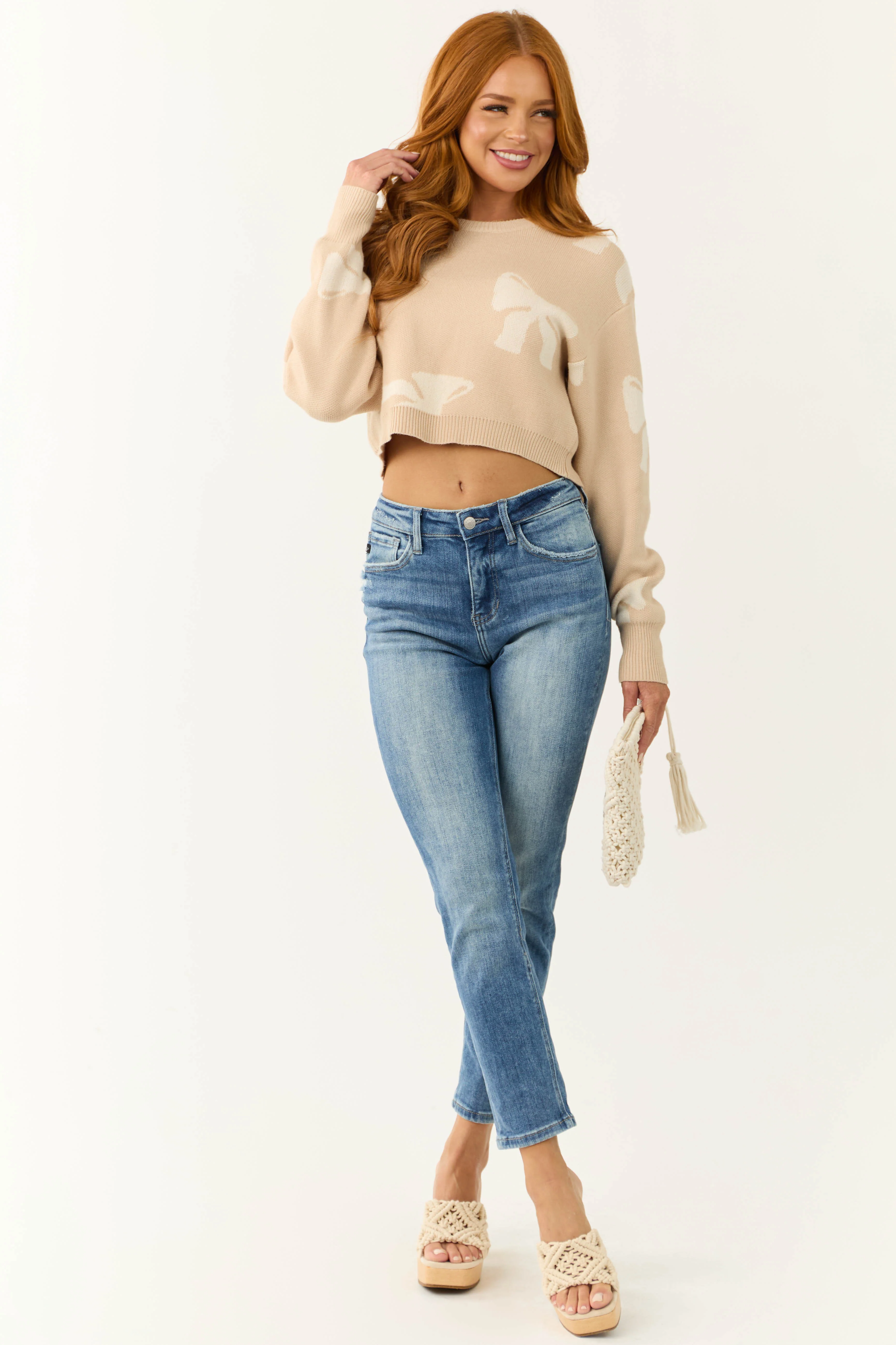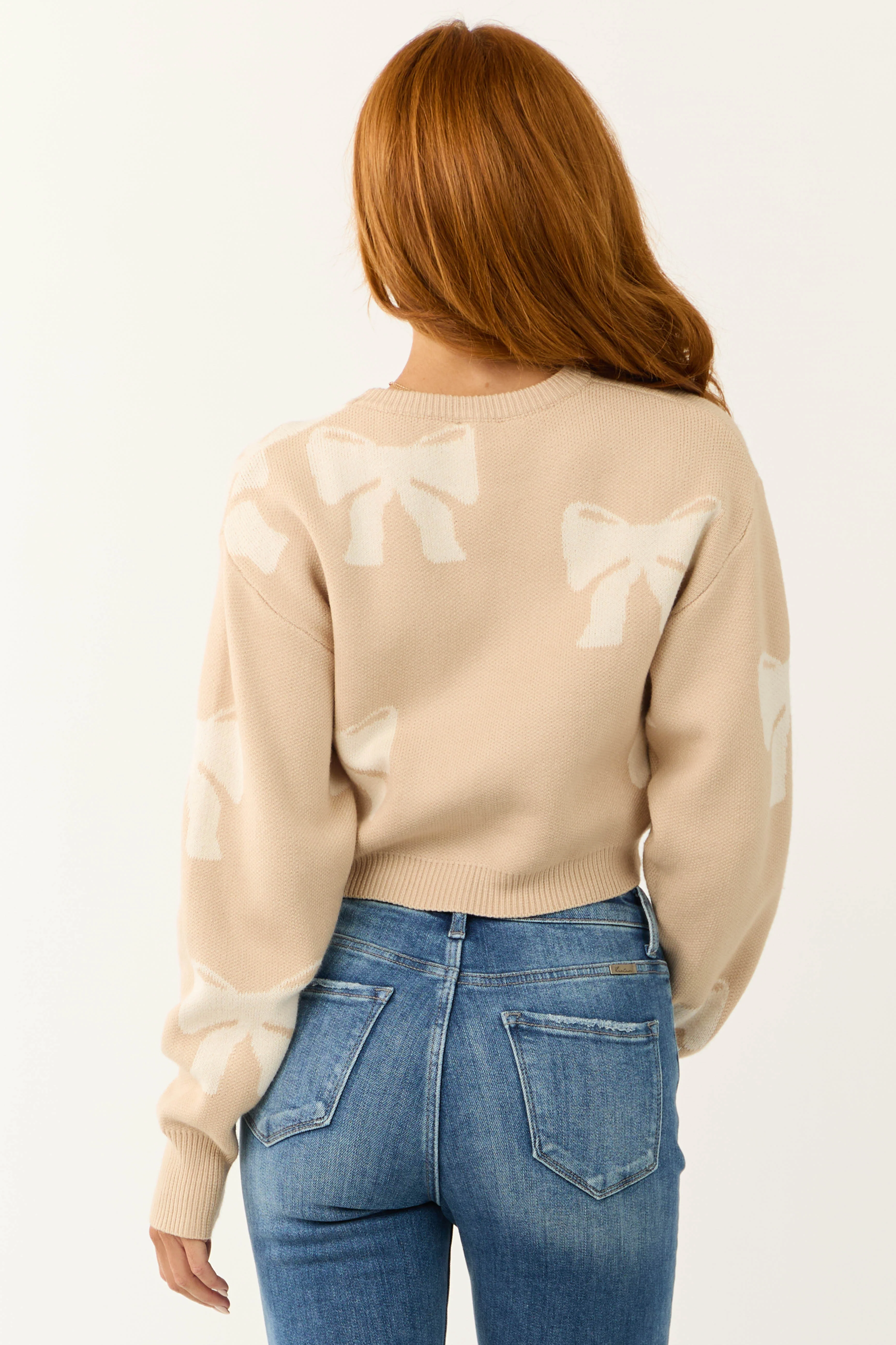 Beige Bow Print Cropped Sweater