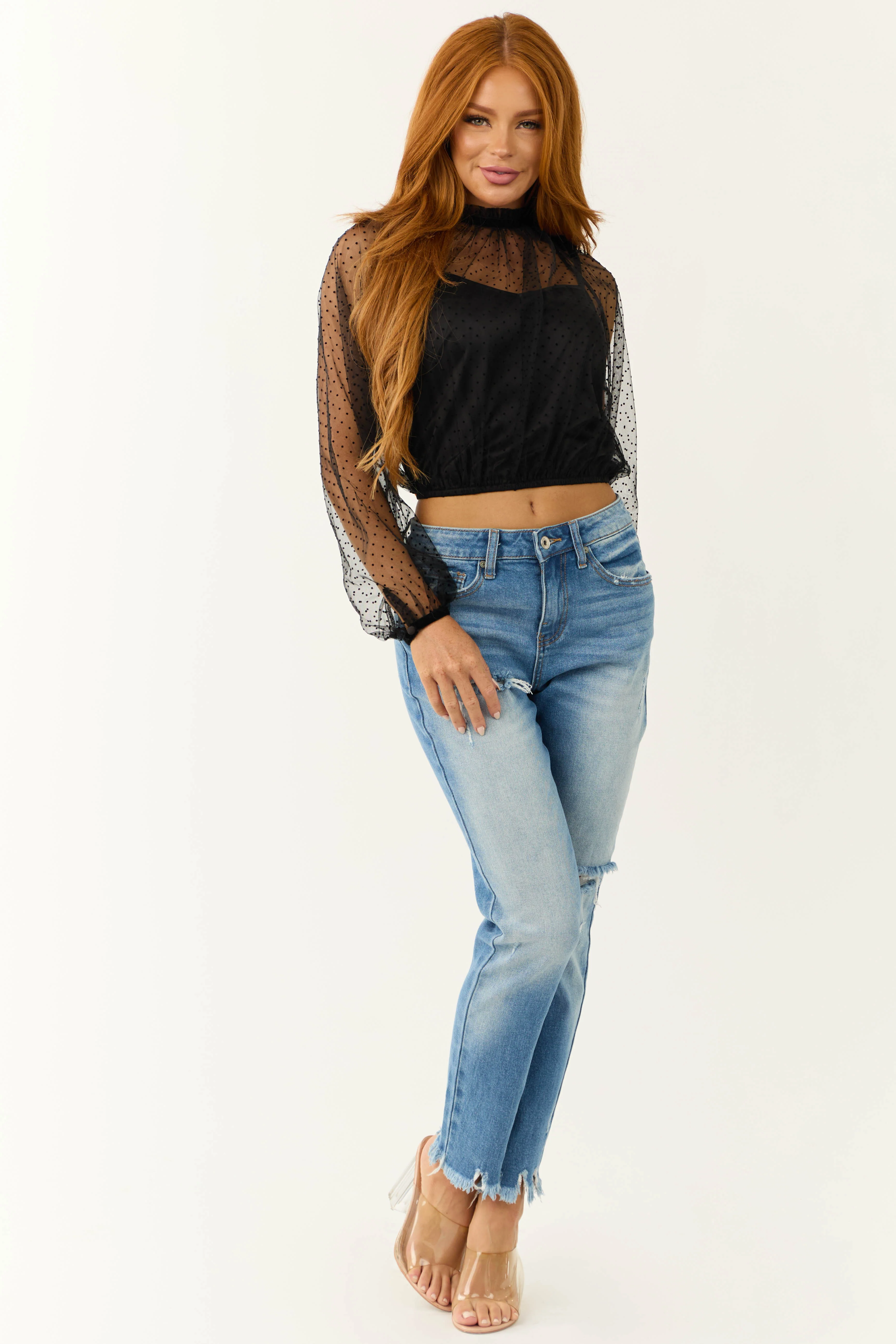 Black Polka Dot Textured Long Sleeve Mesh Top