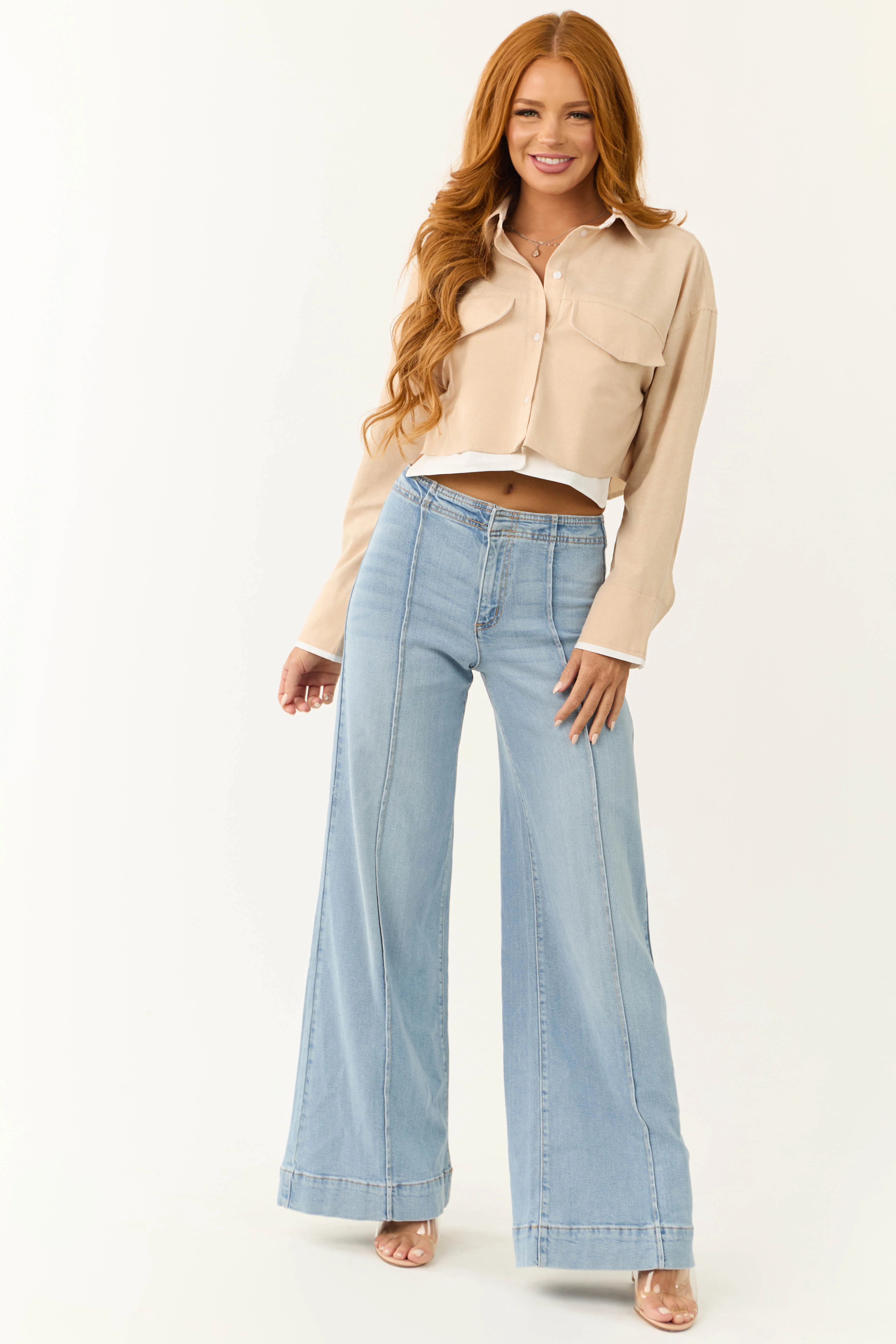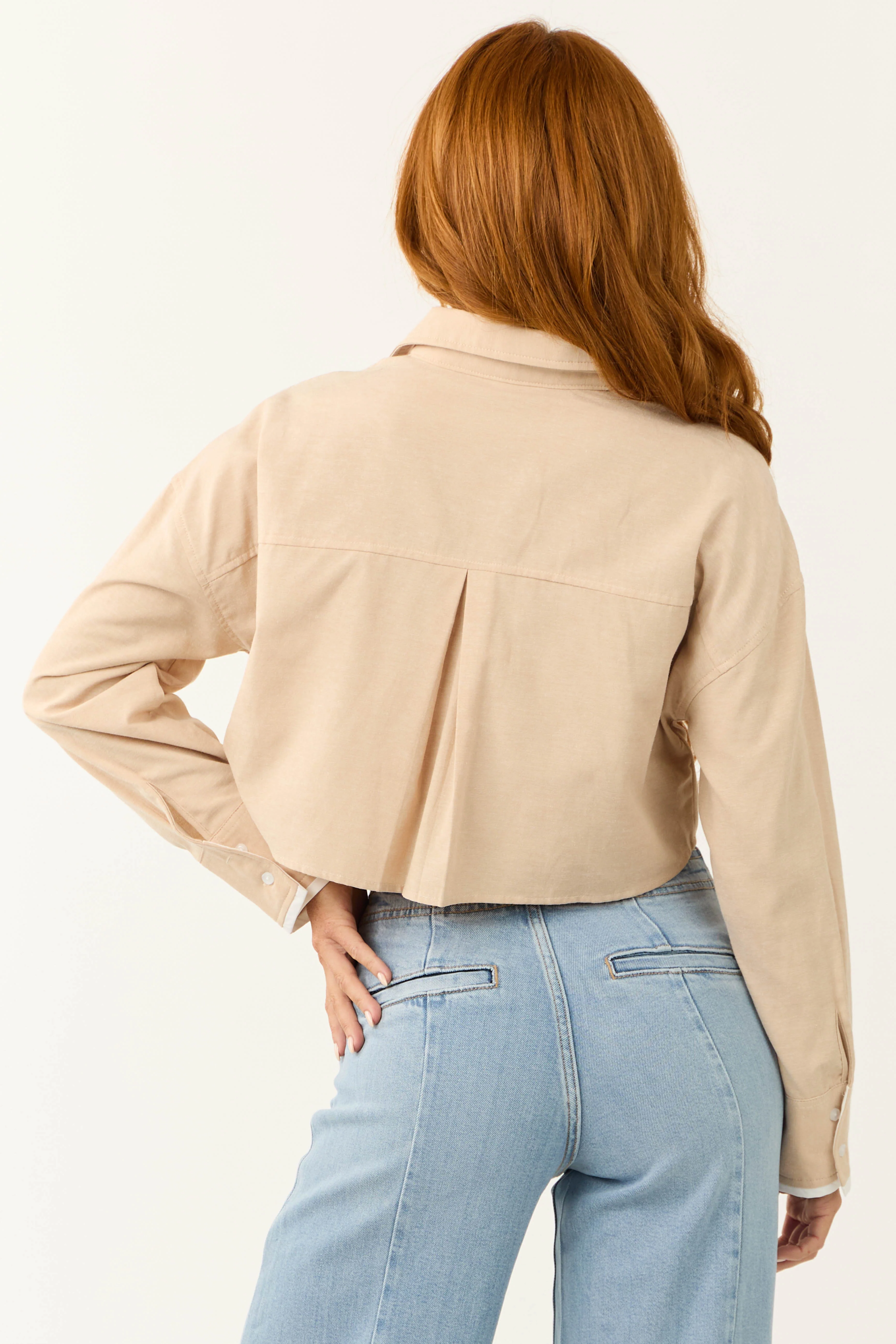 Sand Long Sleeve Button Down Cropped Top