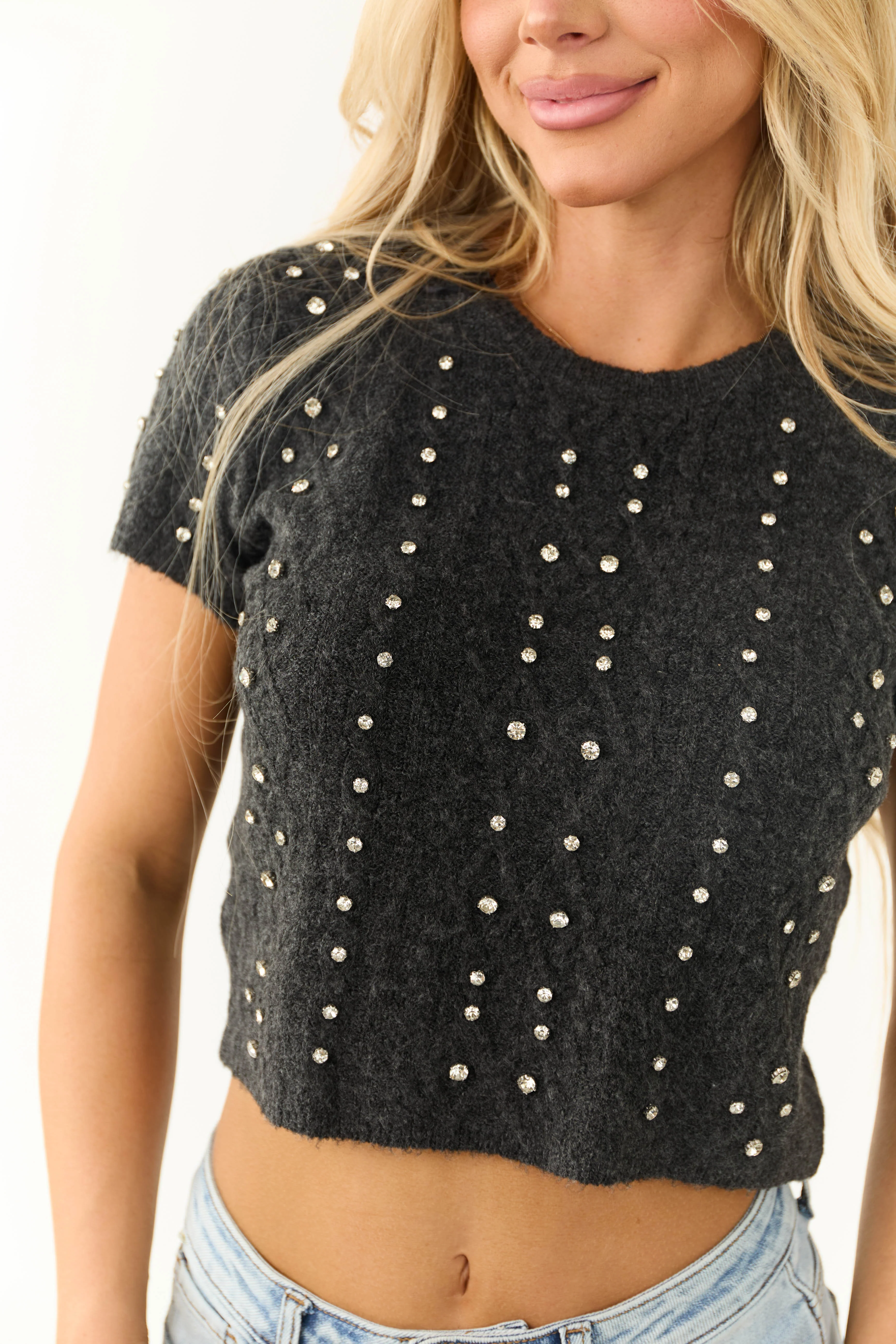 Charcoal Rhinestone Detail Crop Sweater Top