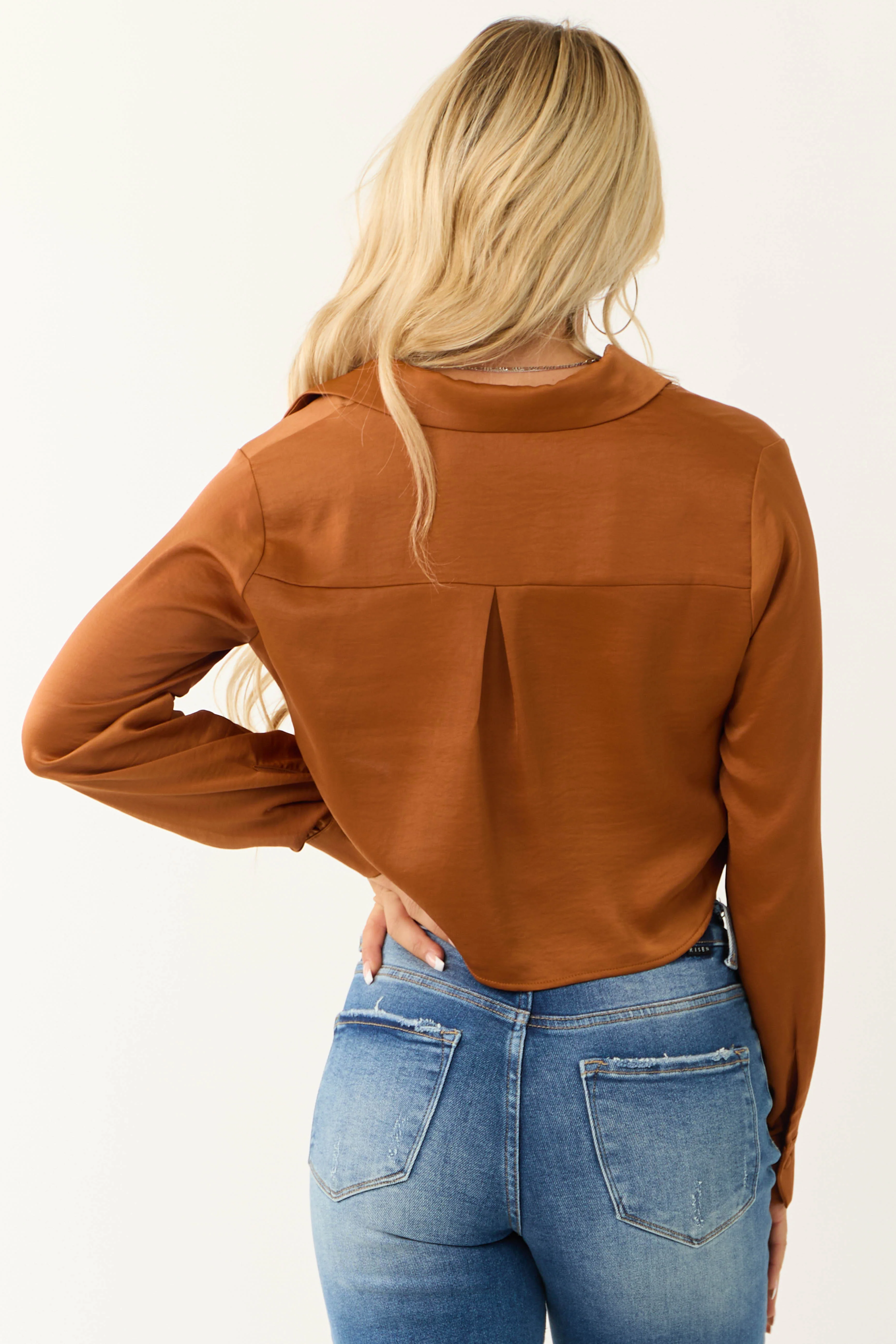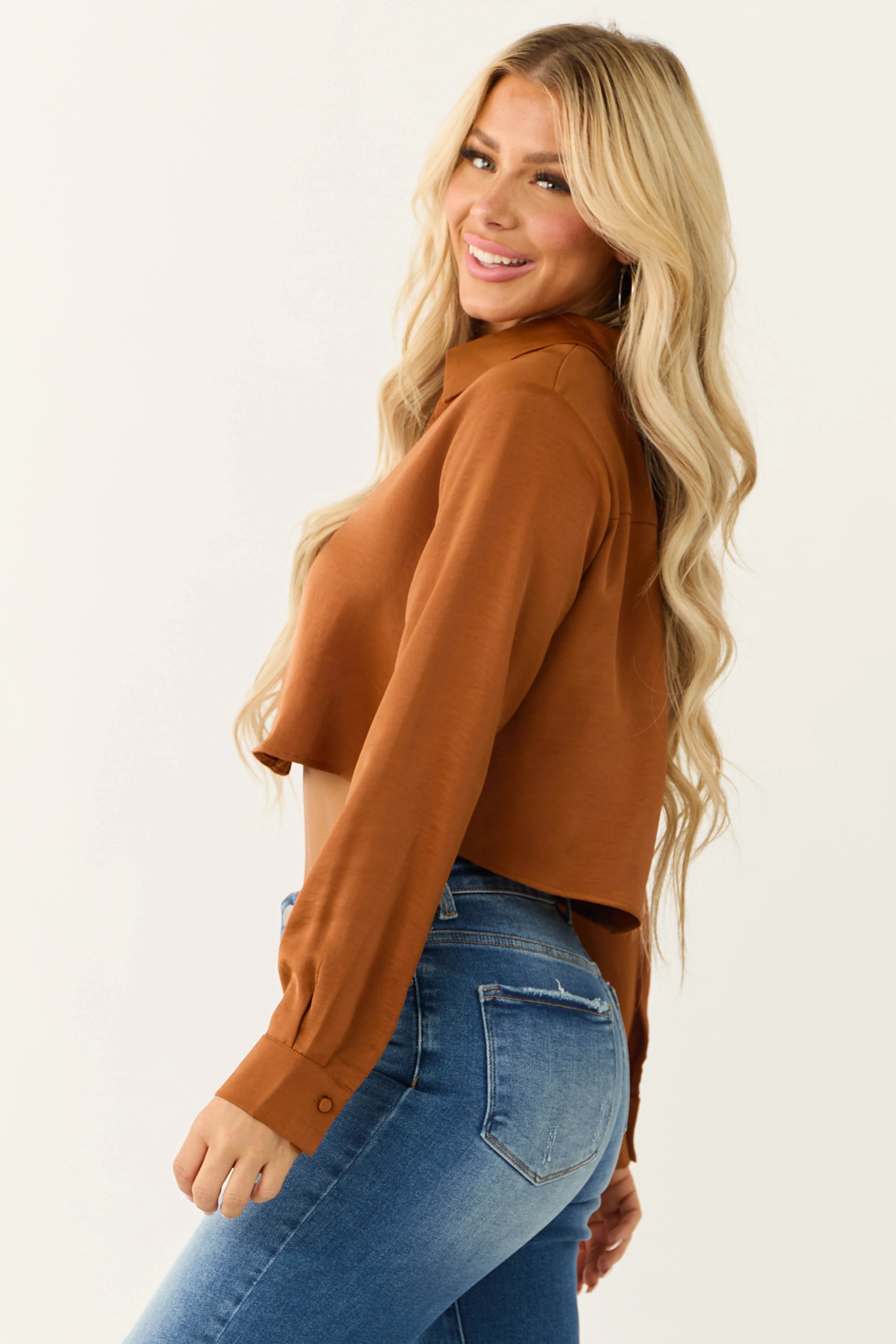 Spice Button Up Cropped Silky Long Sleeve Top