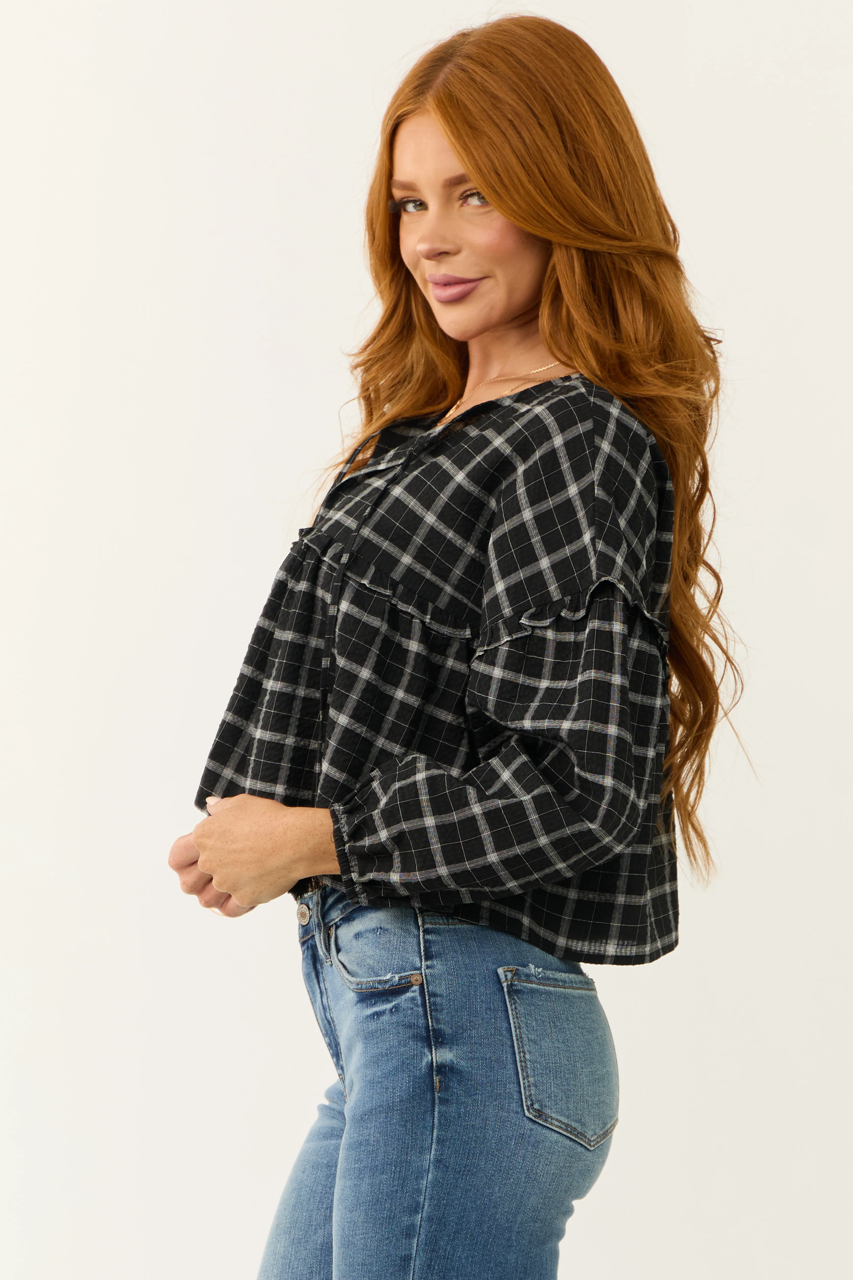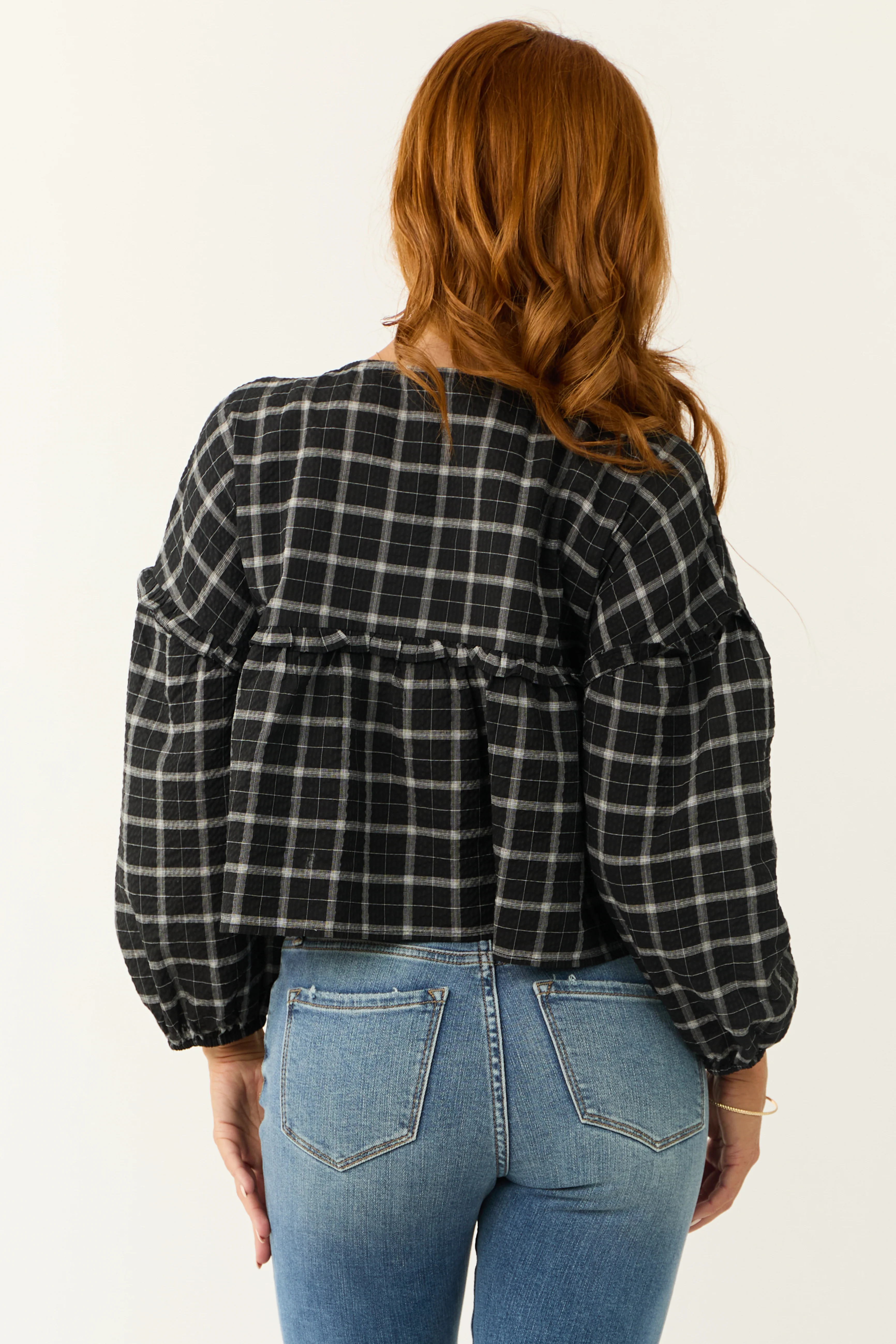Black and Off White Plaid Long Sleeve Top