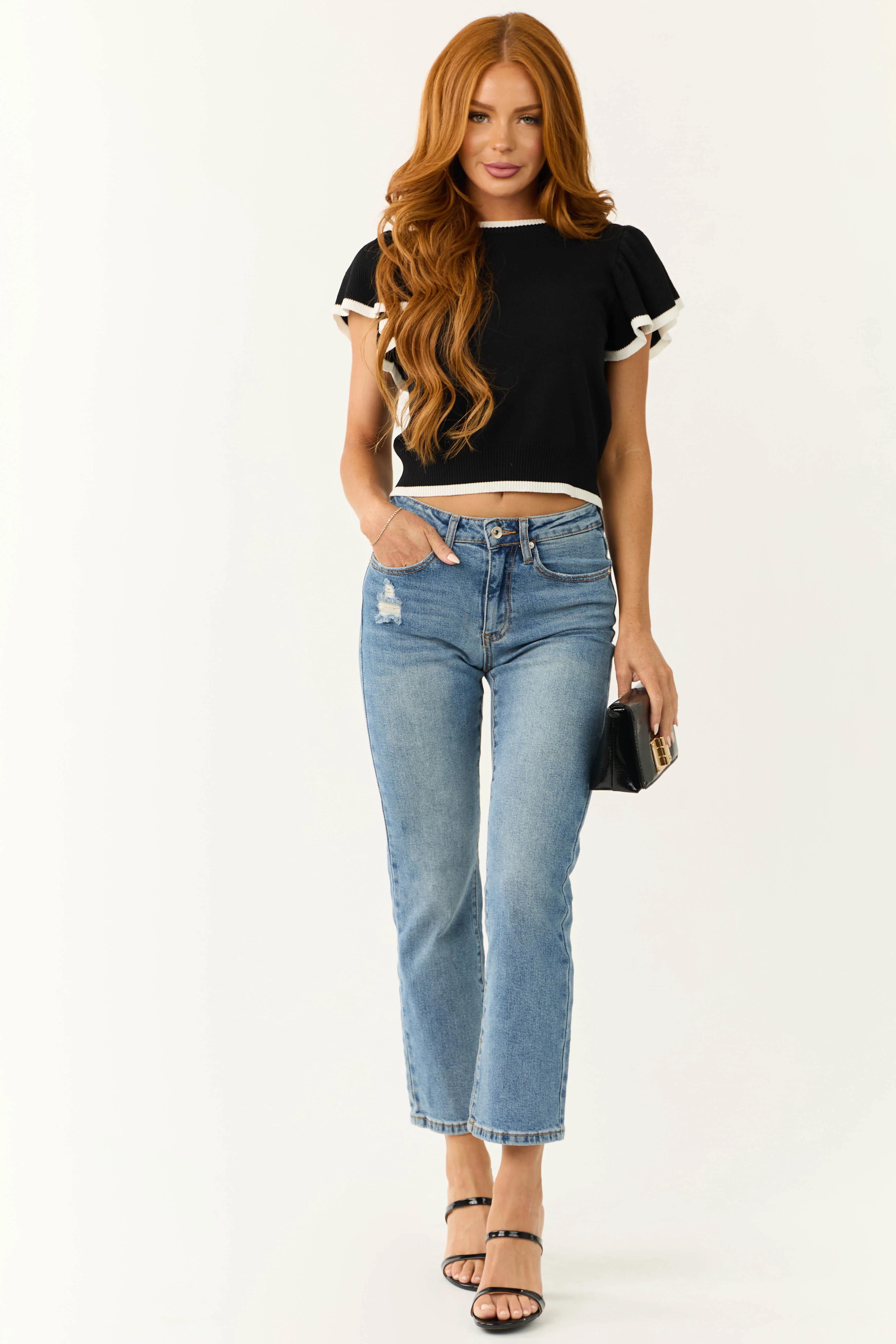 Black Contrast Pattern Ruffle Sleeve Knit Top