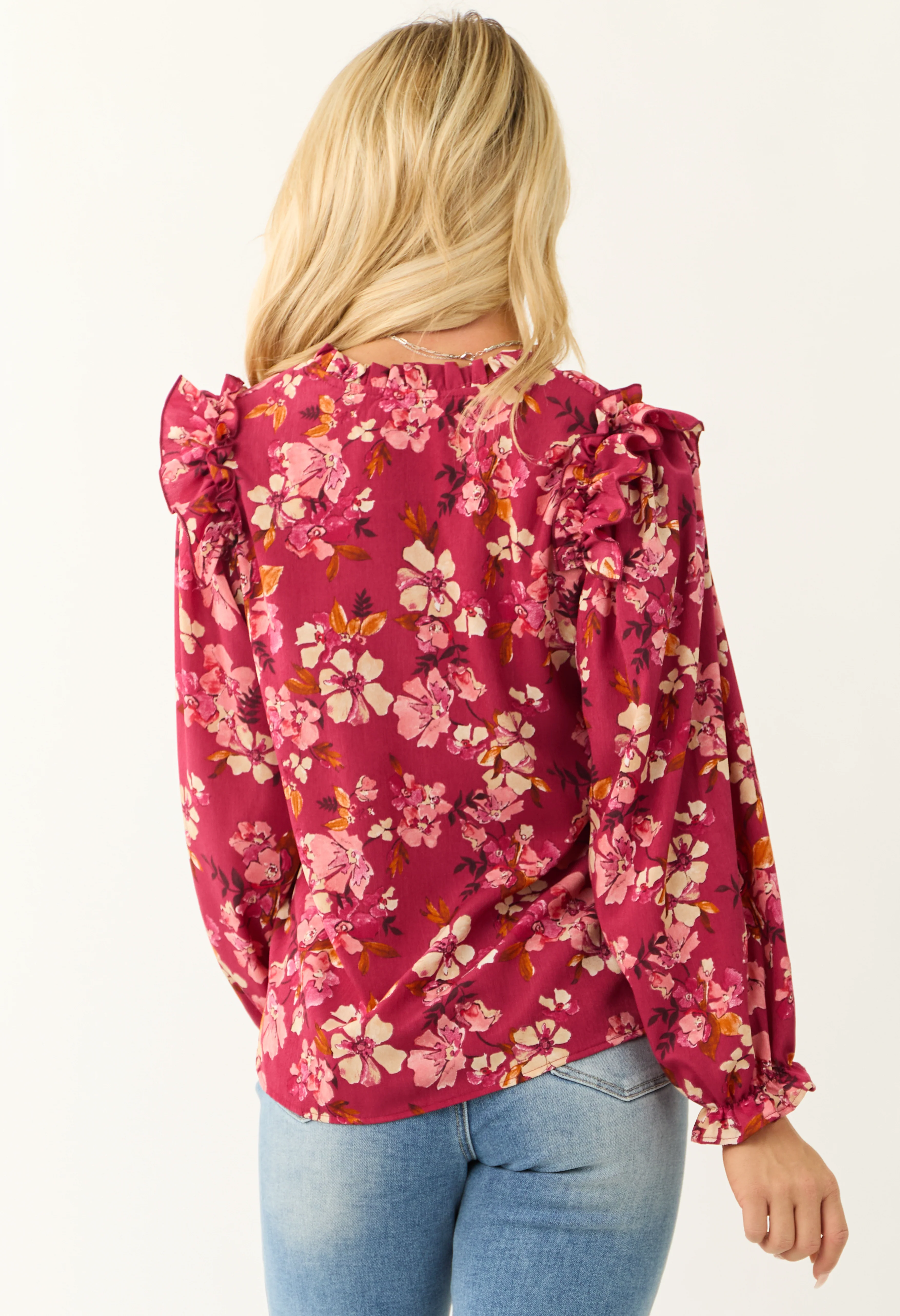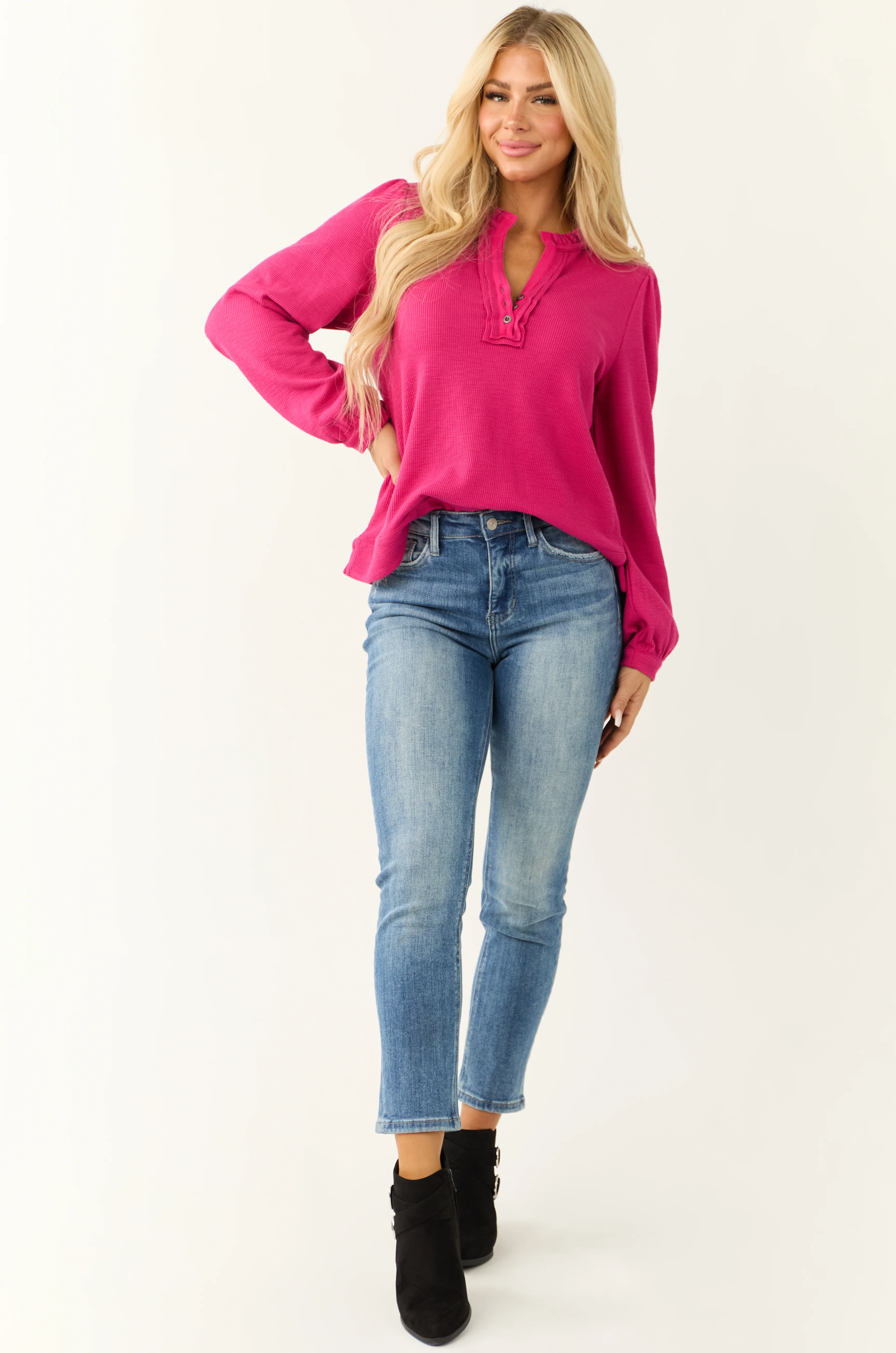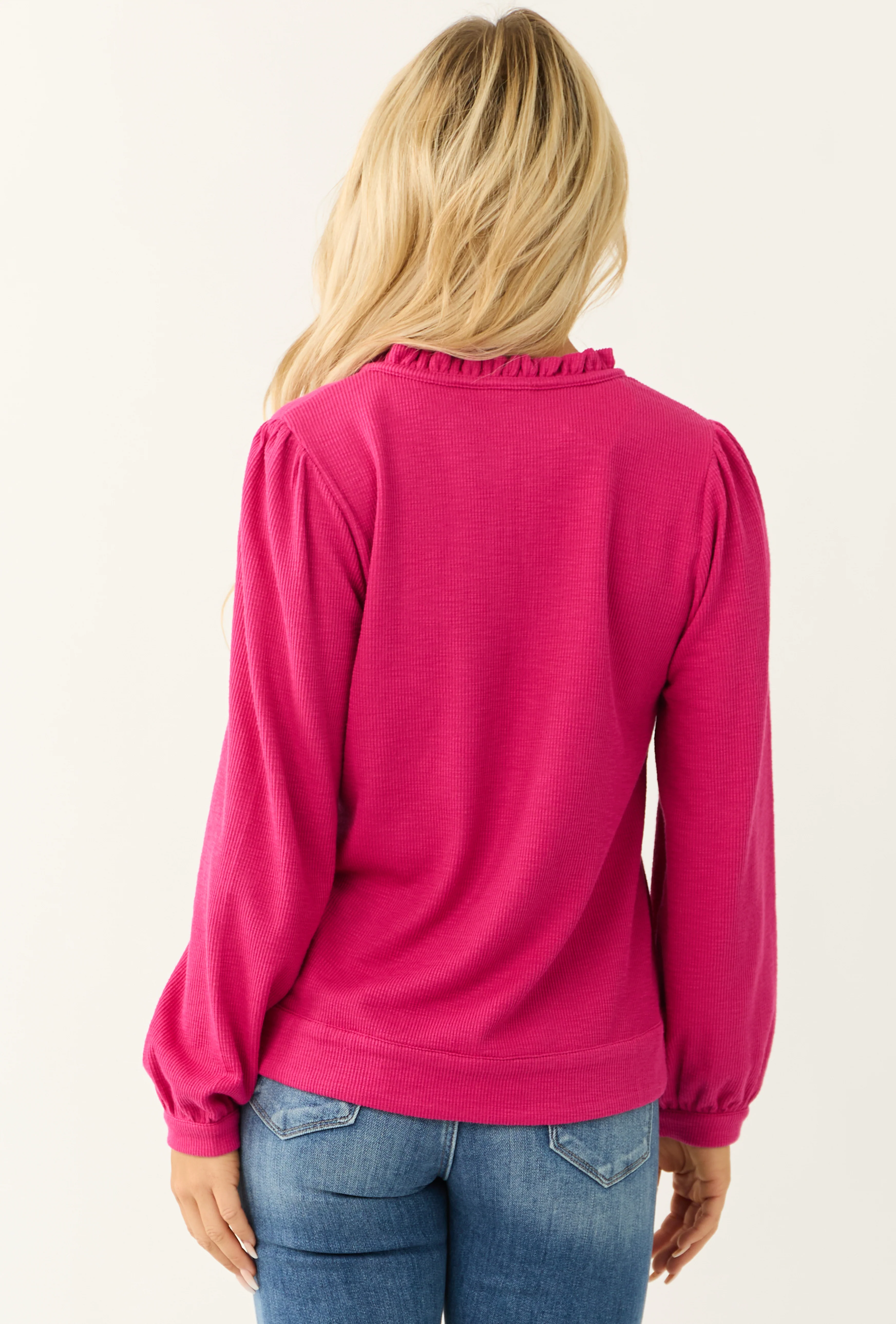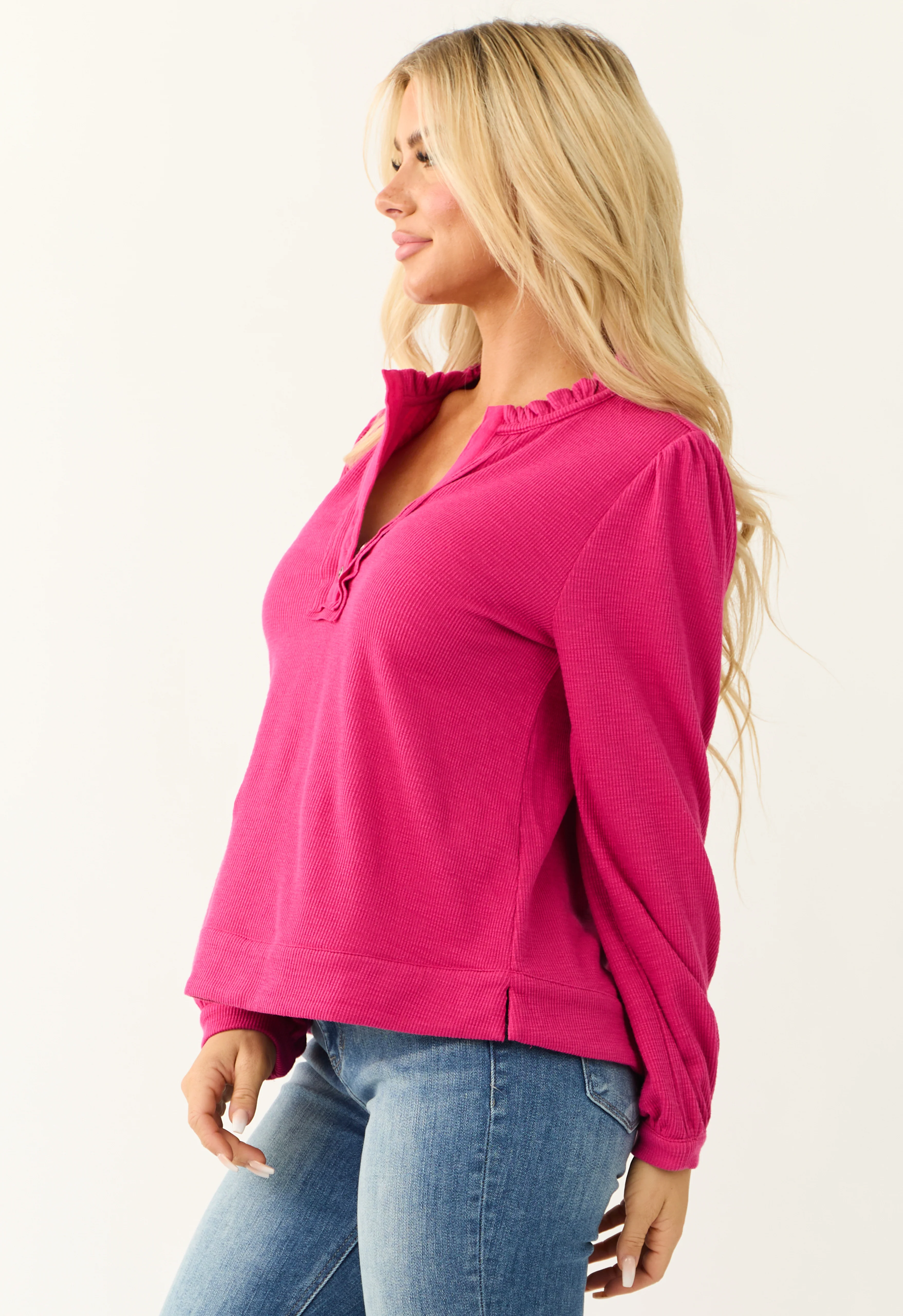Raspberry Long Sleeve Frilled Henley Neck Top