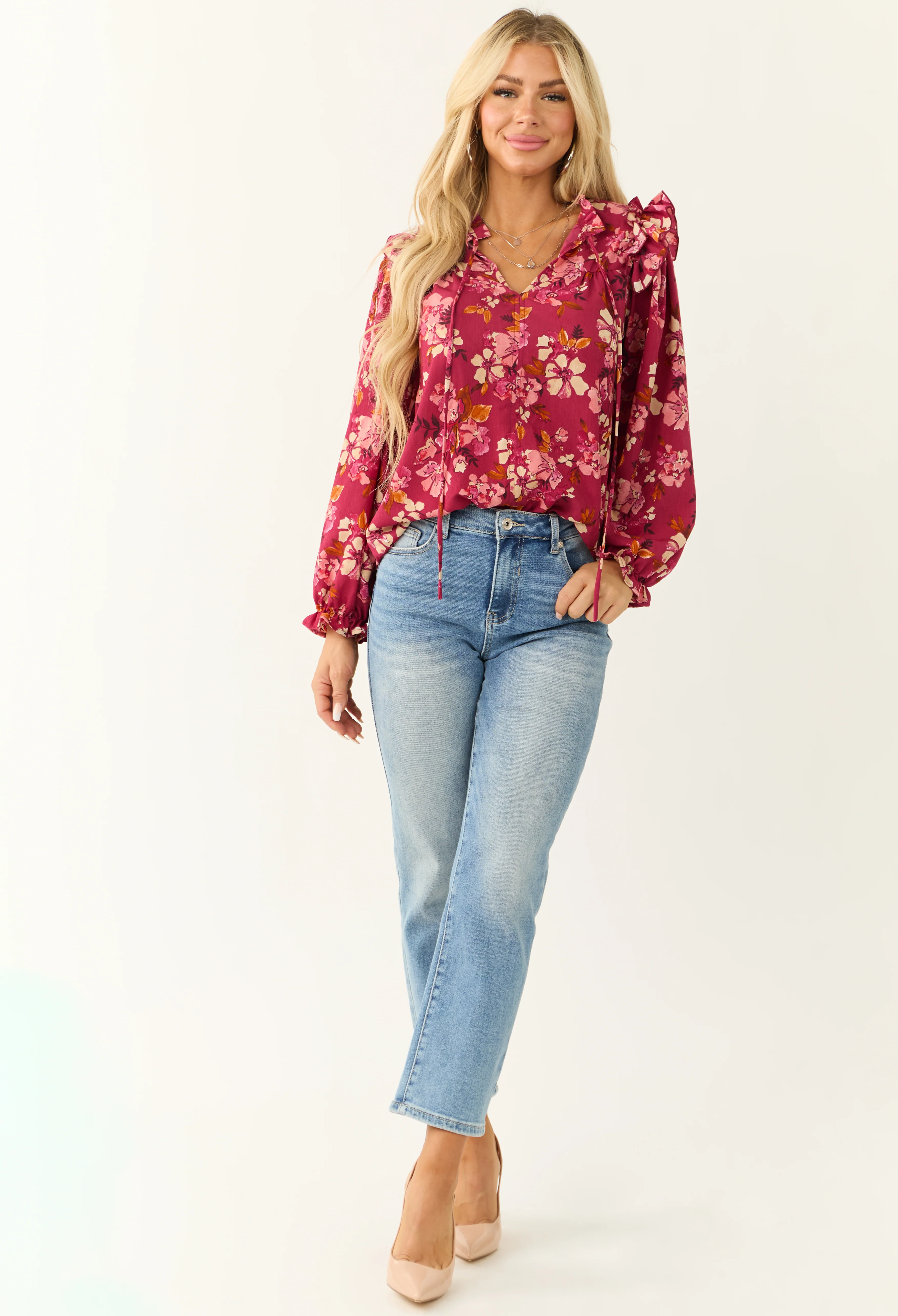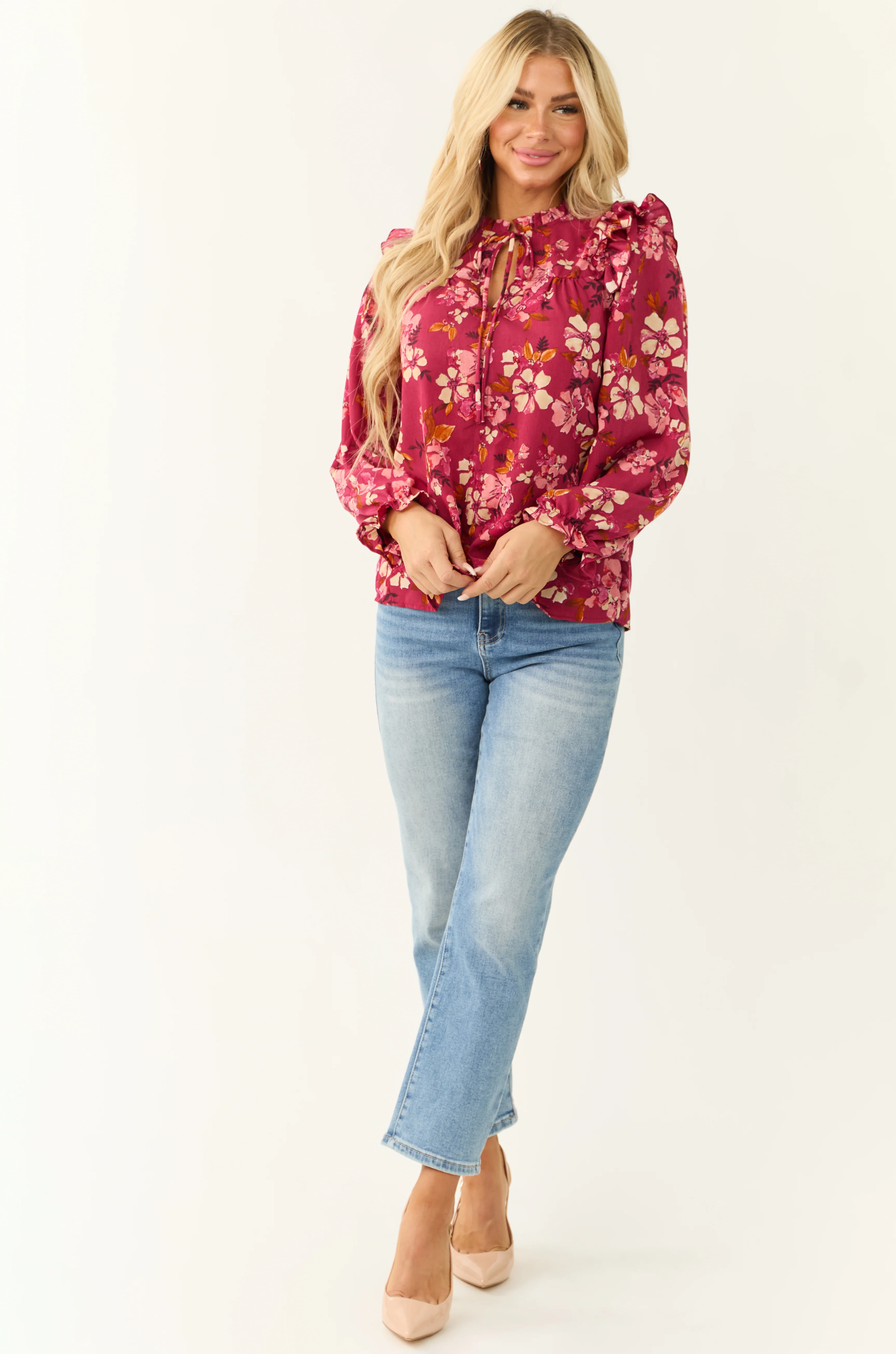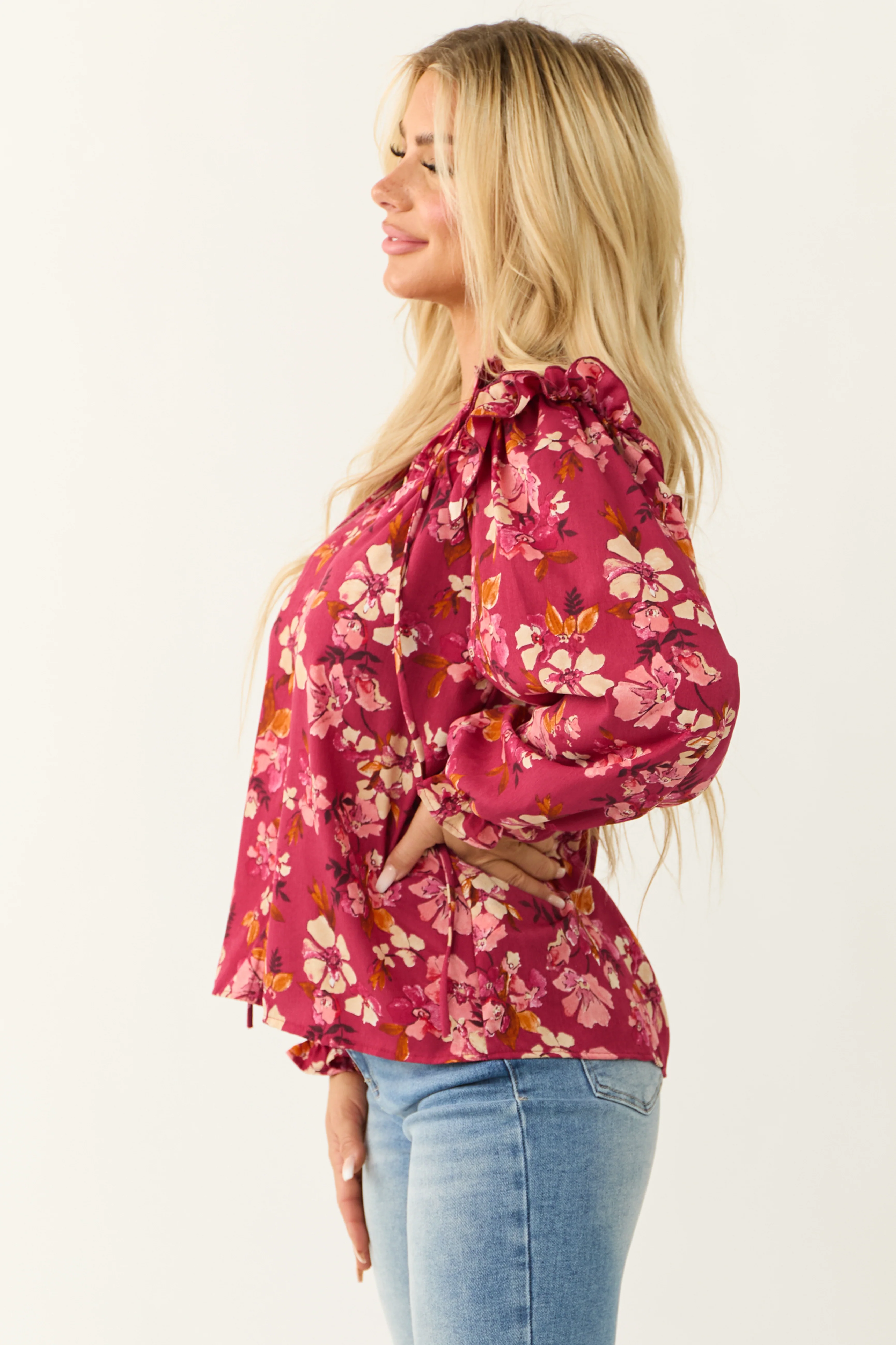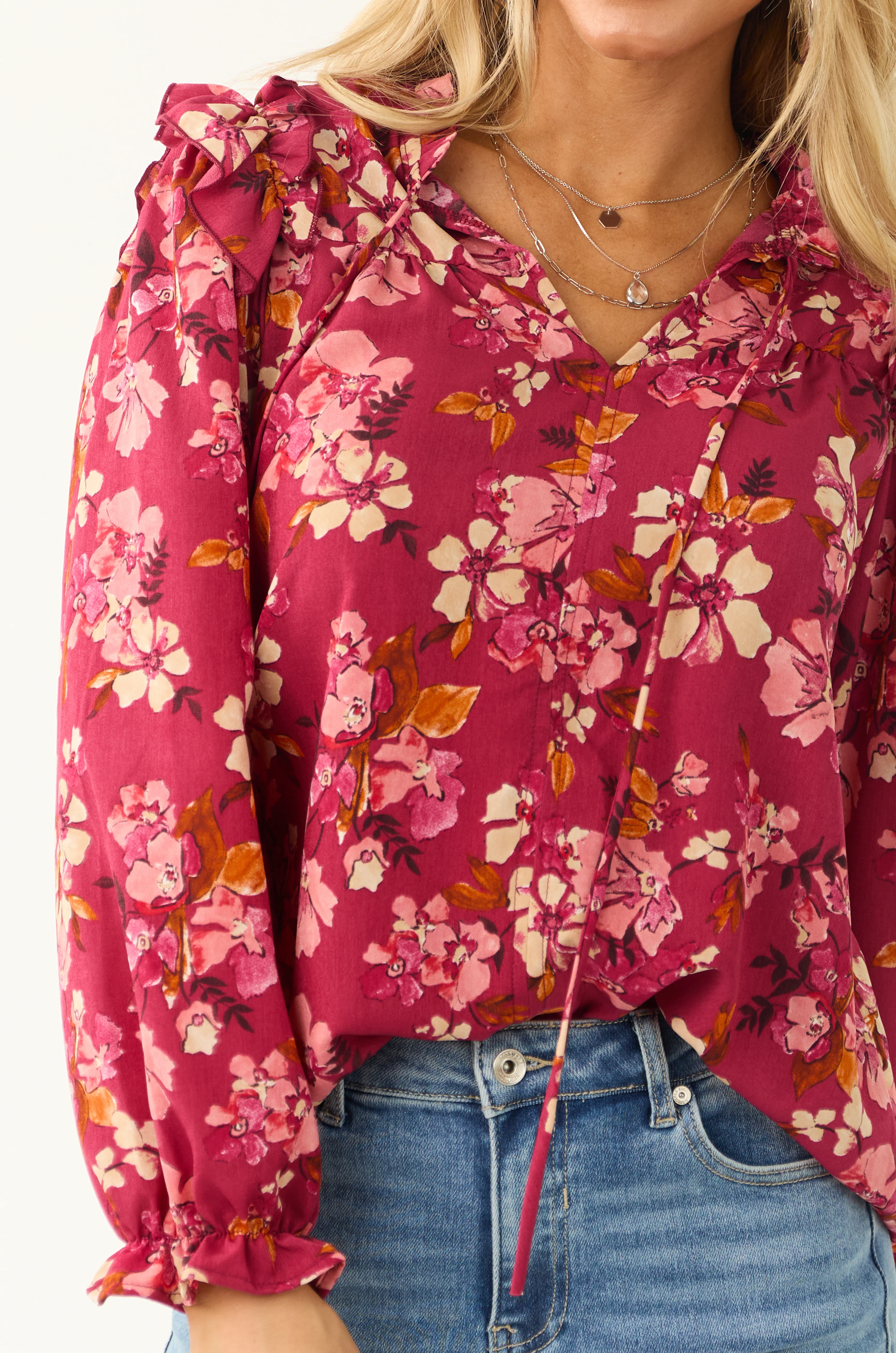 Raspberry Long Sleeve Frilled Henley Neck Top
