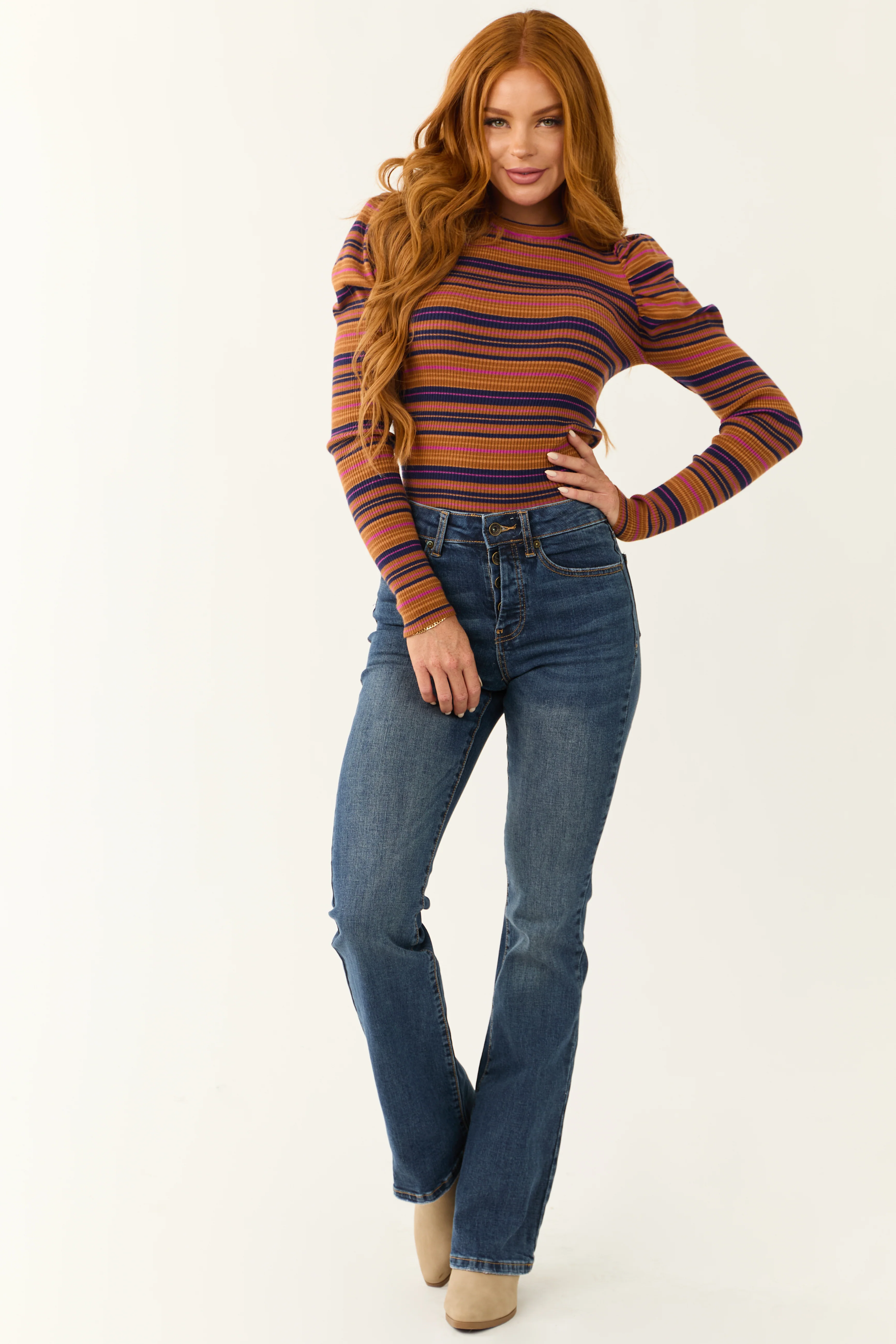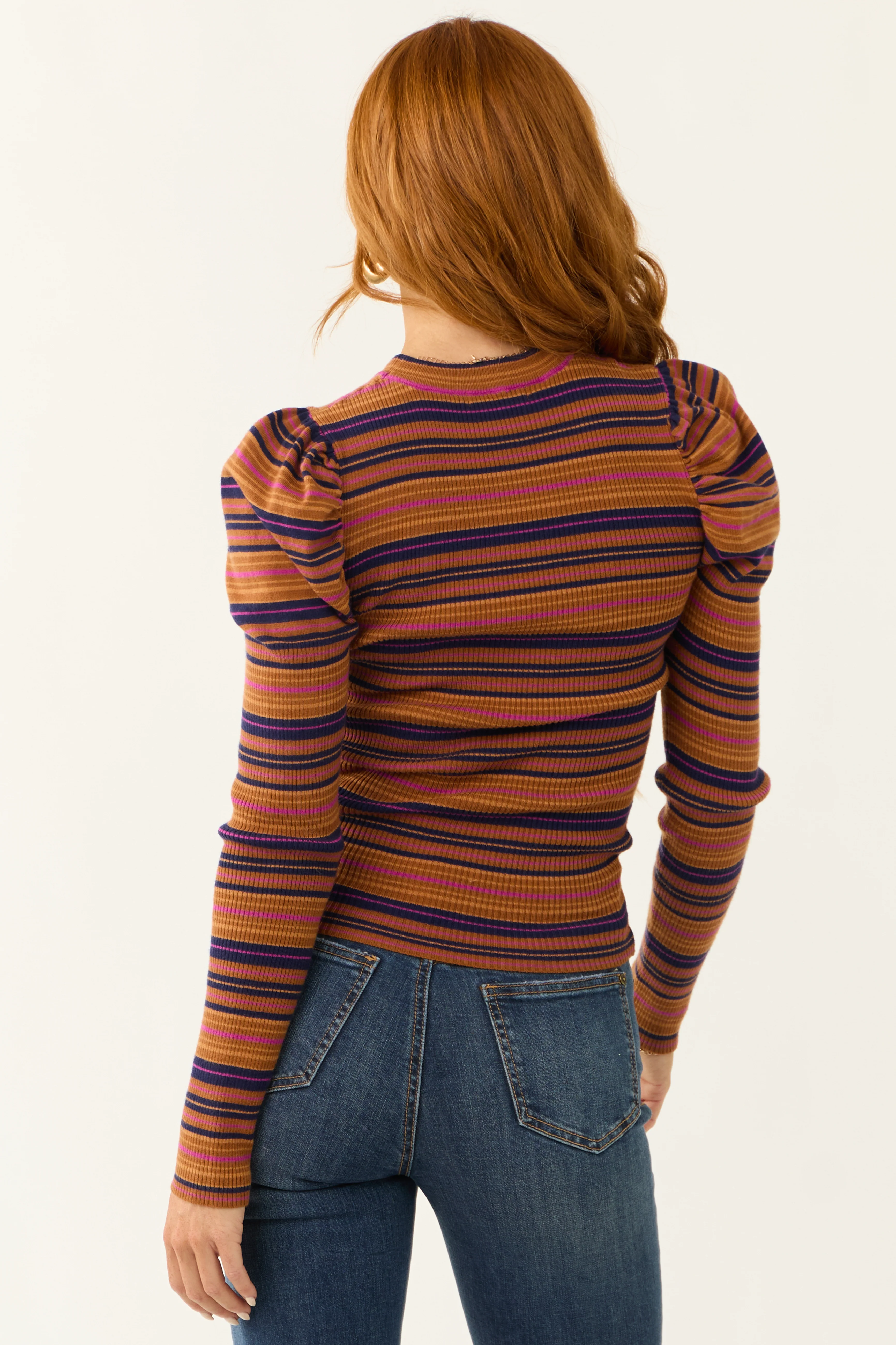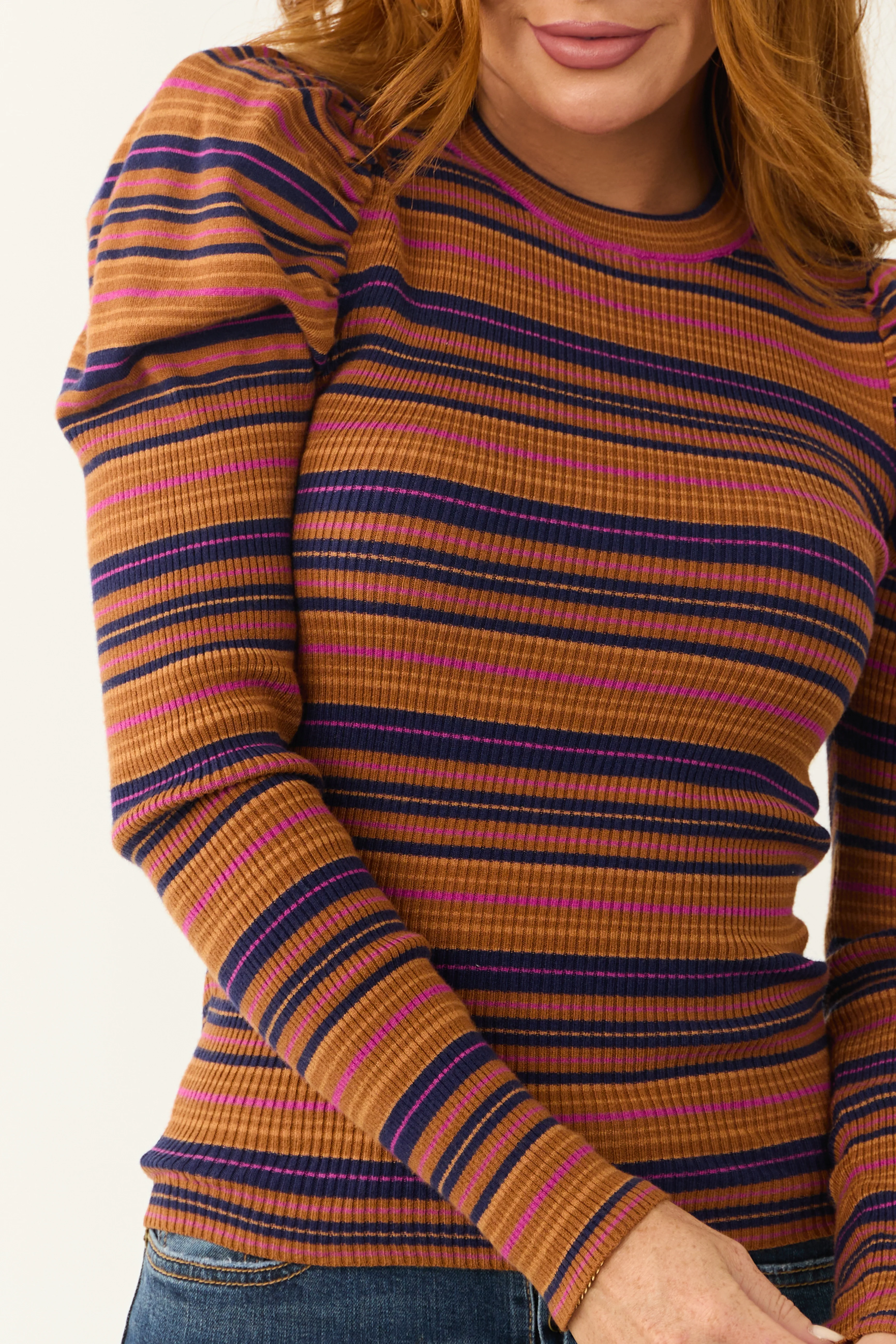 Flying Tomato Cognac Striped Puff Long Sleeve Shirt