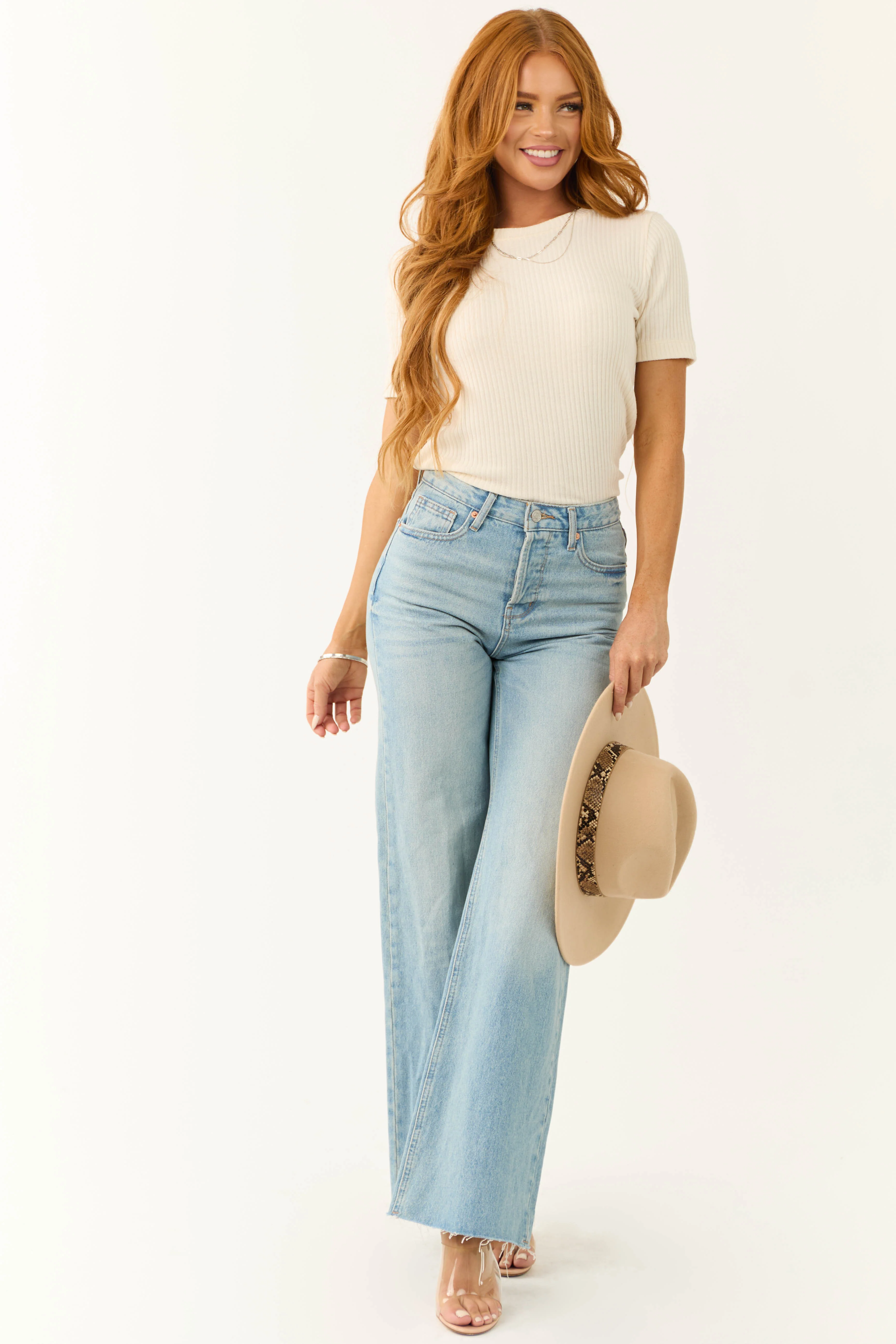 Almond Short Sleeve Textured Ribbed Knit Top