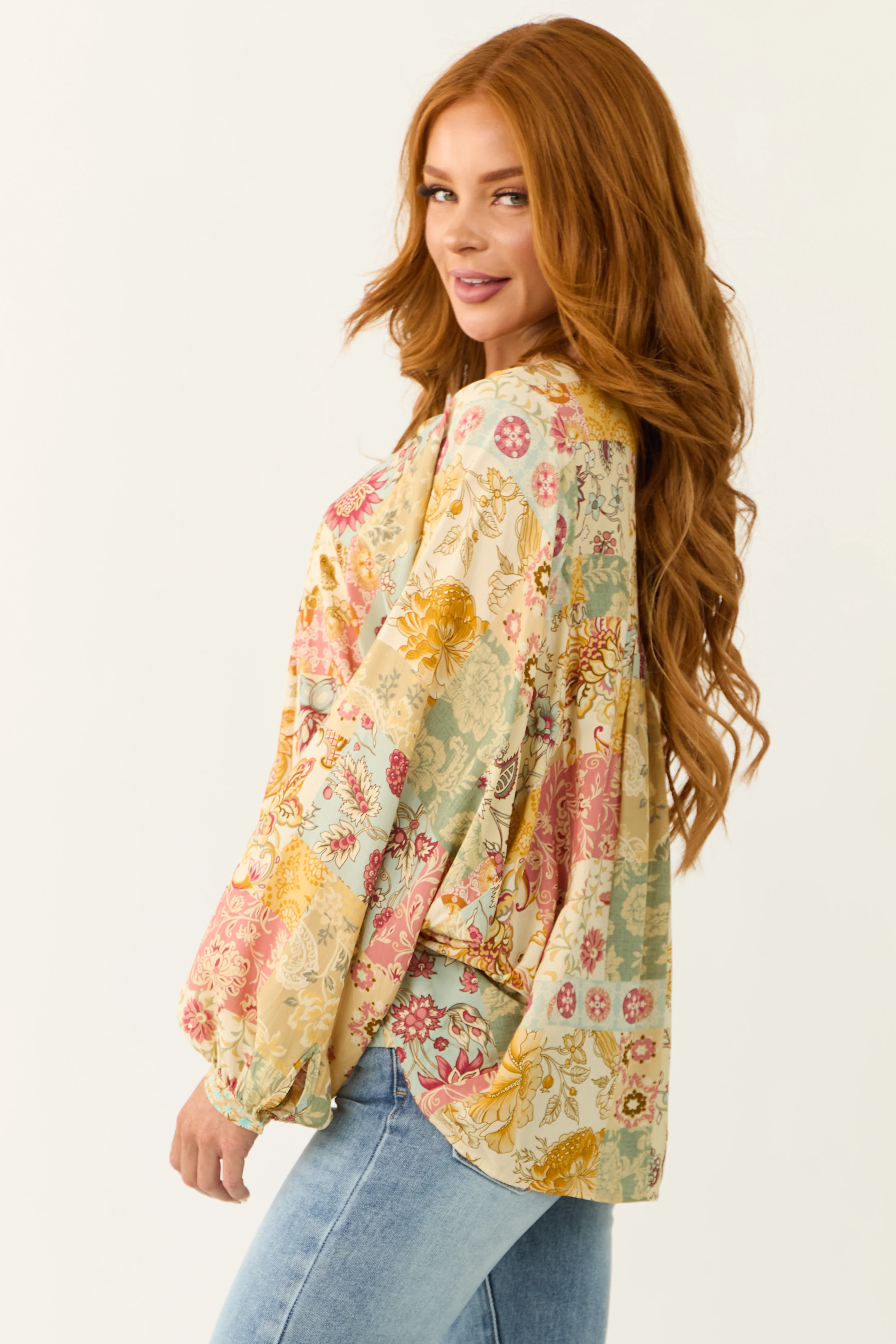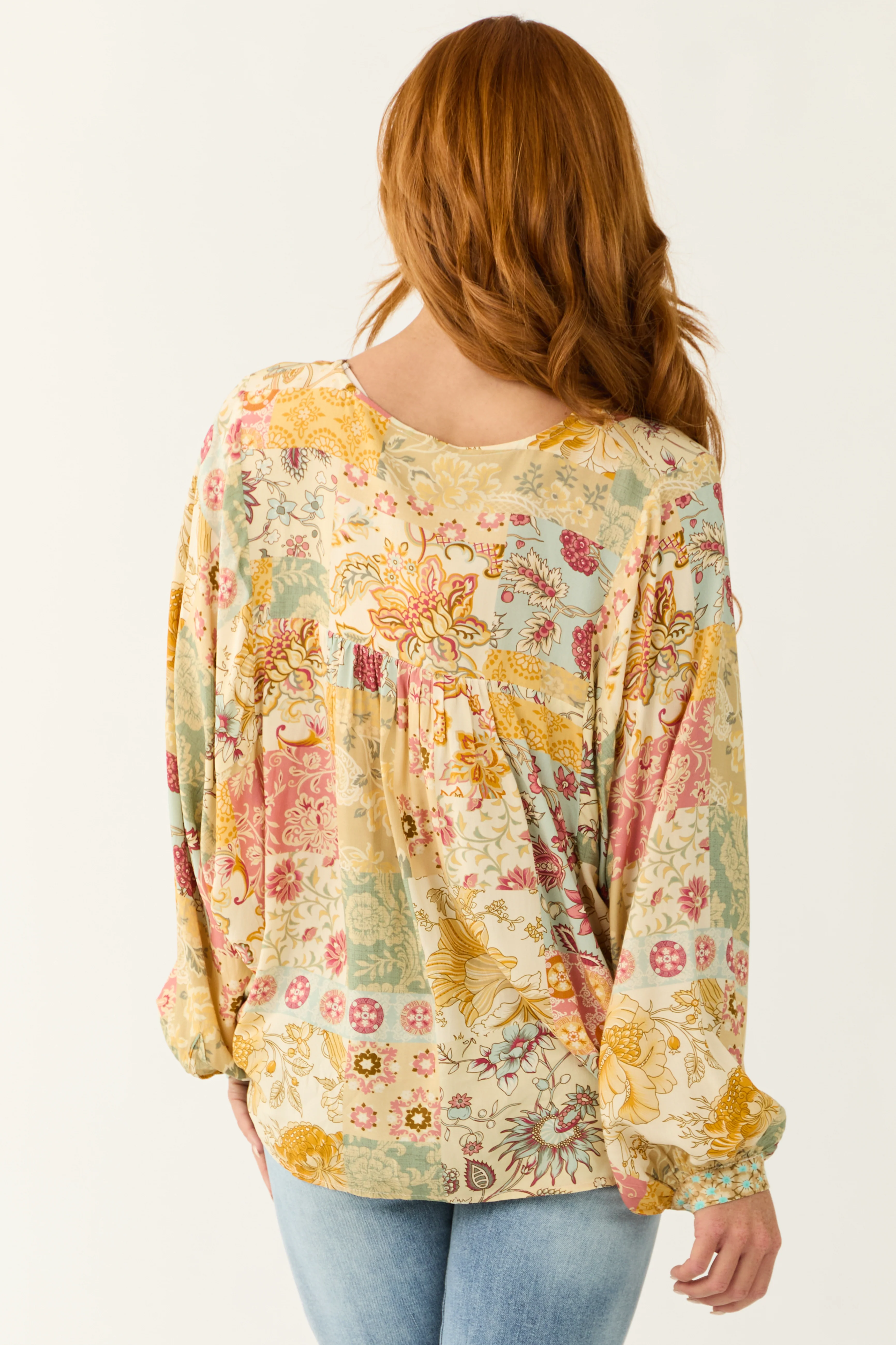 Cream Floral Patchwork Print Long Sleeve Top
