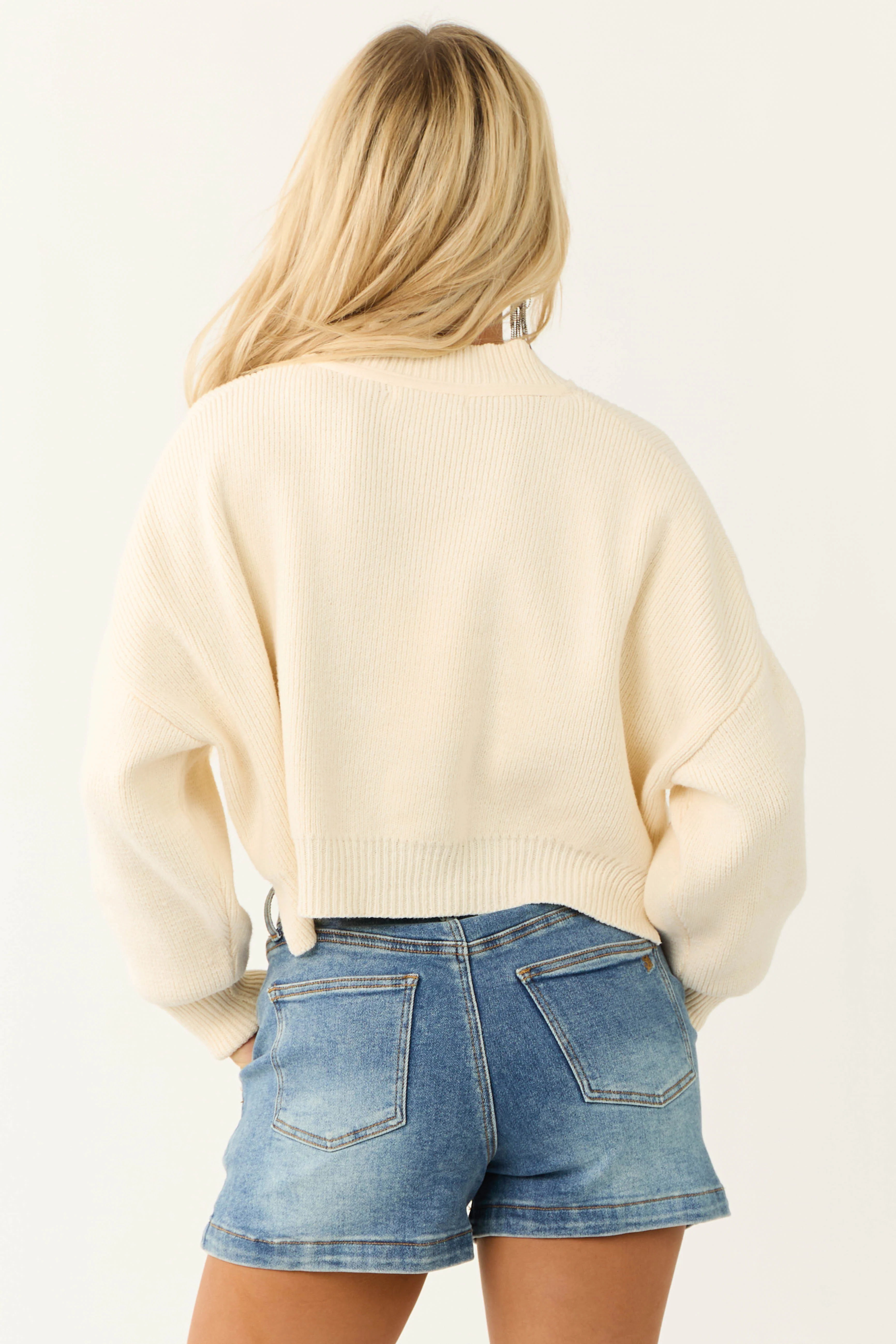 Cream Cropped Puff Long Sleeve Knit Sweater