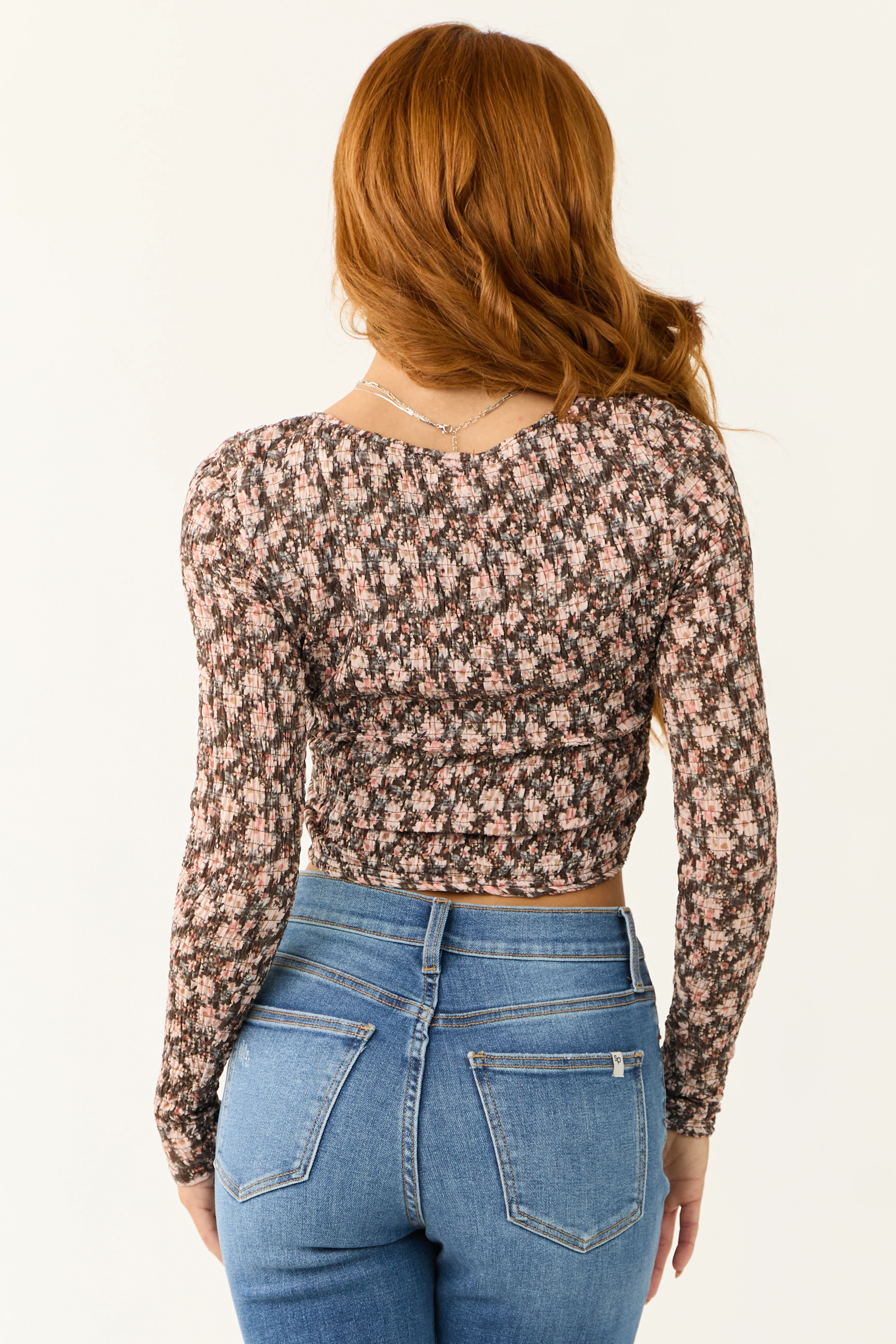 Coffee Floral Print Smocked Ruched Crop Top