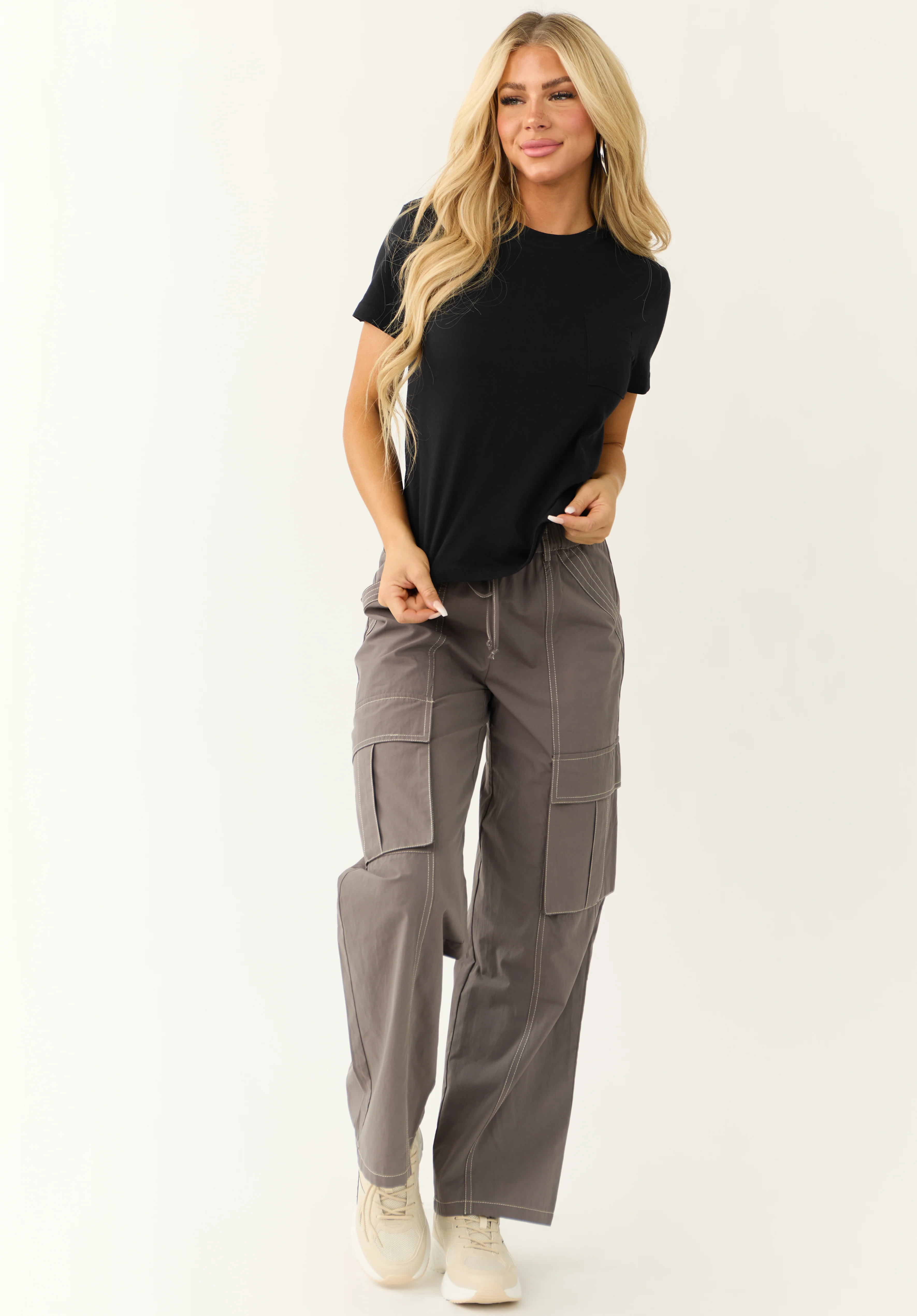 Charcoal V Neck Chest Pocket Short Sleeve Top